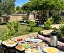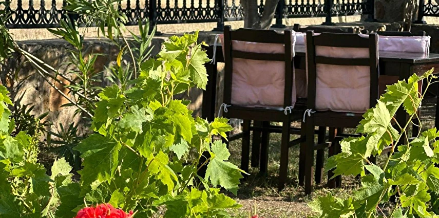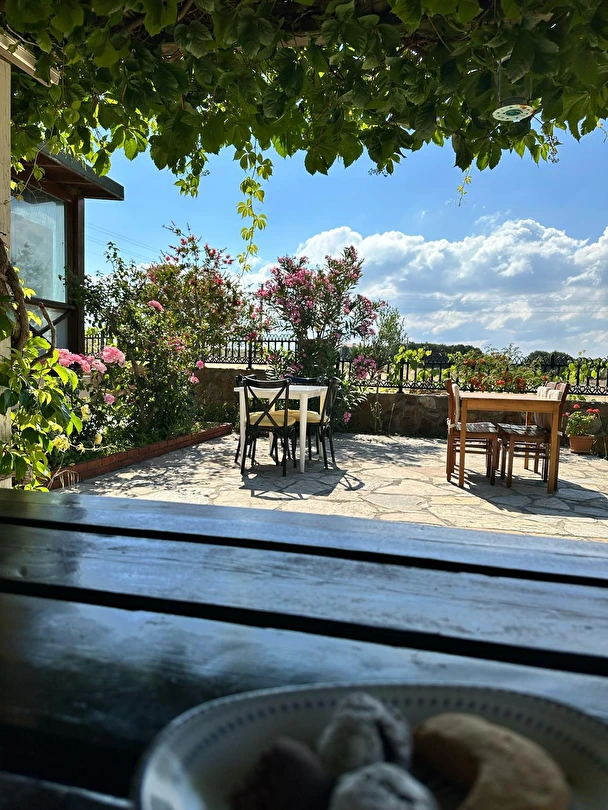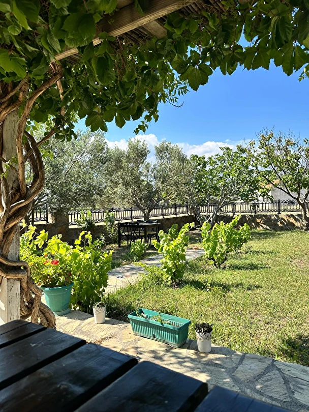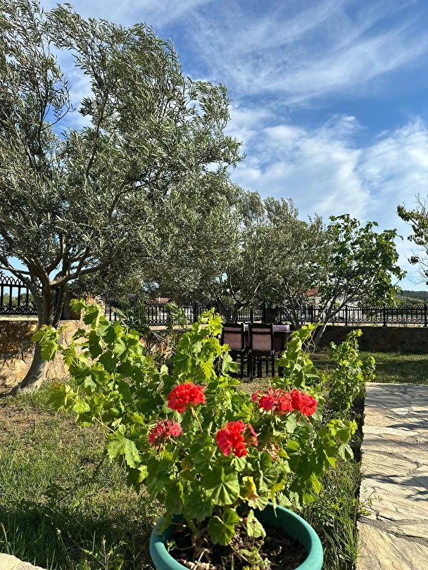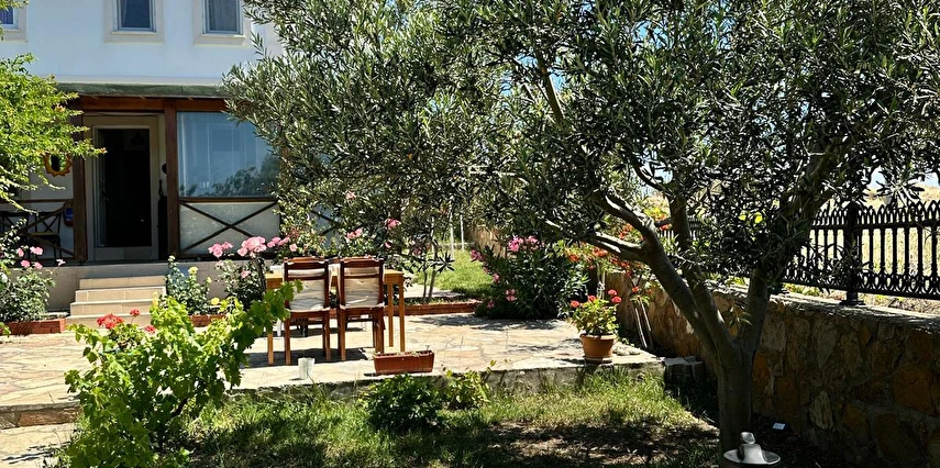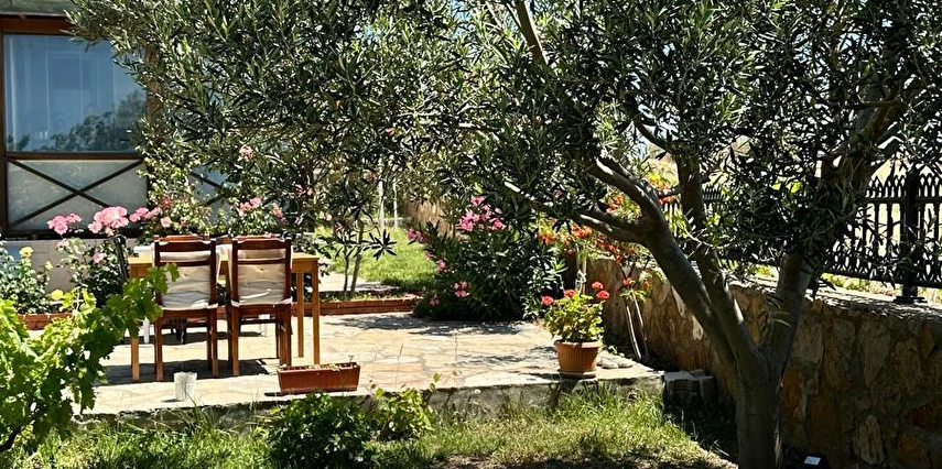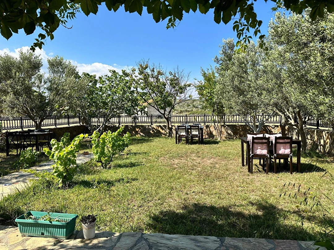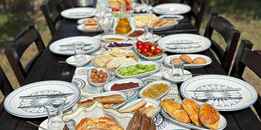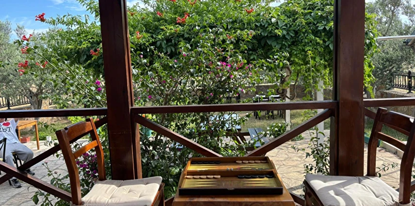 Her sabah servis edilen ücretsiz yerel tarz kahvaltı, zeytin ağaçları altında açık havada keyifle tadabileceğiniz lezzetli seçenekler sunar. Kahvaltı saatleri genellikle sabah 9:00–11:00 arasındadır.