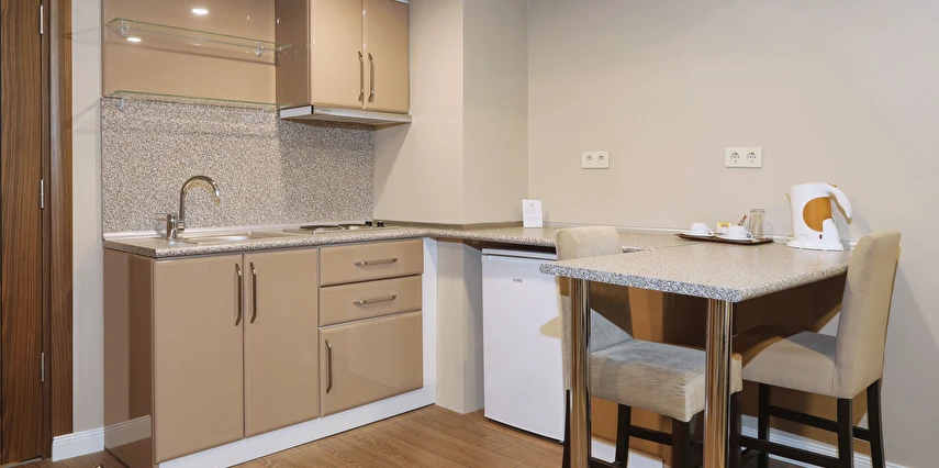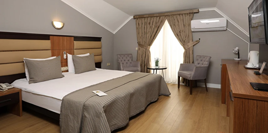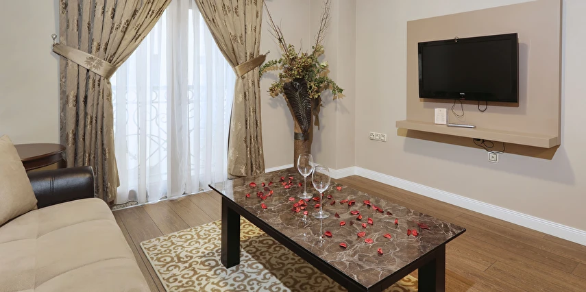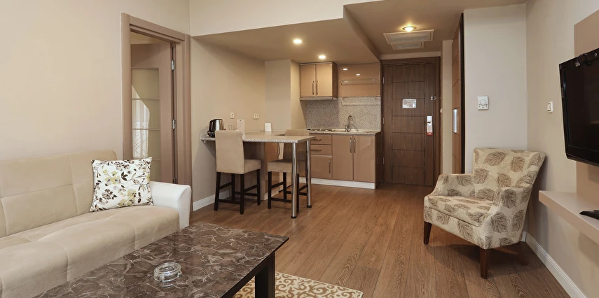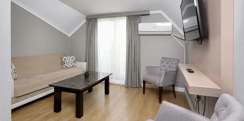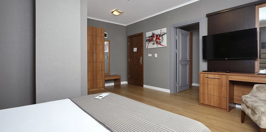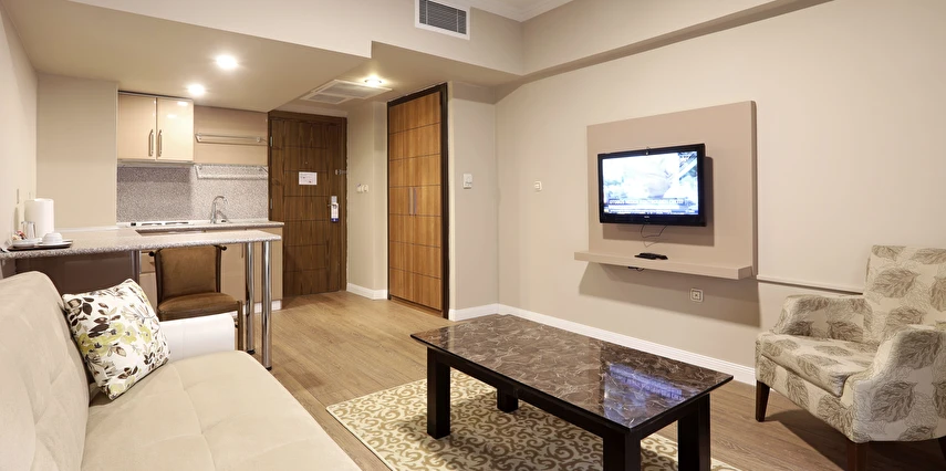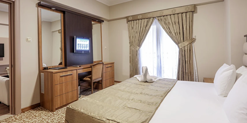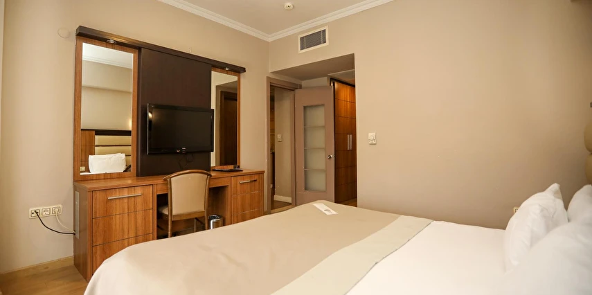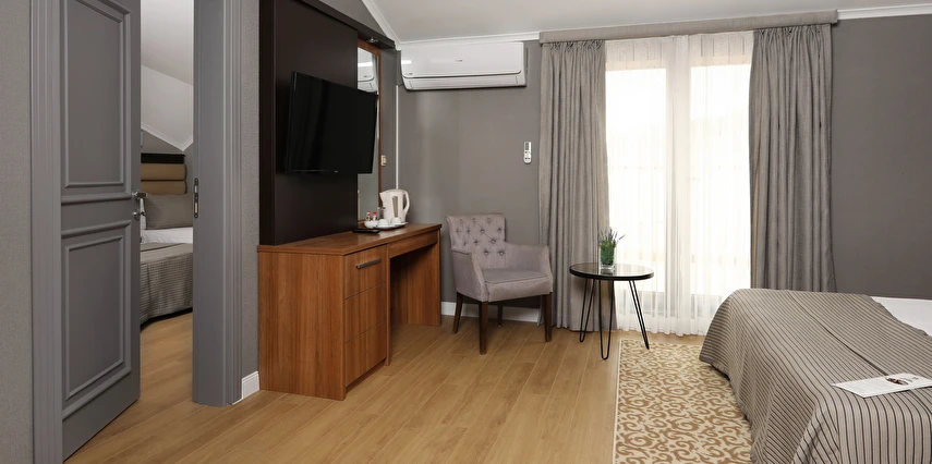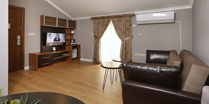 Geniş ailelere konforlu bir konaklama deneyimi kazandırmanın yanı sıra Suit odalarımızda, uzun konaklamalı misafirlerimizin de tercih edebileceği mutfaklı oturma odaları bulunmaktadır. Tüm odalarda uluslararası uydu yayınları mevcut büyük ekran LED TV, Split Klima, Fiber Hızlı internet, Merkezi Isıtma, Saç Kurutma Makinesi, Duşakabin, Mini Bar, Direkt Telefon ve Kablosuz İnternet Bağlantısı bulunmaktadır.