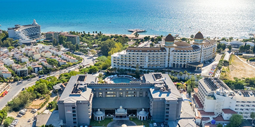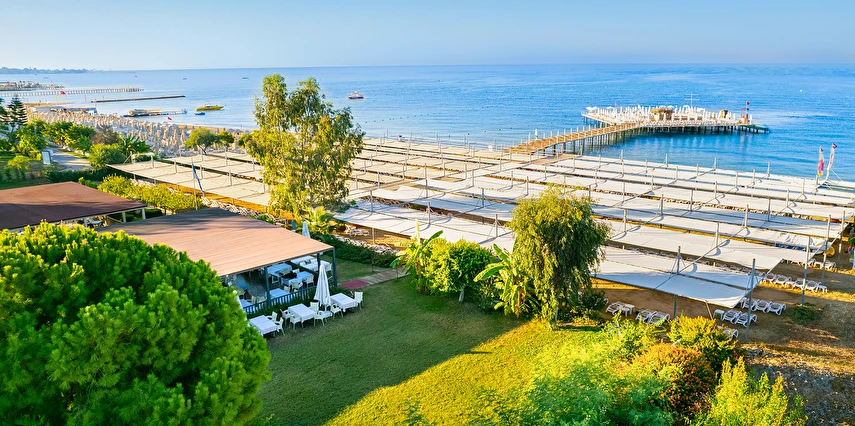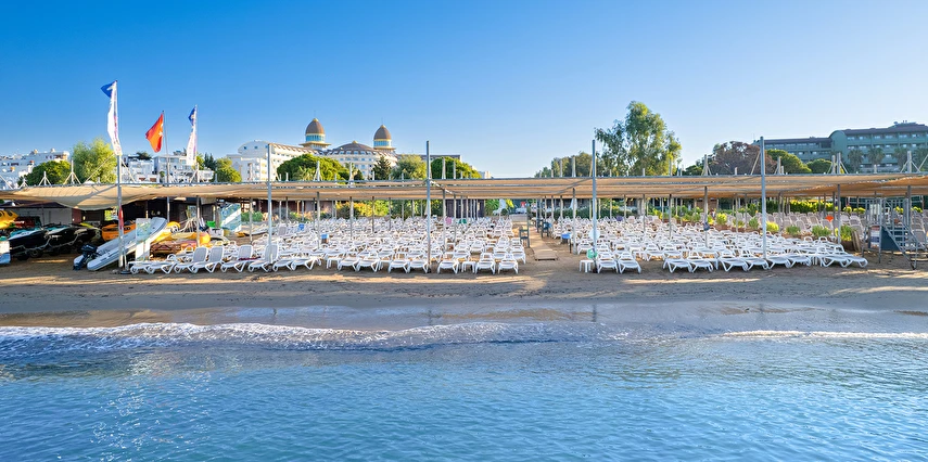 Plaja geçiş, tesisin içinden sağlanmakta olup, yaklaşık 200 metrelik trafiğe kapalı özel sahil yolu üzerinden shuttle ile ya da yürüyerek ulaşım sağlanabilmektedir
