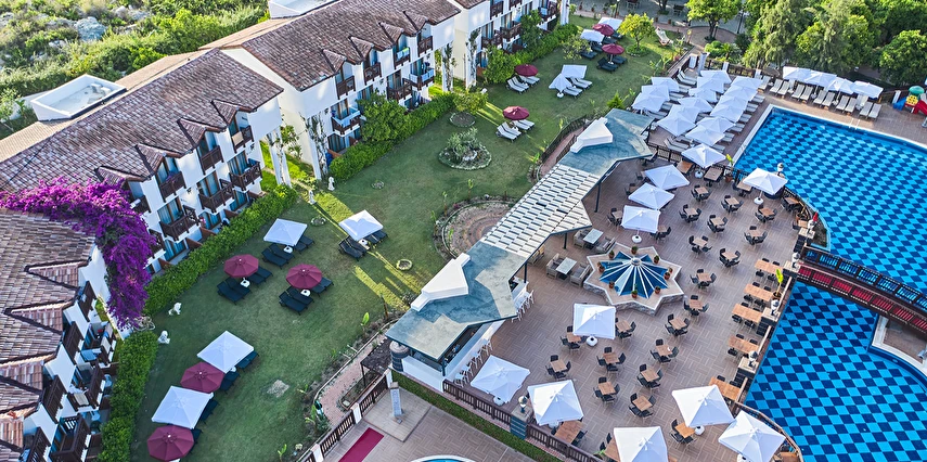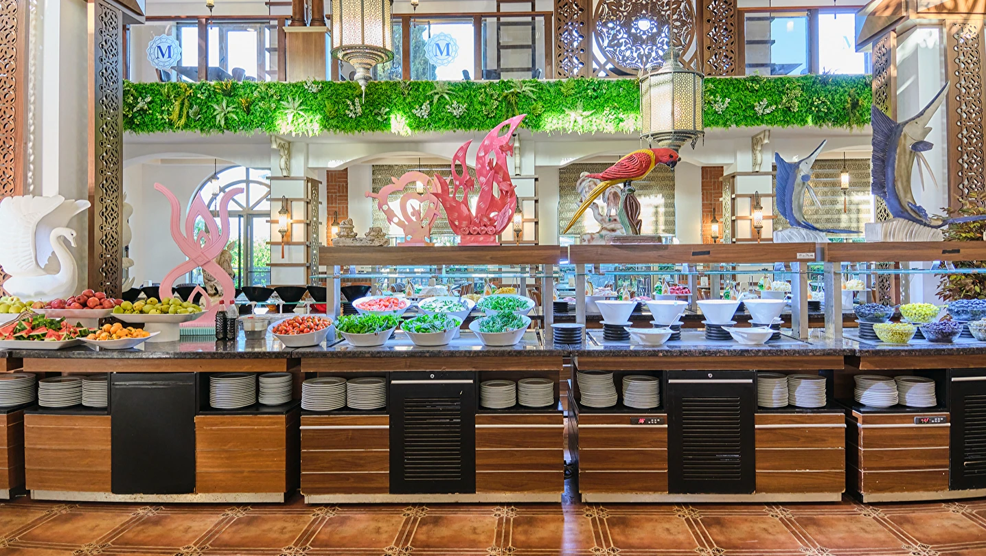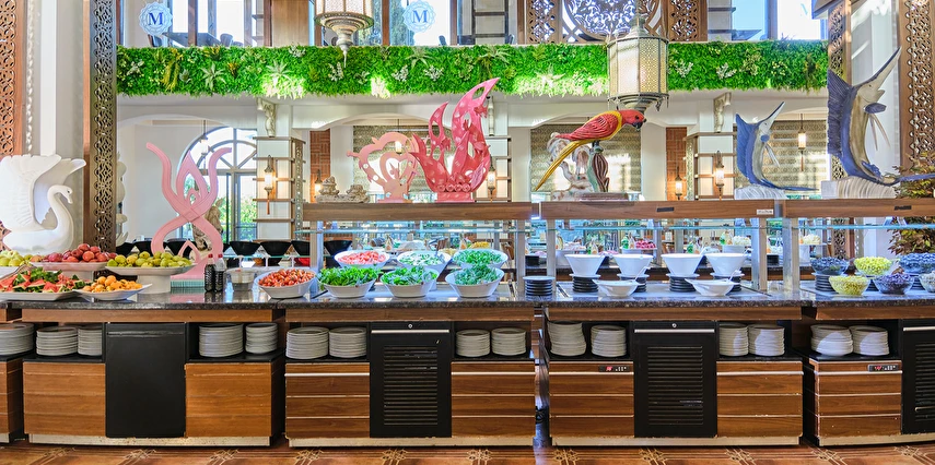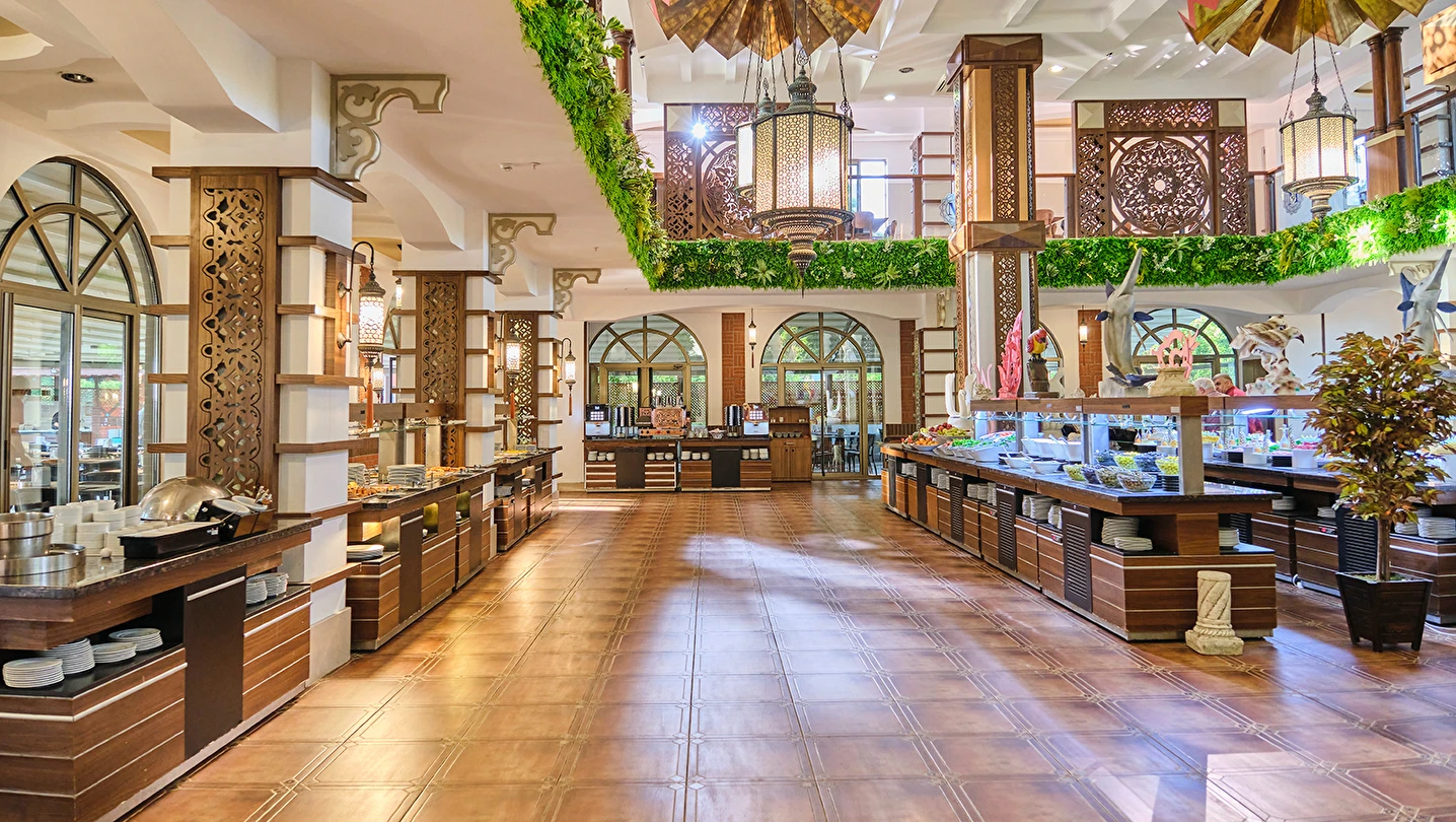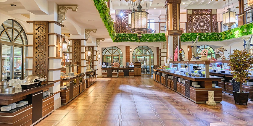 Sabah kahvaltısı, öğle ve akşam yemekleri açık büfe olup tesisin belirlediği markalar dahilinde yerli alkollü ve alkolsüz içecekler 24 saat ücretsizdir. Türk Kahvesi ücretsizdir. İthal içecekler ve taze sıkılmış meyve suları ücretli servis edilir.