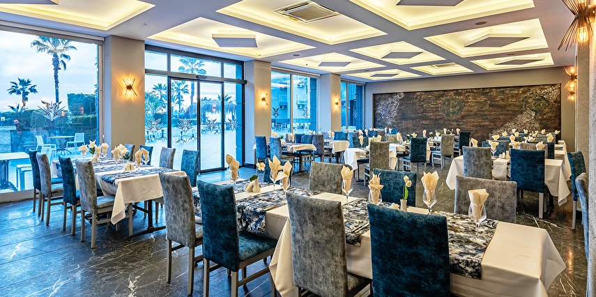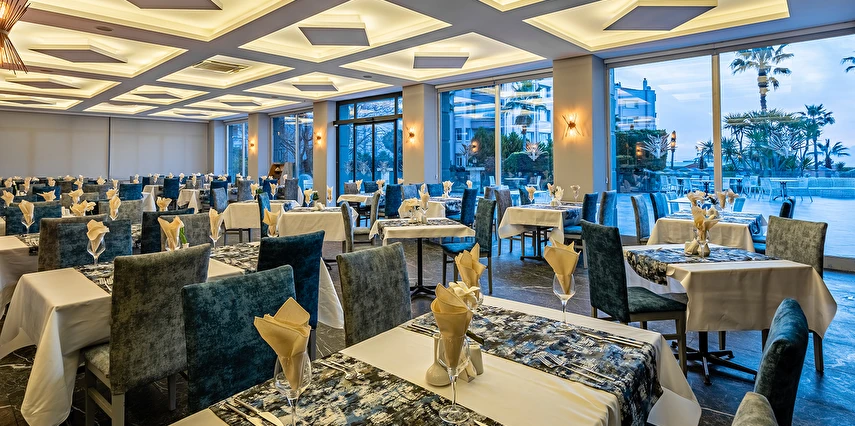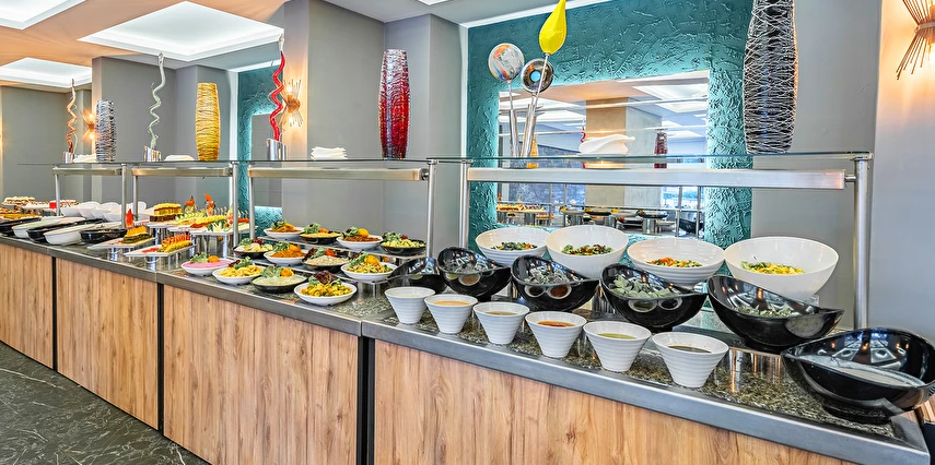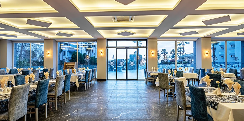 Sabah kahvaltısı, öğle, akşam yemekleri açık büfe olup, tesisin belirlemiş olduğu markalar dahilinde yerli alkollü ve alkolsüz içecekler 10:00 ile 00:00 saatleri arasında ücretsizdir. İmport içecekler, taze sıkılmış meyve suları ve oda servisi extra ücretlidir. A'La Carte Restoran kullanımı için rezervasyon gereklidir, 5 gece ve üzeri konaklamalarda 1 defa ücretsizdir.