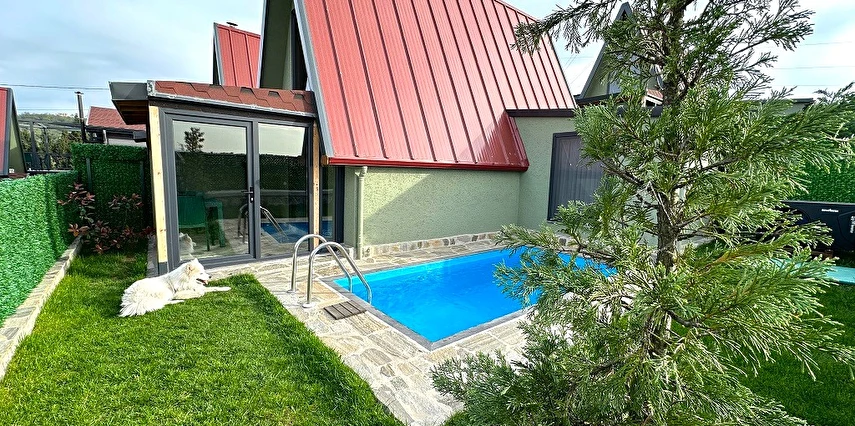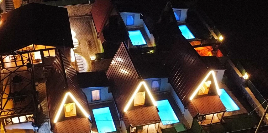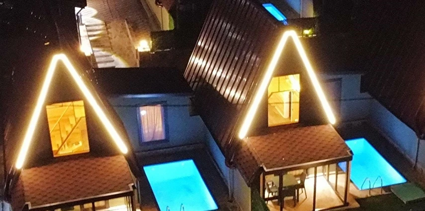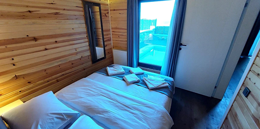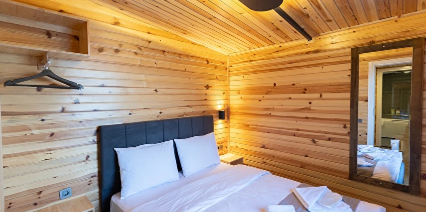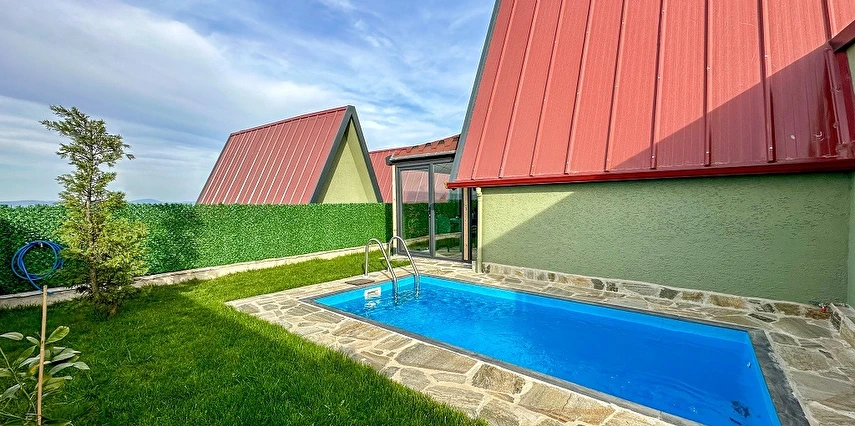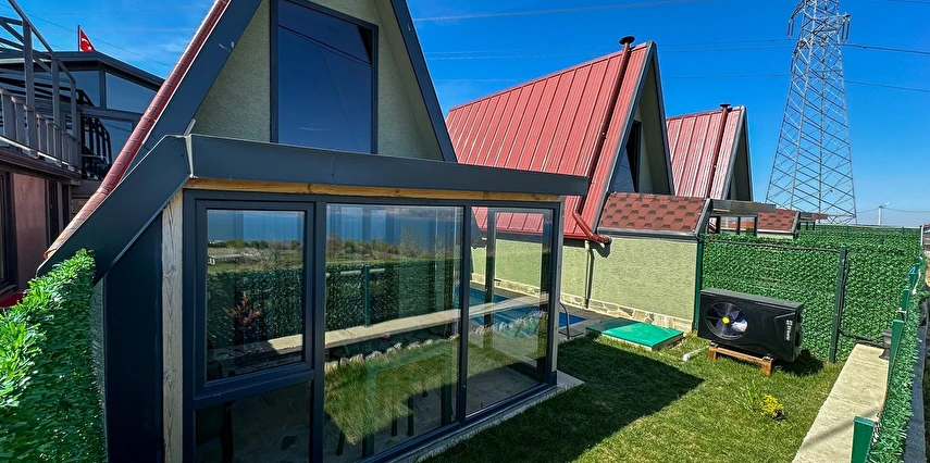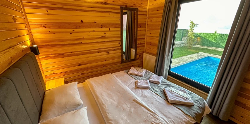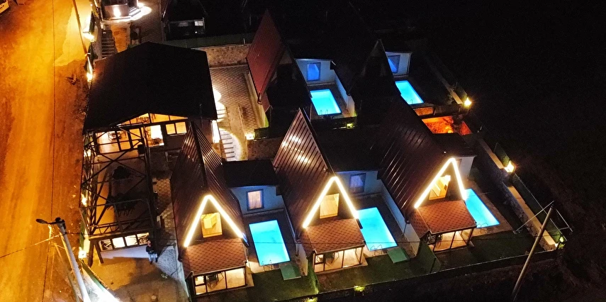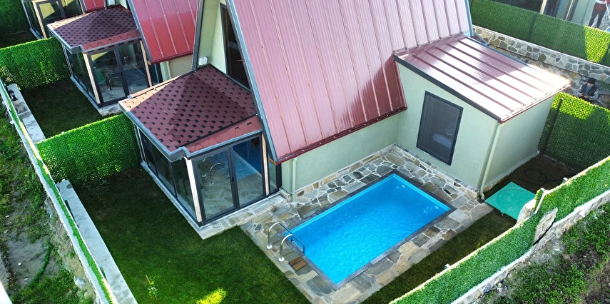 10 Adet size özel tasarlanmış Bungalovların iç kullanım alanı; yatak odası, banyo, oturma odası ve loft yatak odasıyla toplam 50 m2 dir. Gene sadece sizin kullanımınıza ait 12 m2 kapalı ve içerisinde şömine soba olan teras, 12 m3 havuz dahil olmak üzere, 33 ile 55 m2 arasında değişen bahçe mevcuttur.