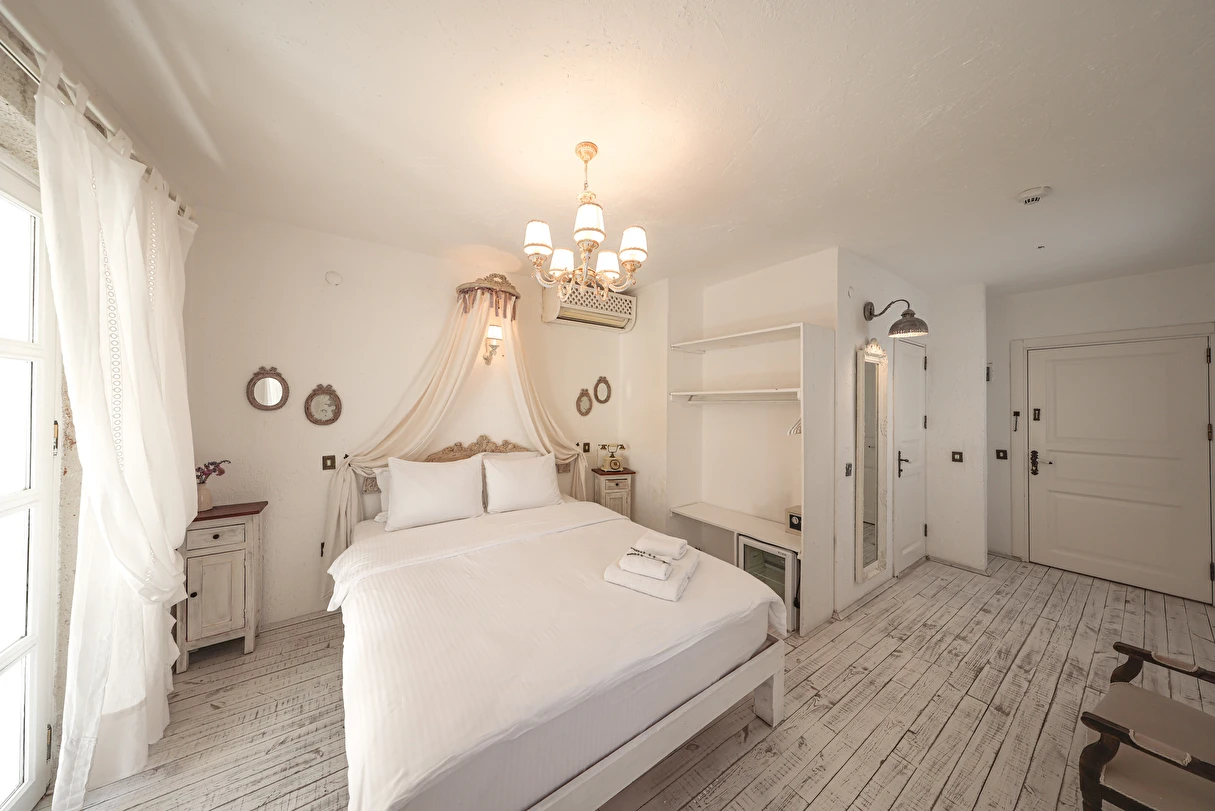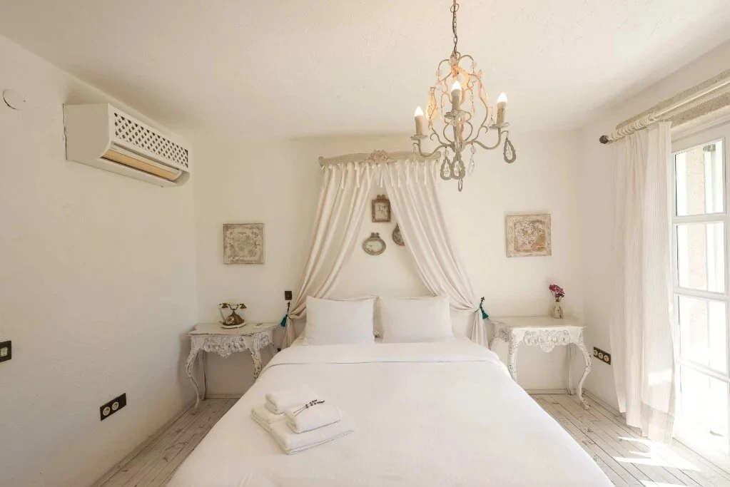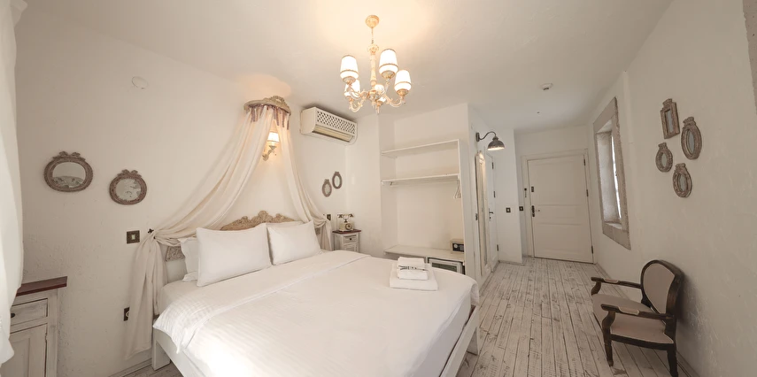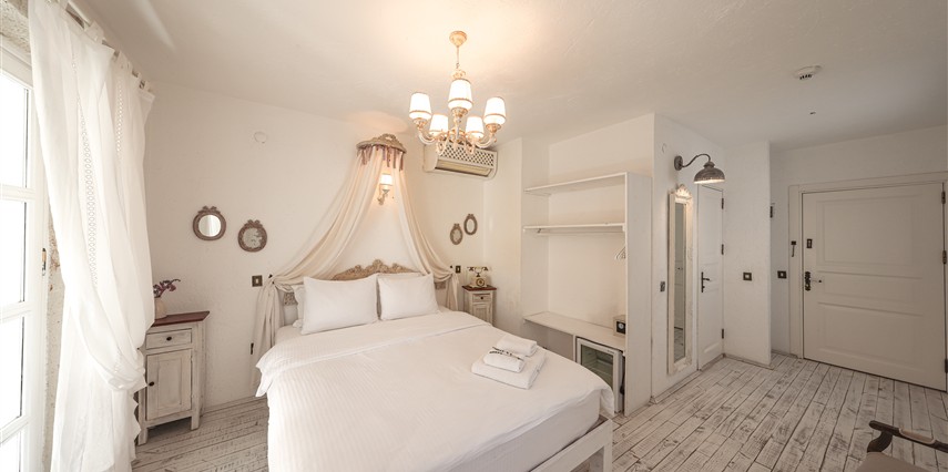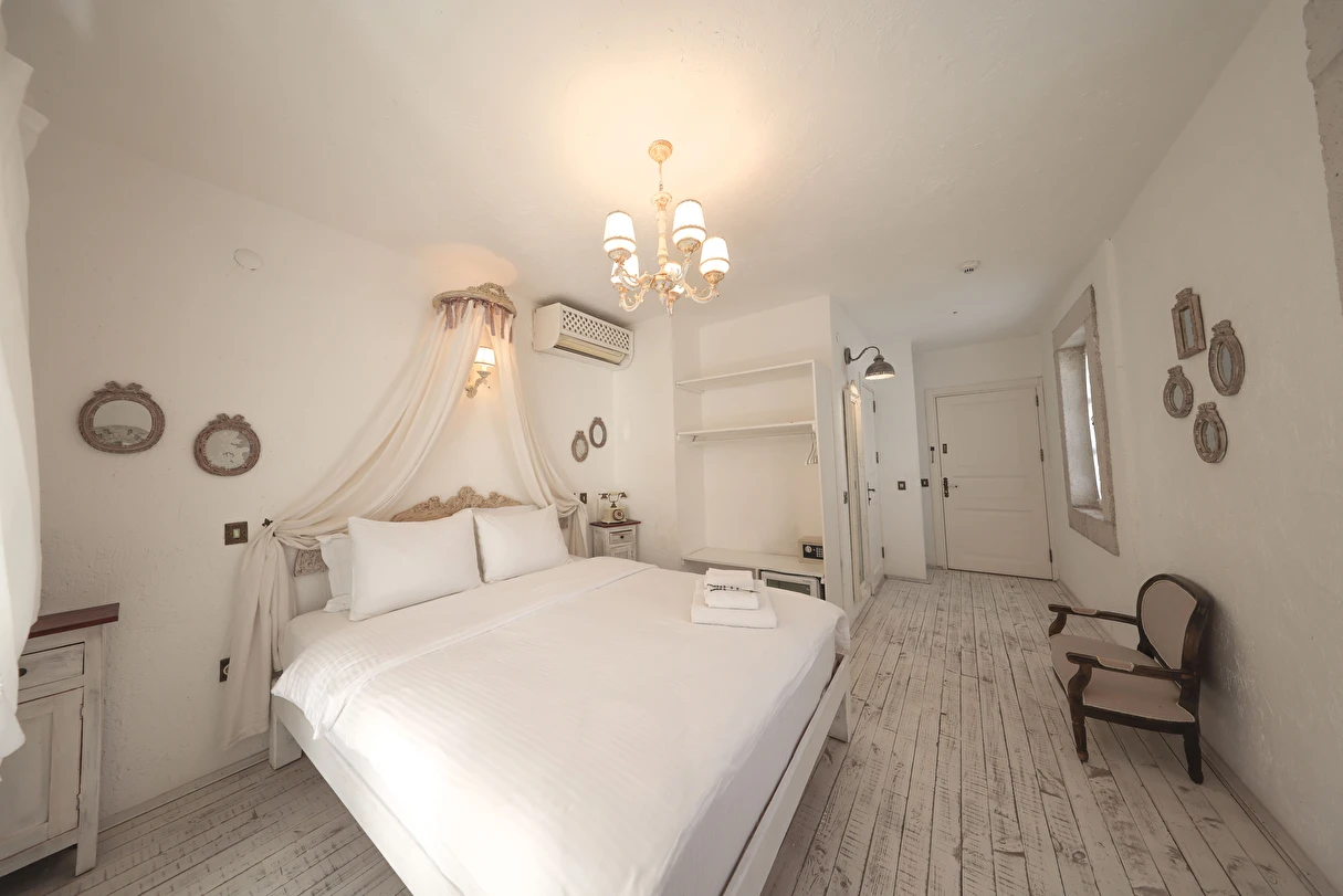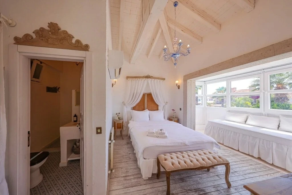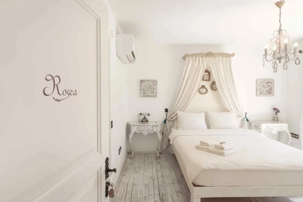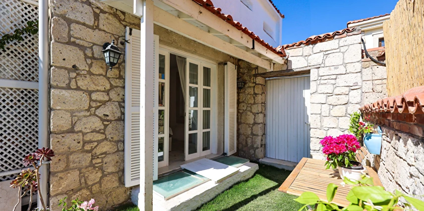 Otelde her şey incelikle düşünüldü. Bohem detaylarla süslenen zarif dekorasyon, ev sıcaklığındaki odalar, güne Ege’nin taze ürünleriyle başlayan kahvaltılar… Burada konuk değil, bir dost gibi ağırlanırsınız.