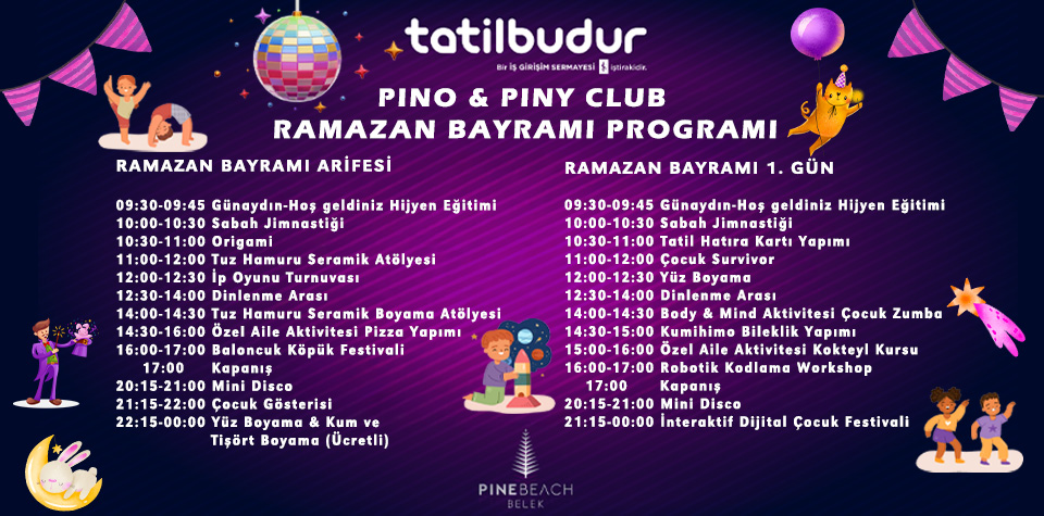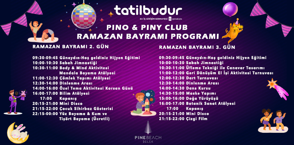 Mini Kulüp aktiviteleri; oyun alanı, kurabiye pişirme, pizza pişirme, yüz ve vücut boyama, Kızılderili günü, korsan günü, olimpiyat günü, uçurtma festivali, doğum günü partisi, panayır, açık alanda mini sinema ve mini disko. Pino Spor Akademisi aktiviteleri; futbol, yüzme (ücretli) ve Pino Çiçek Bahçesi ;0-3 yaş grubu Pino VIP Babies mini kulübe aileleri gözetiminde katılabilirler. 2 yaş ve altındaki çocukların ebeveynlerinin gözetimi altında olması gerekmektedir.