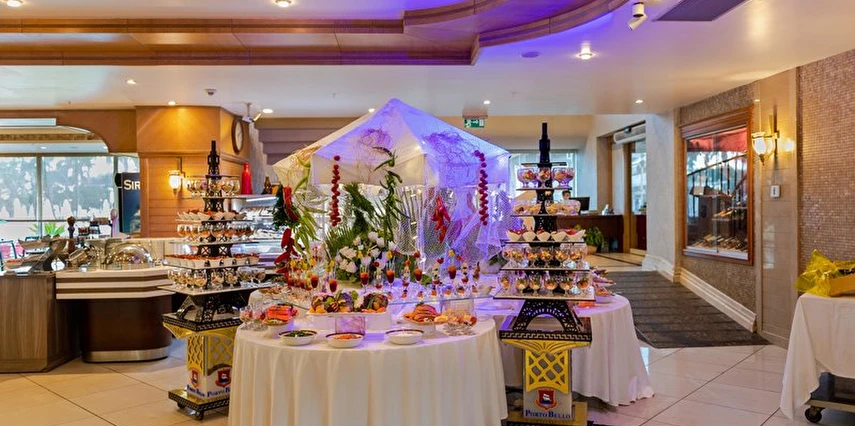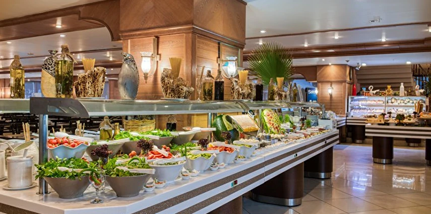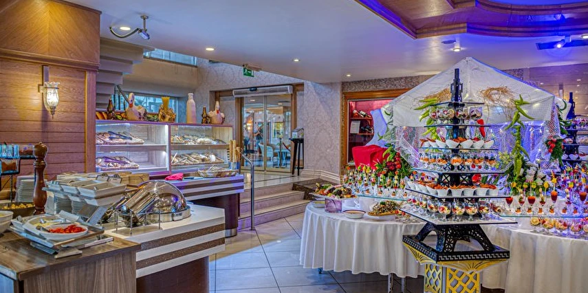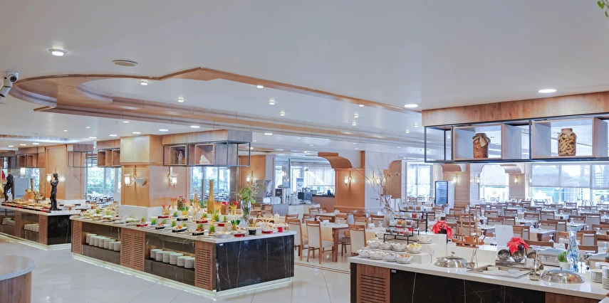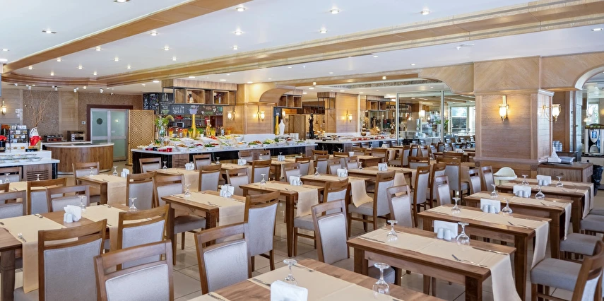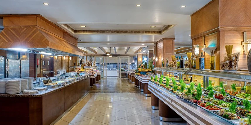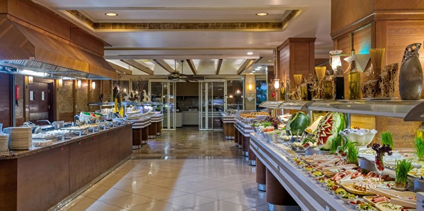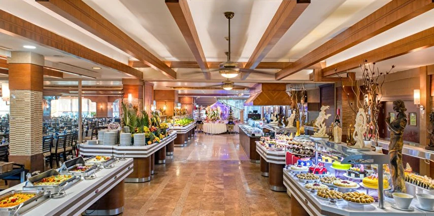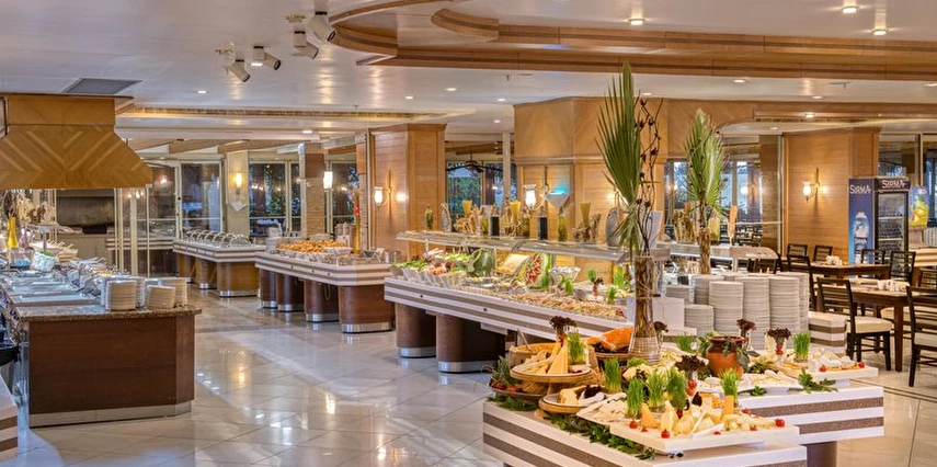 Sabah kahvaltısı ve öğle yemeği açık büfe olup tesisin belirlemiş olduğu yerli , yabancı alkollü ve alkolsüz içecekler 24 saat ücretsizdir.