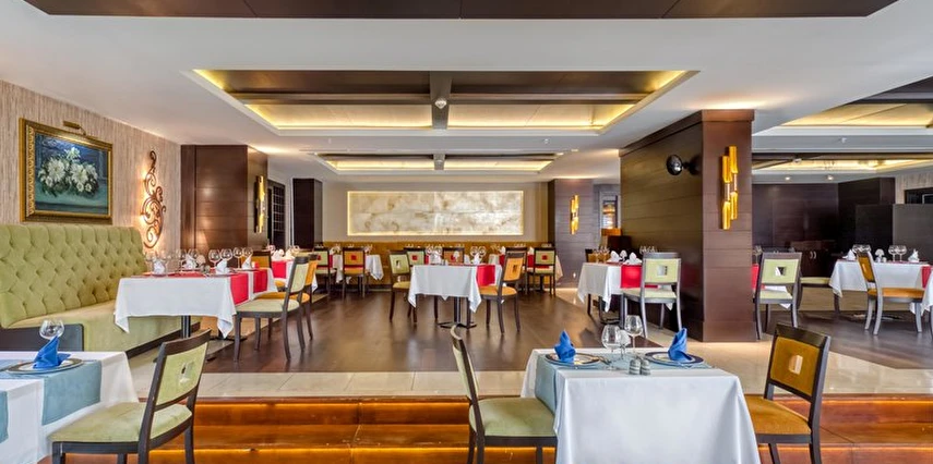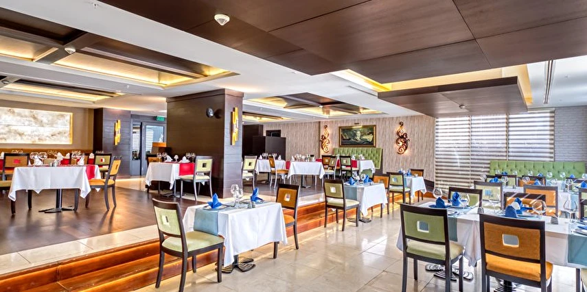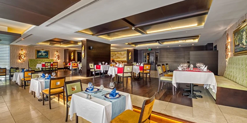 A'la Carte Restoran: Bir hafta konaklayan misafirler için ücretsiz olup , ikinci Rezervasyon talebinde veya daha az konaklamalarda ek kuver ücret karşılığında , Guest Relation deparmanından rezervasyon yaptırması gerekir.