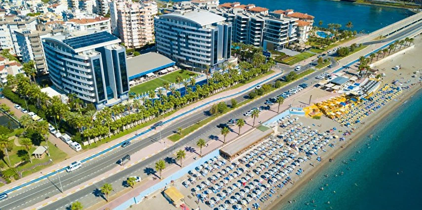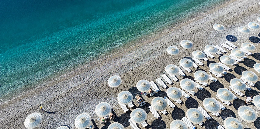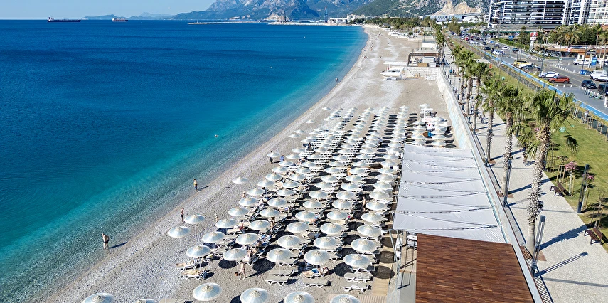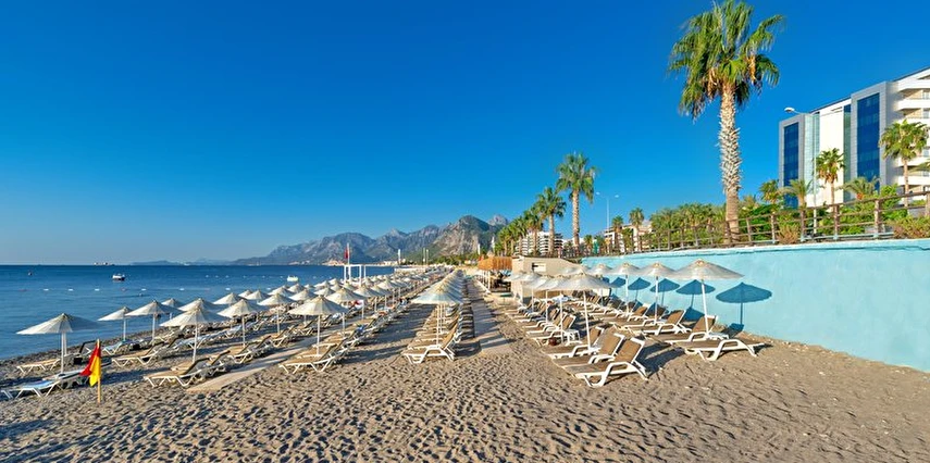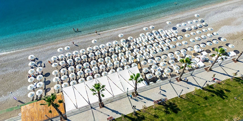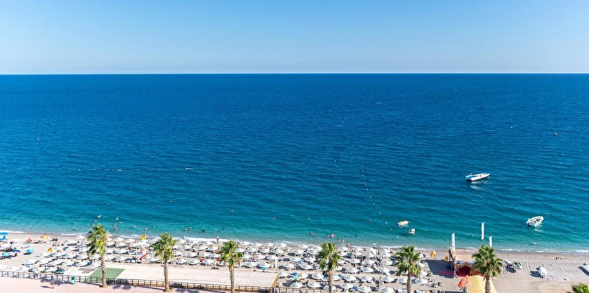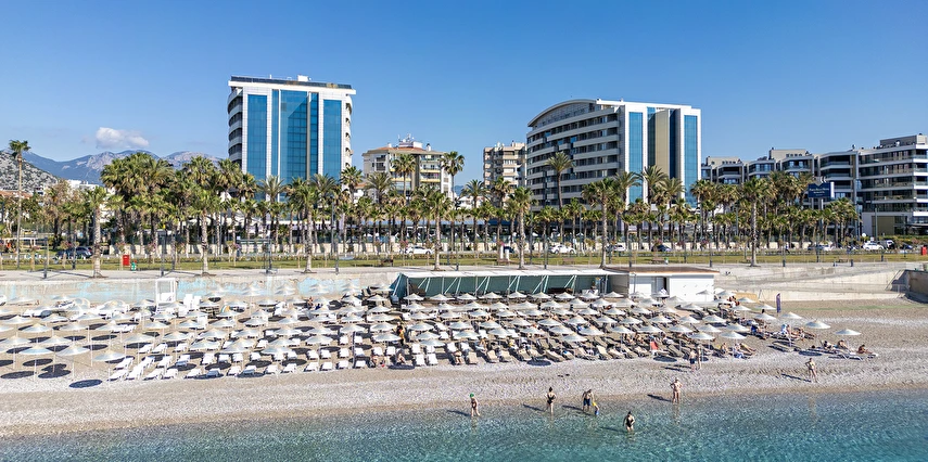 Çakıl taşlı ve kumlu/ sahile otel içinden tünel ile ulaşım (100 m) sağlanmaktadır.