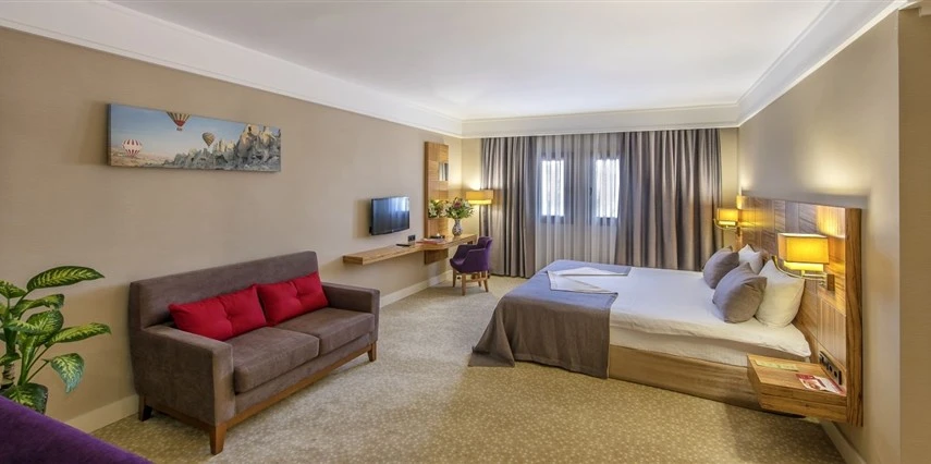 Göreme’ye yakın konumuyla dikkat çeken Ramada Cappadocia, şık ve rahat odaları, geniş kapasiteli toplantı salonu ve daha pek çok hizmetiyle iş ve turistik amaçlı konaklamalar için ideal bir alternatif sunuyor. Resmi organizasyonların düzenlenebildiği geniş ve donanımlı toplantı salonunun yanı sıra günün yorgunluğunu atabileceğiniz SPA alanında buhar odası, masaj, sauna ve hamam gibi imkanlar da mevcut. Sporsever misafirler için fitness merkezi bulunan tesis; Nevşehir Havaalanı’na 40 km, Nevşehir Otogarı’na ise 18 km mesafede konumlanıyor. Misafirlerini şık odalarında ağırlayan Ramada Cappadocia, Ürgüp’te yer alıyor. Merkezi konumu, toplantı ve konferans salonu gibi hizmetleri ile iş odaklı seyahat edenlere avantaj sağlayan tesiste, hamam ve spor salonu gibi olanaklar da mevcut.