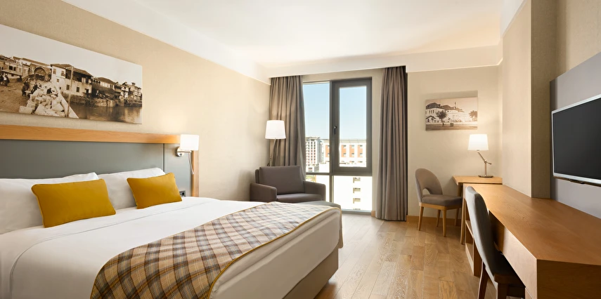 Daha Fazla GösterŞık tasarımı, kaliteli hizmeti ve zengin olanakları ile Adana’da konumlanan Ramada Hotel & Suites Adana, şıklık, zarafet ve konforu buluşturan bir tatil vadediyor. Uluslararası mutfaklardan seçkin lezzetlerin sunulduğu tesis, açık mutfak konsepti ile hizmet veriyor. Teknolojik özellikleri ile öne çıkan modern ve şık dekorasyonlu odalarında tamamen misafirlerin konforuna yönelik tasarlanmış olup hem iş hem de turistik amaçlı geziler için ideal bir konaklama alternatifi sunuyor. Tatilde sporunu aksatmak istemeyenler için fitness merkezi, tüm senenin yorgunluğunu atabileceğin sauna, masaj ve hamam olanakları da mevcut. Adana Seyhan’da hizmet veren Ramada Hotel & Suites Adana, hem iş hem de odaklı konaklamalar için uygun bir seçenek sunuyor. Sade ve modern odalarında rahat bir konaklama deneyimi sunan tesis, Adana’yı daha yakından tanımak isteyenler için de ulaşım kolaylığı sağlayan konumuyla öne çıkıyor. Ramada Hotel & Suites Adana, restoranında misafirlere zengin açık büfe kahvaltı servis ediyor. Adana’nın yöresel lezzetlerini ve dünya mutfaklarından tatları deneyebileceğiniz birçok restoran ve kafe de tesisin çevresinde konumlanıyor. Tam donanımlı toplantı salonlarıyla iş seyahatindeki misafirlerine seçkin imkanlar sağlayan Ramada Hotel & Suites Adana, huzurlu bir Adana konaklaması için ideal bir adres olarak hizmet veriyor. Adana’da modern ve şık bir konaklama atmosferi sunan Ramada Hotel & Suites, iş hem de turistik seyahatlere hitap ediyor. Çukurova Havalimanı’na 34 km mesafedeki konumdaki tesis, modern odaları ile misafirlerin ağırlıyor.