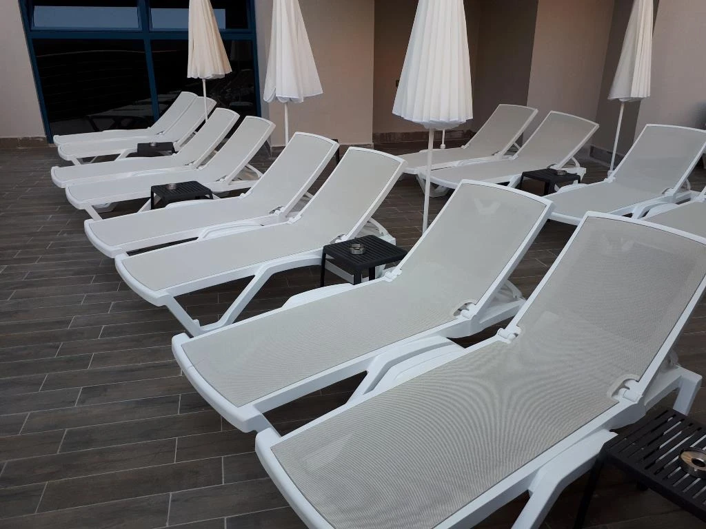 Şezlong, minder, şemsiye; havuzda ve plajda