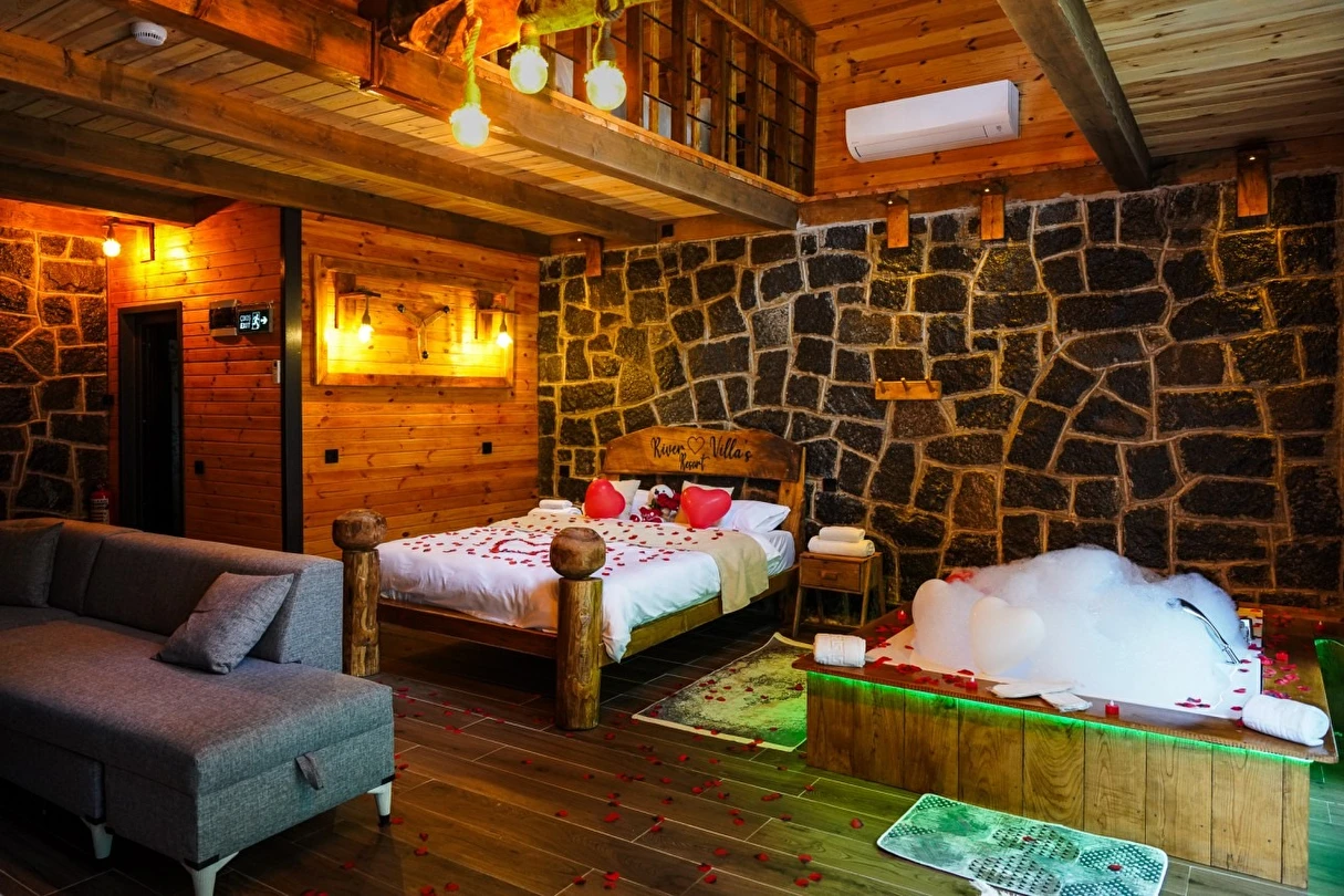Daha Fazla GösterHer villamızda şömine, jakuzi, mini mutfak, özel balkon, bahçe, oturma alanı ve eşsiz dere manzarası bulunmaktadır.