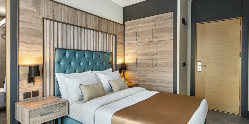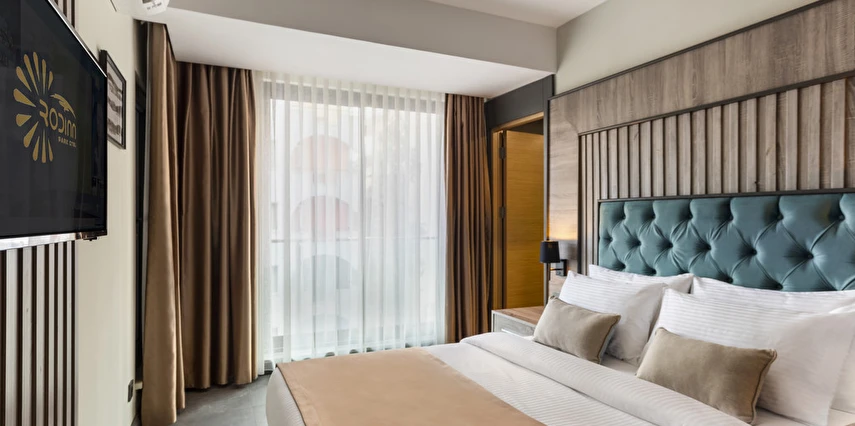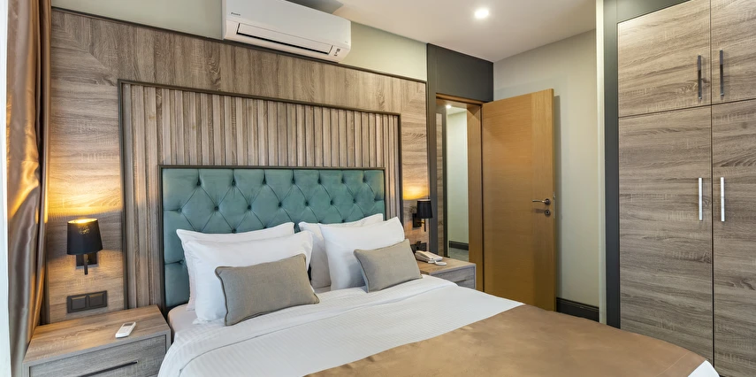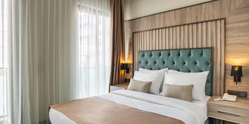 Geniş Konaklama Seçenekleri: Modern çizgilerle döşenmiş Standart, Deluxe ve Aile odaları.