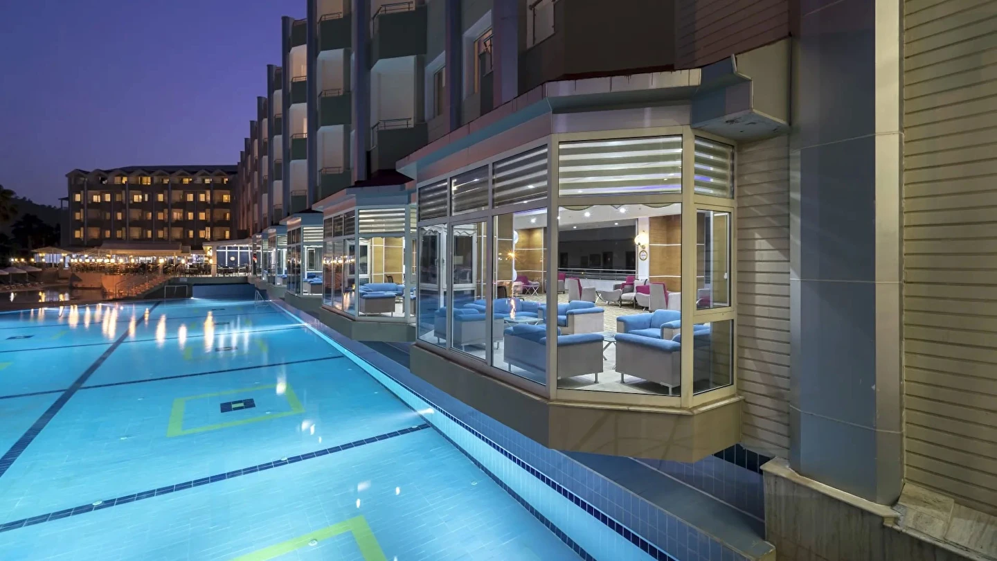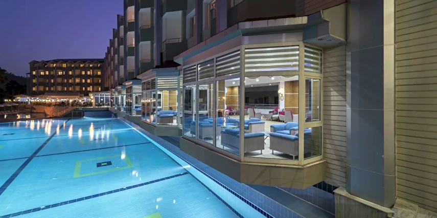 Pool Bar (24 Saat)(Soft içecekler, yerli alkollü ve alkolsüz içecekler ile seçilmiş yabancı içecekler (Vermut, Bitter, Rom, lokal Likör çeşitleri), alkollü ve alkolsüz kokteyl çeşitleri. Sıcak içecekler – çay/kahve çeşitleri. Masaya Servis)