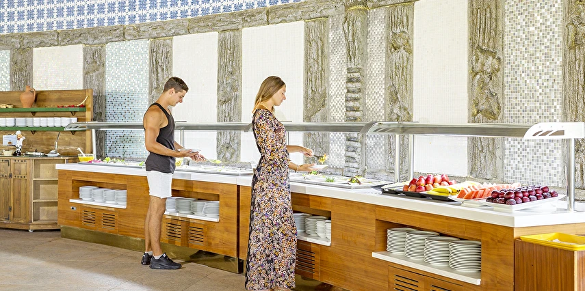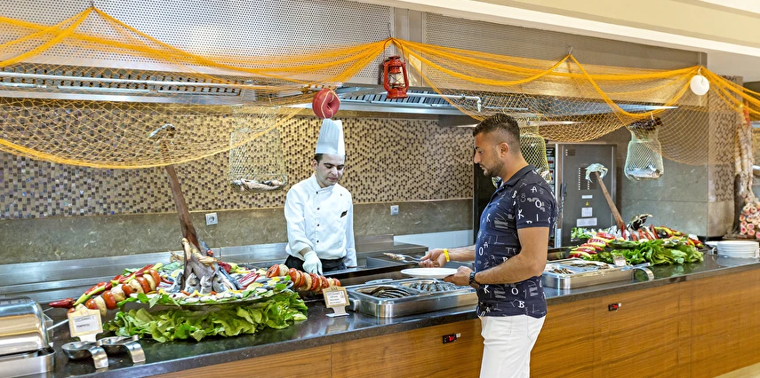 Sabah kahvaltısı öğle ve akşam yemekleri açık büfe olup tesisin belirlemiş olduğu markalar dahilinde barların servis verdiği saatler arasında yerli alkollü alkolsüz içecekler ücretsizdir. Öğle ve akşam yemeklerinde diyet köşesi mevcut olup tüm içecekler garsonlar tarafından masaya servis edilmektedir (kahvaltı hariç) Sabah kahvaltısında alkollü içki servisi yoktur. Servis görevlisi belirli bir alkol tüketiminden sonra kendine ve çevresine zarar verebilecek misafire alkol servis etmeme hakkına haizdir.
