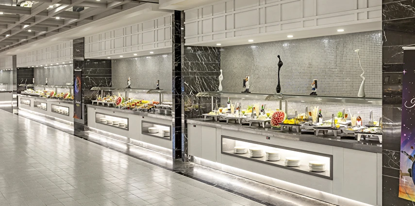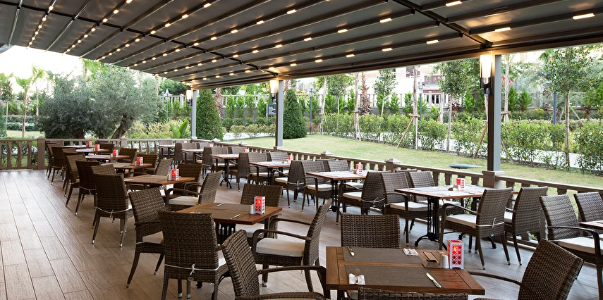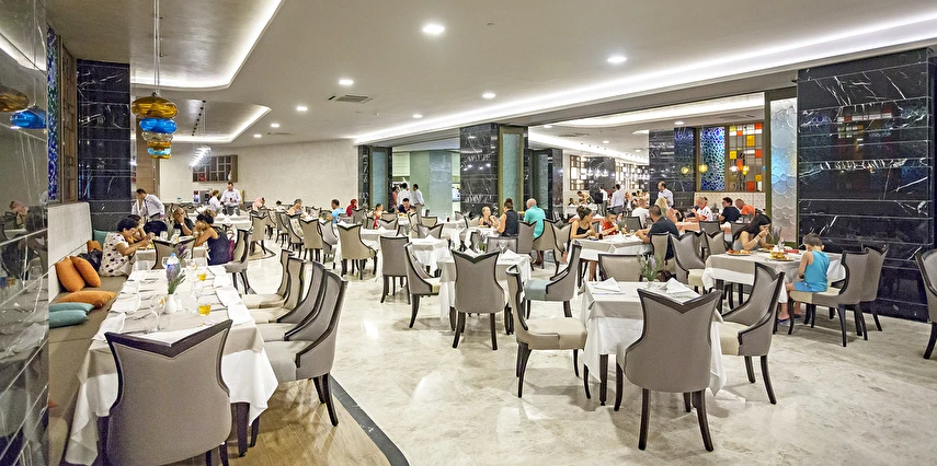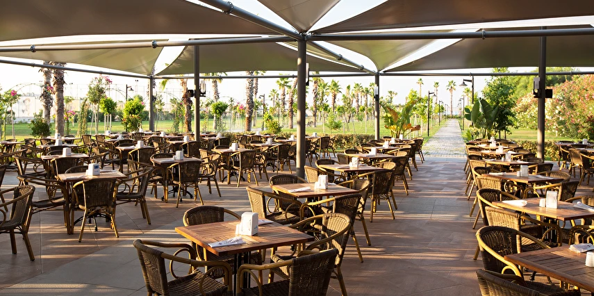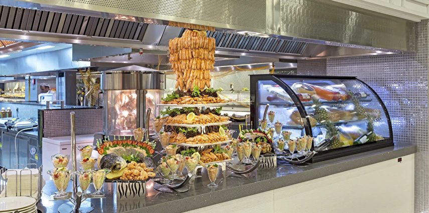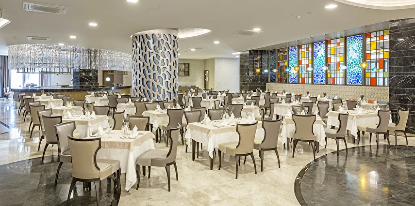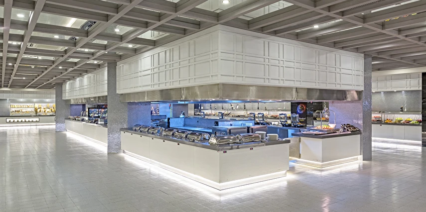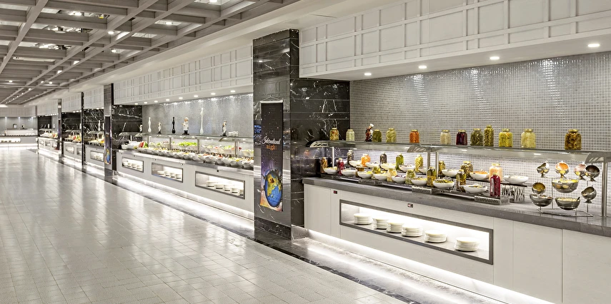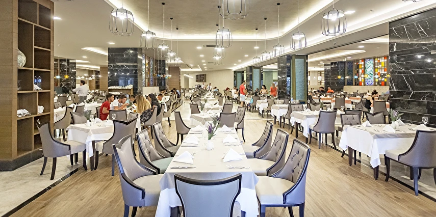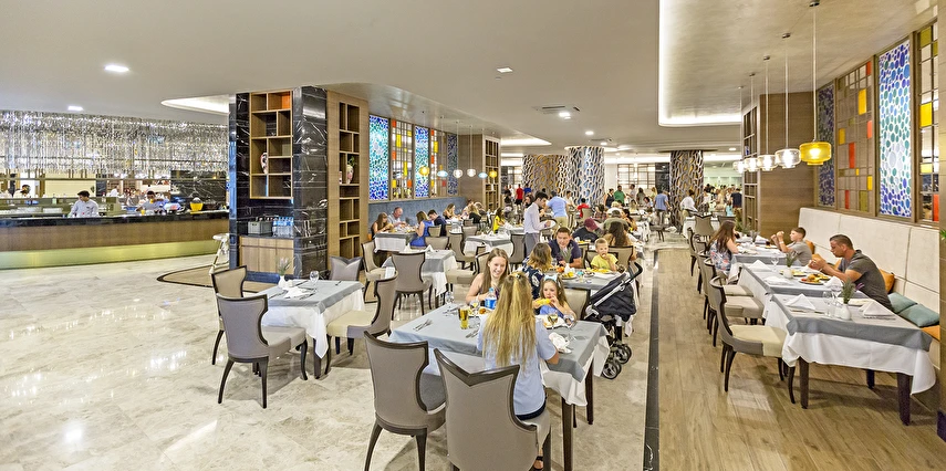 Sabah kahvaltısı öğle ve akşam yemekleri açık büfe olup tesisin belirlemiş olduğu markalar dahilinde barların servis verdiği saatler arasında yerli alkollü alkolsüz içecekler ücretsizdir. Tüm içecekler garsonlar tarafından masaya servis edilir (kahvaltı hariç ). Tüm restoran ve barlarda içki/içecek servisi kadehle yapılmaktadır. Şişede yapılan servisler ücretlidir. Bazı yerli ve ithal alkollü-alkolsüz içkiler, ögle ve akşam yemeklerinde yerli ve bazı ithal alkollü-alkolsüz içecekler ücretsizdir. Öğle ve akşam yemeklerinde yerli ve bazı ithal alkollü-alkolsüz içecekler ücretsizdir.