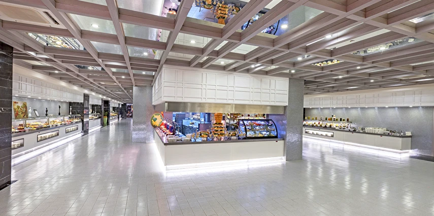 Yiyecek Köşeleri - Gün içinde atıştırmalıklar (Günün belirli saatlerinde)(Amfi tiyatronun alt kısmındaki mini restoranlarda dondurma, tost, ekmek arası döner, kumpir, waffle & pankek, pizza, sandviç, nugget, patates kızartması, pide, gözleme ve meyve servisi sunulmaktadır.)