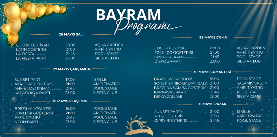 Siesta Club : İçecek Hizmeti / Limitsiz yerli - belirli alkollü alkolsüz yabancı içecekler / 23:00 - 02:00 saatleri arası hizmet vermektedir.