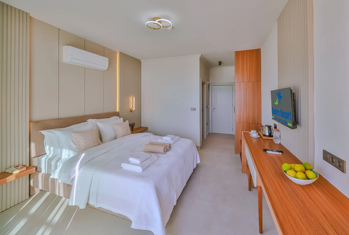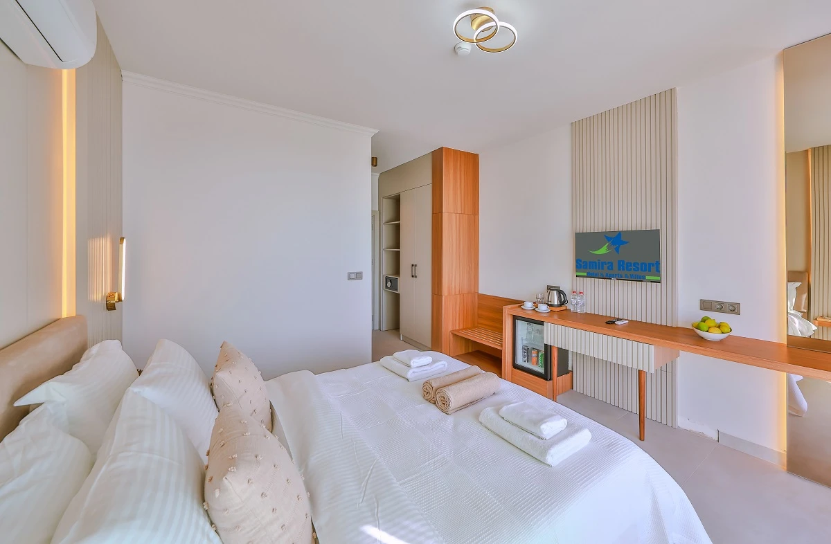 Samira Resort Hotel & Aparts & Villas, Akdeniz’in masmavi suları ve yemyeşil doğasıyla çevrili Kalkan’da, sakin ama merkezi bir konumda konuklarını ağırlıyor. Tesis, modern tasarımlı odaları, mutfaklı apartları ve özel havuzlu villalarıyla her tatilcinin ihtiyaçlarına uygun özgürlük ve konfor sunuyor. Gün boyu açık havuzun keyfini çıkarabilir, akşamları Kalkan’ın romantik çarşısında yürüyüş yapabilir veya sahilde gün batımını izleyerek unutulmaz anlar yaşayabilirsiniz.