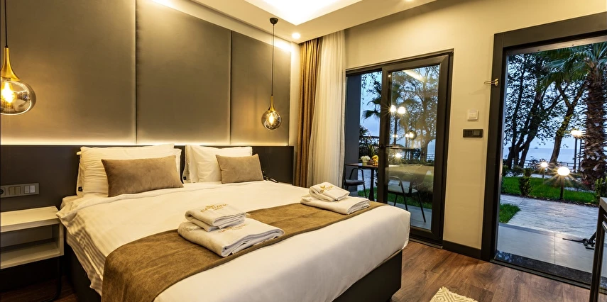Santana bahcenın muaazam görselliği ve dokusu ile denız kıyısında olmanın güzelliği sizlere huzur ve konforu sağlar.1 adet yatak odasından oluşan Standart oda olarak tasarlanmıştır. Ayrıca bağlantılı oda olarak da kullanılabılme özelliğine sahıp olan Elıte Garden ‘da 4 yeişkin konaklayabilmektedir.