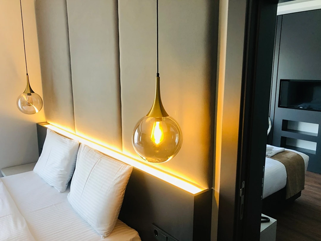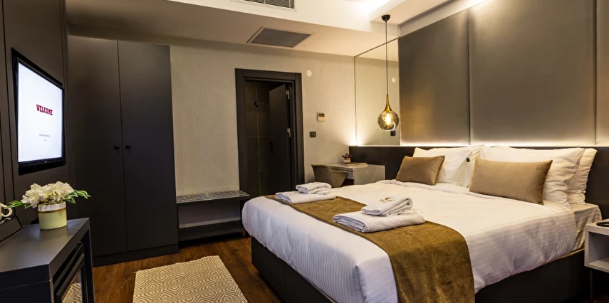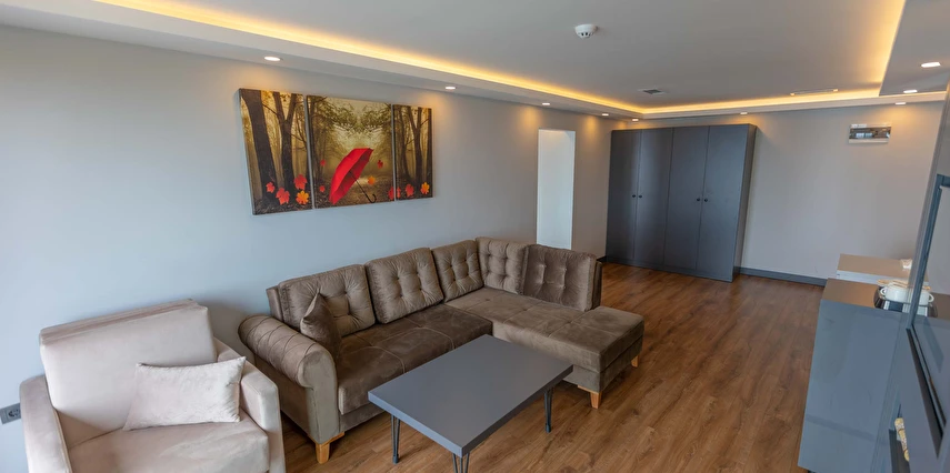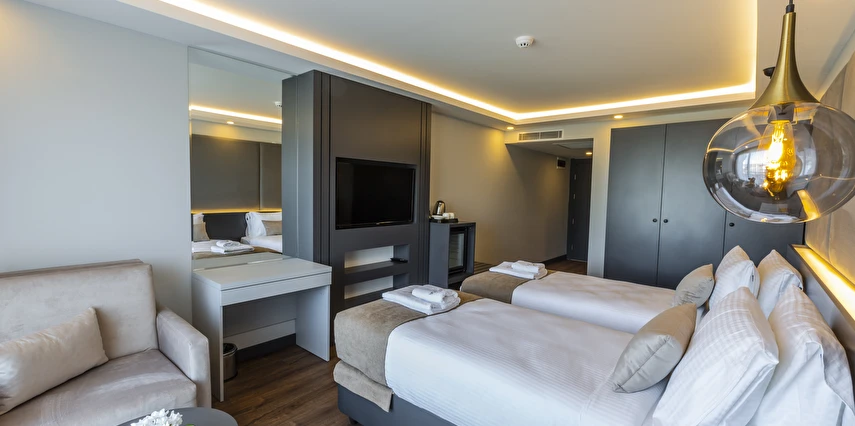 1+1 olarak hazırlanan odalar ( 1 yatak odası ve 1 salondan oluşmaktadır). 2 yetıskının rahatlıkla kalabılecegı oda konseptınde ,Extra yatak ile 4 yetıskın konaklama sağlayabilmektedir.