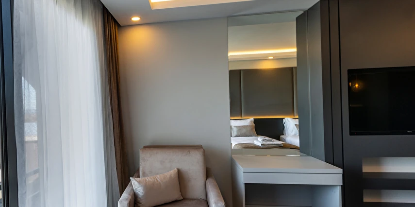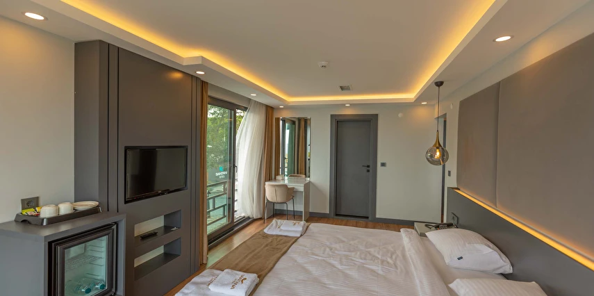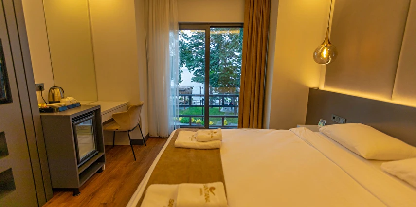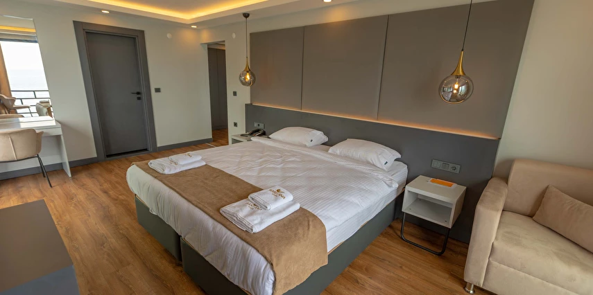 Otel ana bınada yer alan kısmi denız manzaralı odalarda şehrin kalabalıklığından uzakta sizi daha da sakin hissettirebilecek konsept . 1 yatak odasından oluşan Oda ıcerısınde 1 adet de tek kısılık sofa bed de mevcuttur.2 yetıksının kalabılecegı odada ,sofa bed kullanılarak extra 1 yetıskın daha konaklayabilmektedir.Toplamda 3 yetıskın veya 2 yetıskın 1 cocuk kalabılır.