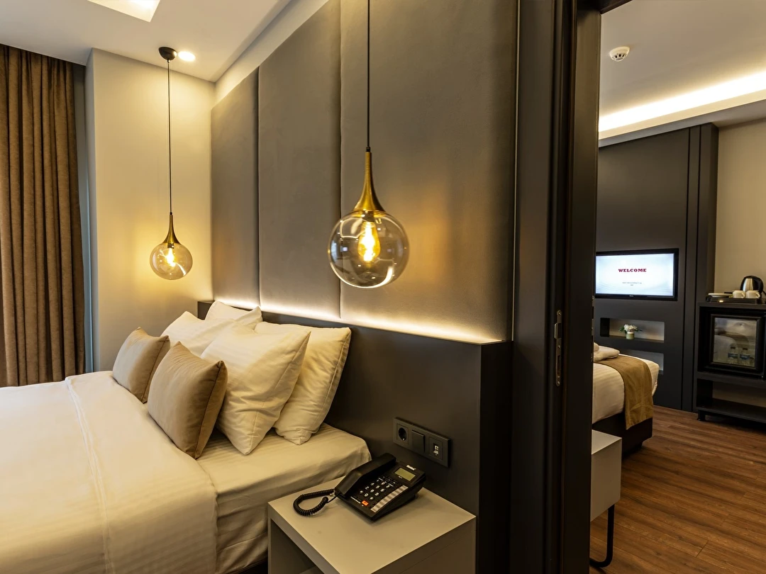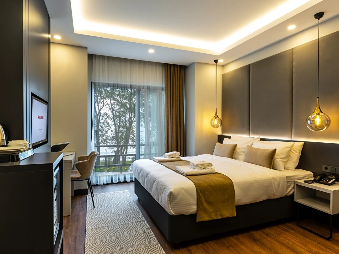 Detaylar : çay – kahve set up’ı, merkezi klima sistemi, Smart LED IP TV, direkt aramalı telefon, banyolarda telefon, mini bar, 24 saat oda servisi, çalışma masası, ücretsiz Wi-Fi internet erişimi, elektronik kasa, saç kurutma makinesi, makyaj aynası, terlik ve yastık servisimiz vardır.