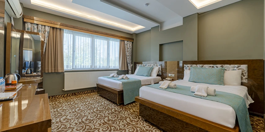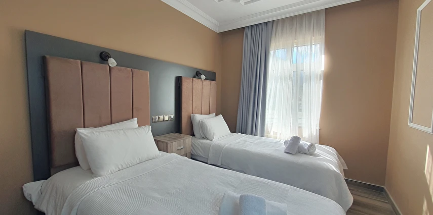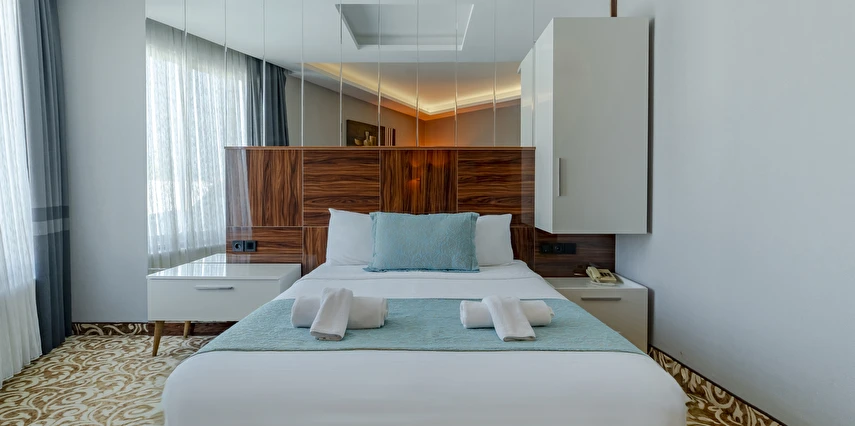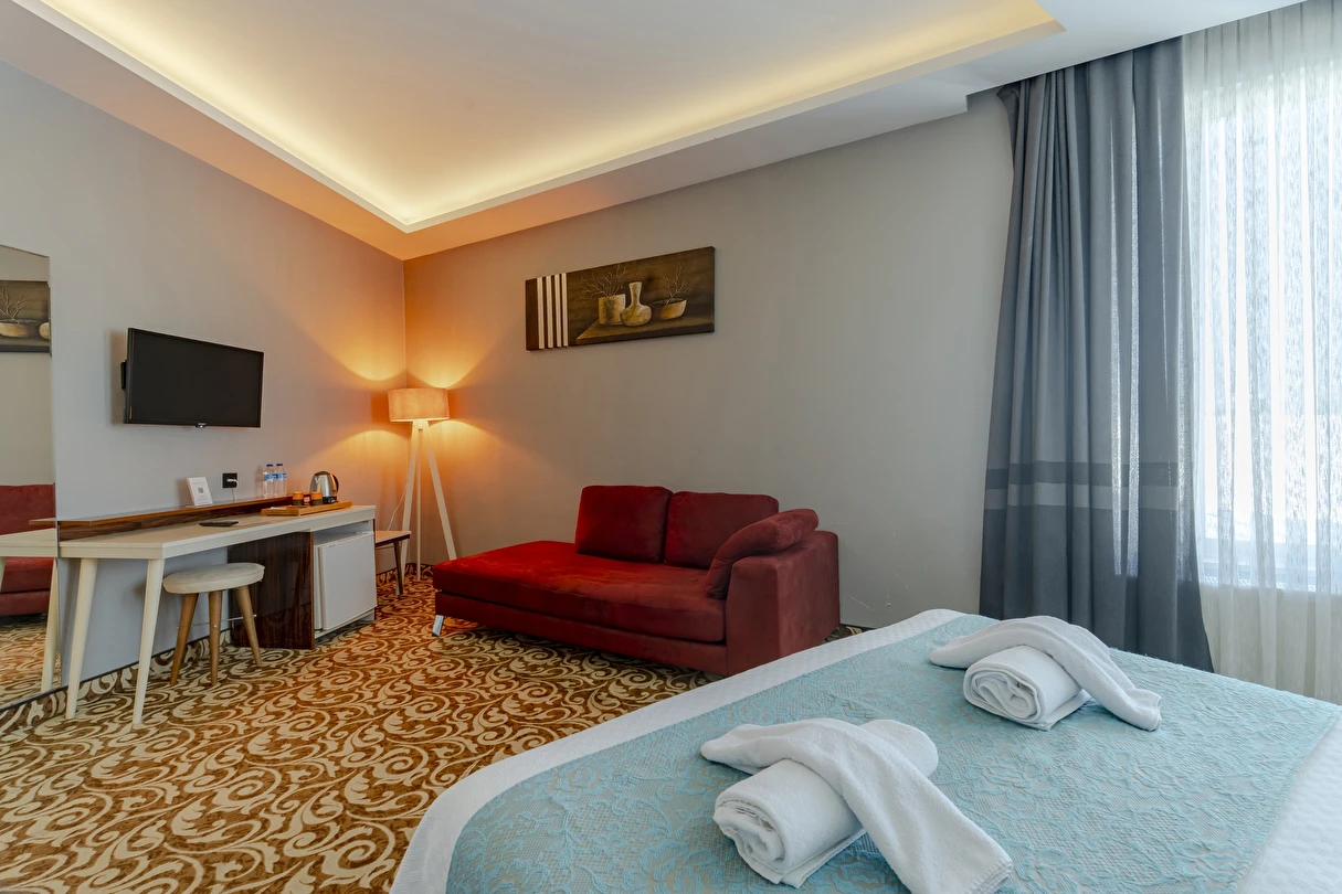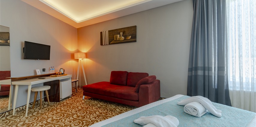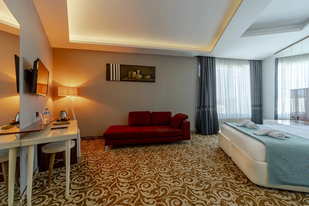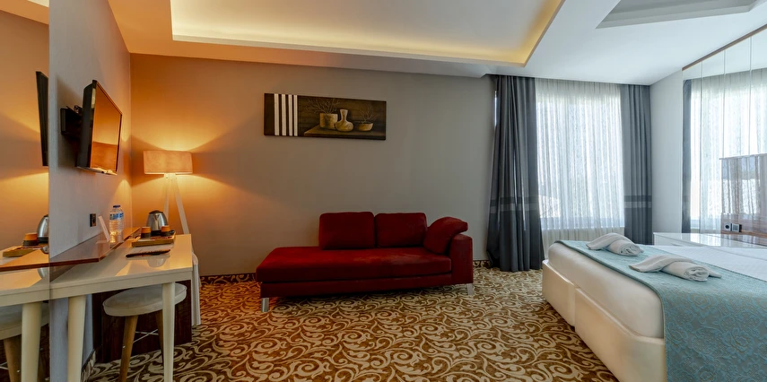 Deluxe Oda: 35 m² Deluxe Odalarımız, Standart odalar ile aynı özellikler (TV kanepesi mevcut değil) ve daha geniş bir yaşam alanı sunuyor. Odalarımızda anti stres yataklarımızda uykuya dalarken, tatiliniz esnasında gerçekten dinlendiğinizi fark edeceksiniz.