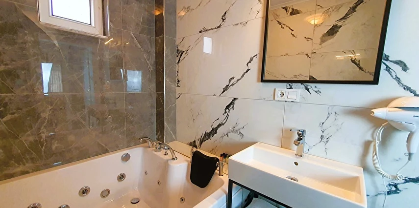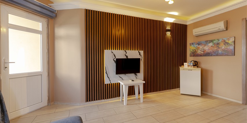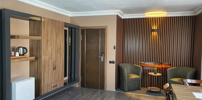 Jakuzili Superior Suit: Jakuzili ve Şömineli odamız olan Superior Suit manzarası bahçe ve havuza bakmaktadır. İçerisinde 2 adet oda bulunmaktadır. Odalara göre konaklama sayısı max. 4 kişi olarak yer almaktadır. Banyosu ile konforlu ve hijyenik kullanım alanı sağlar. İçerisinde mutfağı ve yemek alanı sayesinde evinizdeki gibi bir ortamda tatilinizi geçirmeniz mümkün. Özel teraslı balkonu mevcuttur. Kışın şömine keyfi yapacağınız, aynı zamanda özel dizayn edilmiş jakuzi alanı ile konforlu bir yaşam alanı oluşturulmuştur.