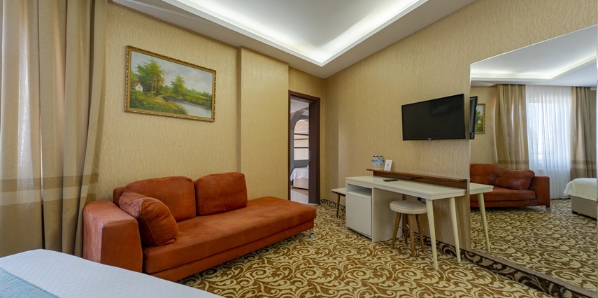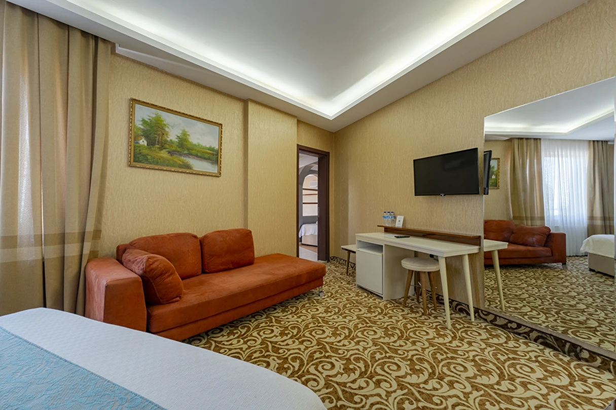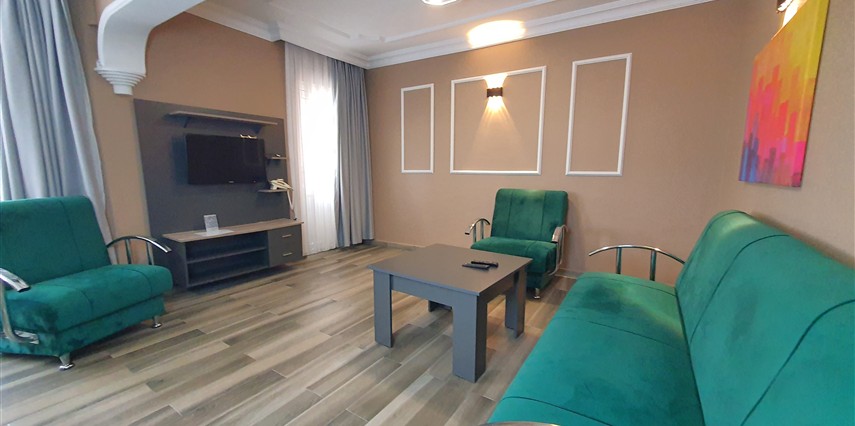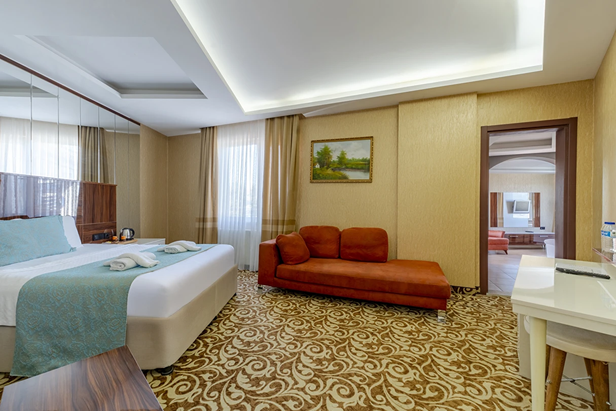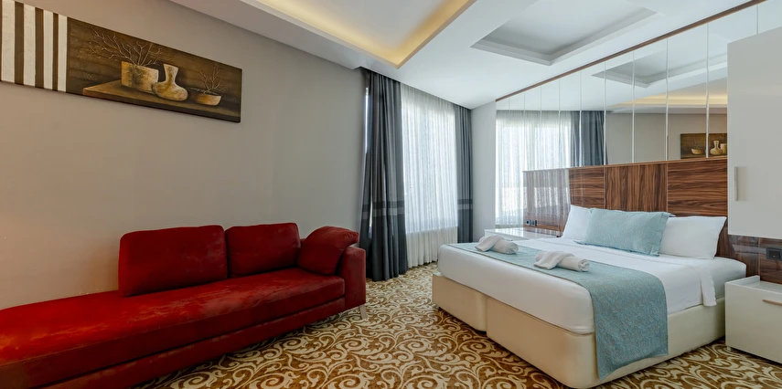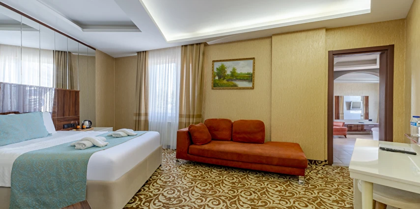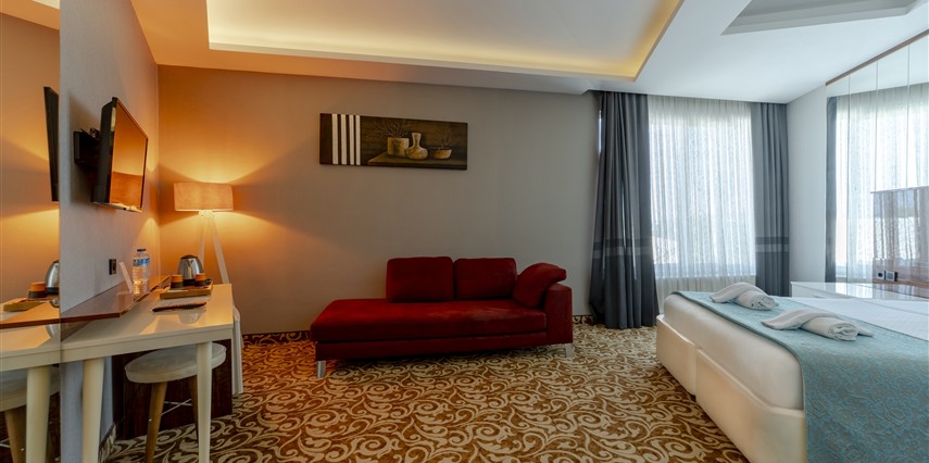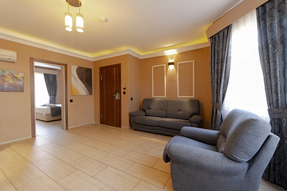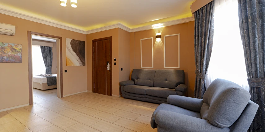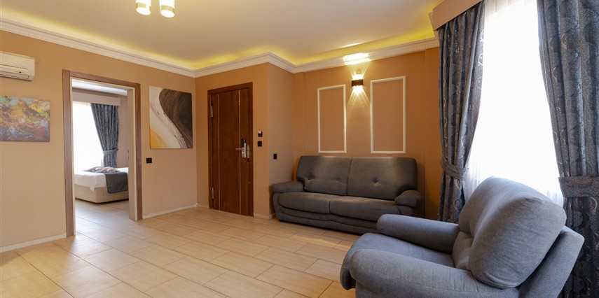 Junior Suit: 42 m²’lik Junior Suit'lerde yatak odası, oda içerisinde oturma bölümü yer alıyor. Konuklarımızın ferah, geniş ve konforlu bir tatil geçirmesi için özel olarak düşünülmüş detaylar, karo mermer zemin ile dizayn edilmiştir. Suite odalarımız zemin giriş katında yer almaktadır.