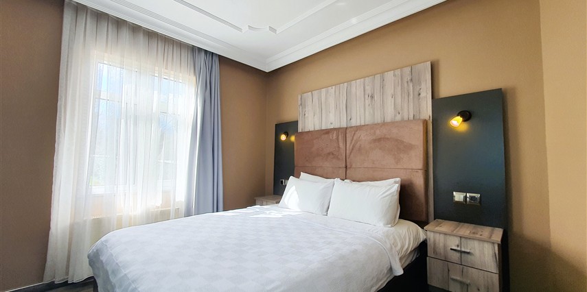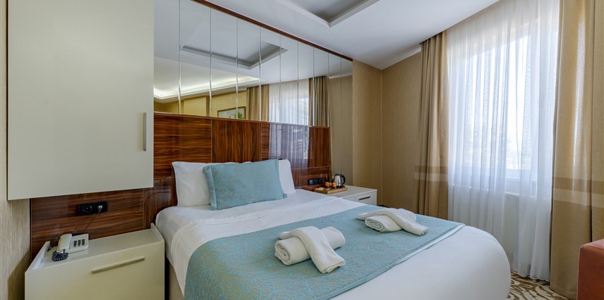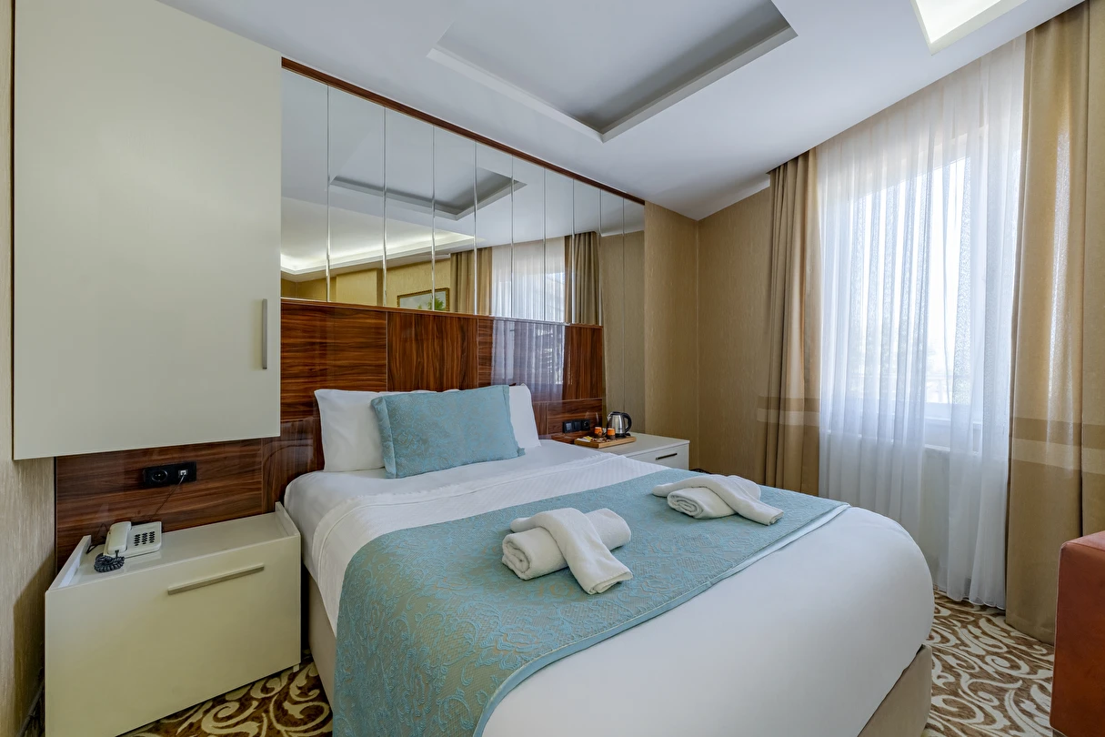 Standart Oda: 24 m² civarında büyüklükleri ile Standart odalarımız konforunuz için tasarlandı. Bahçe manzaralı ya da Havuz manzaralı olan standart odalarımız çift kişilik yatak tipine ve sahiptir. Son derece modern Tv kanepesi ve kaliteli otel mobilyaları ile kendinizi evinizde hissedeceksiniz.