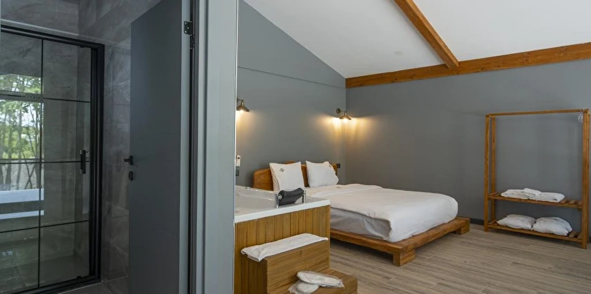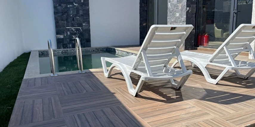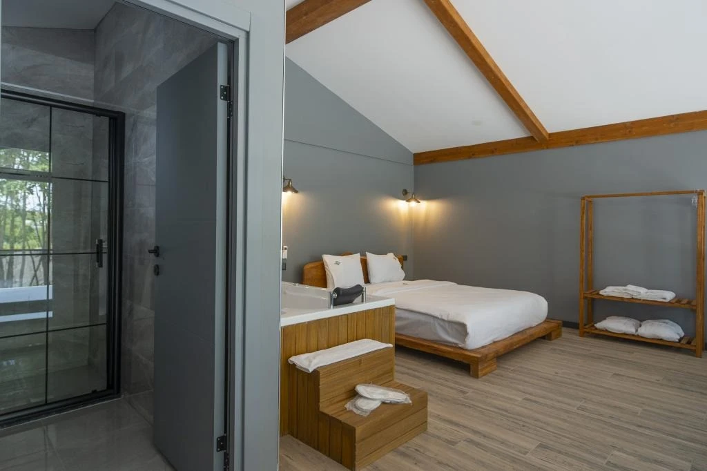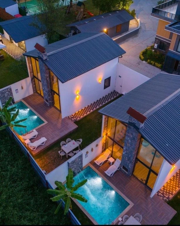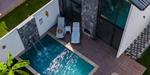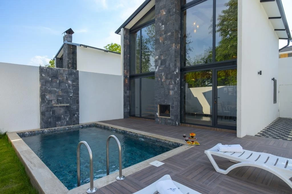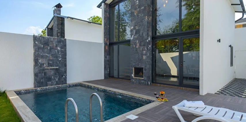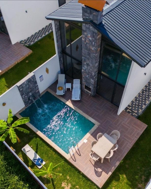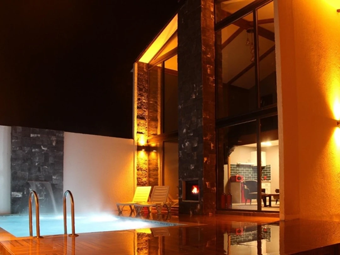 Daha Fazla Göster Müstakil ısıtmalı havuz (33-34 Derece) ve jakuzili, dışarıdan görünmeyen özel bir bungalovdur.