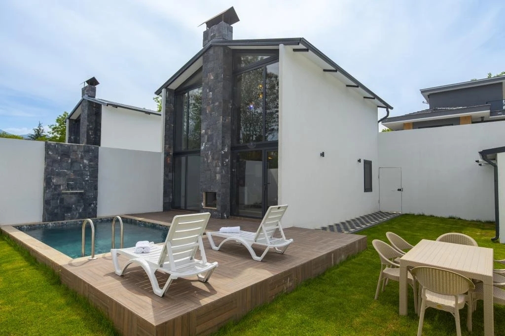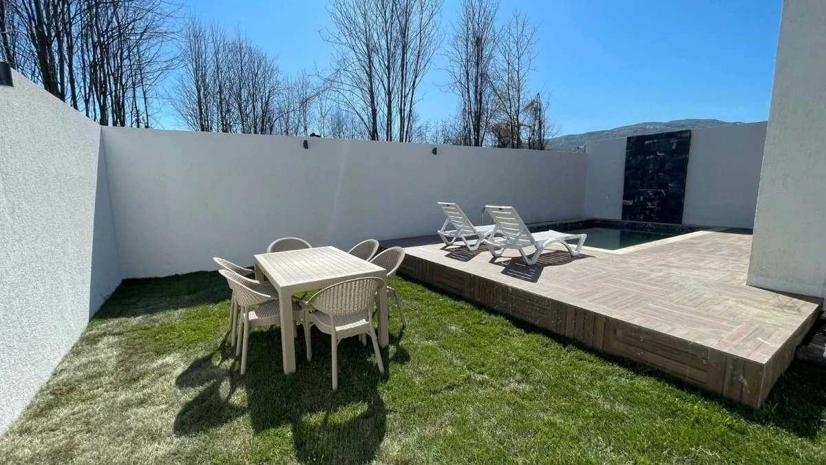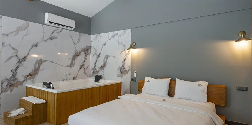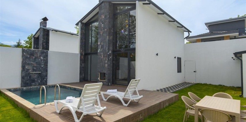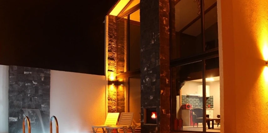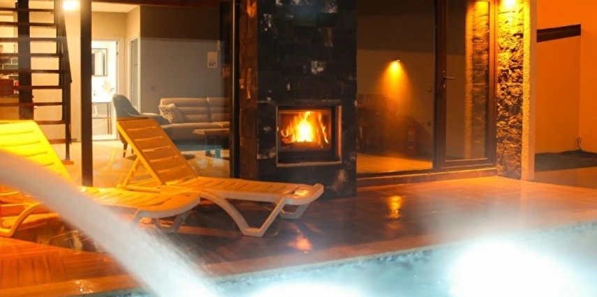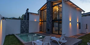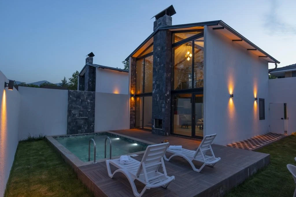 Daha Fazla Göster Müstakil ısıtmalı havuz (33-34 Derece) ve jakuzili, dışarıdan görünmeyen özel bir bungalovdur.