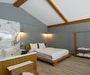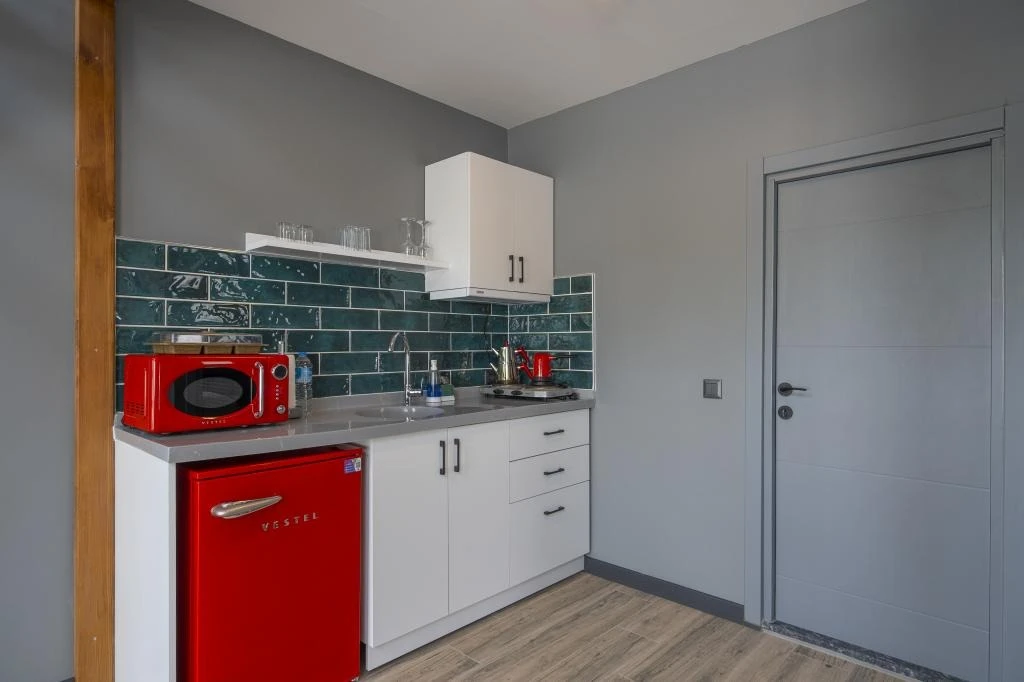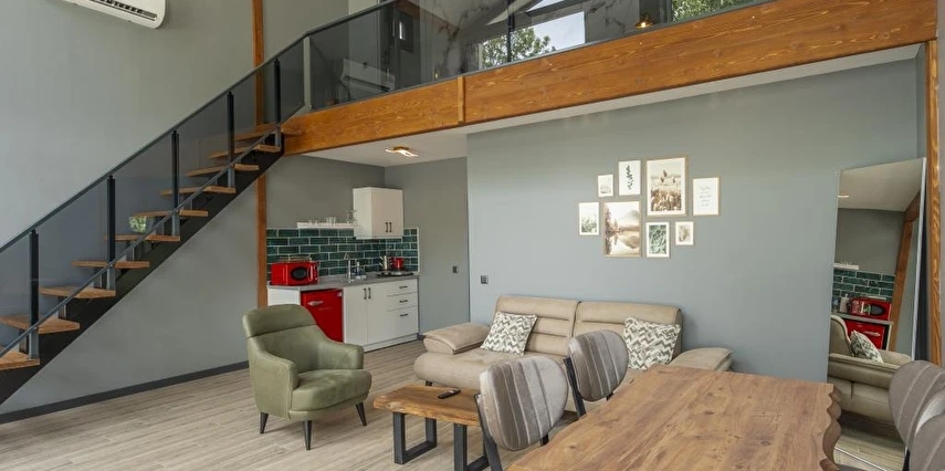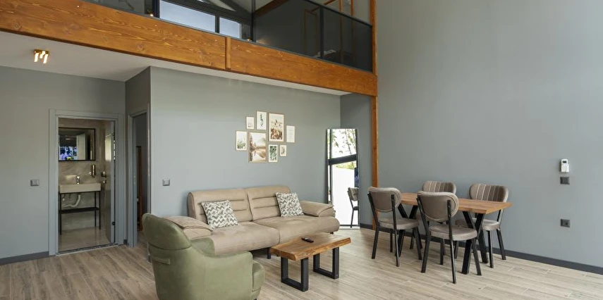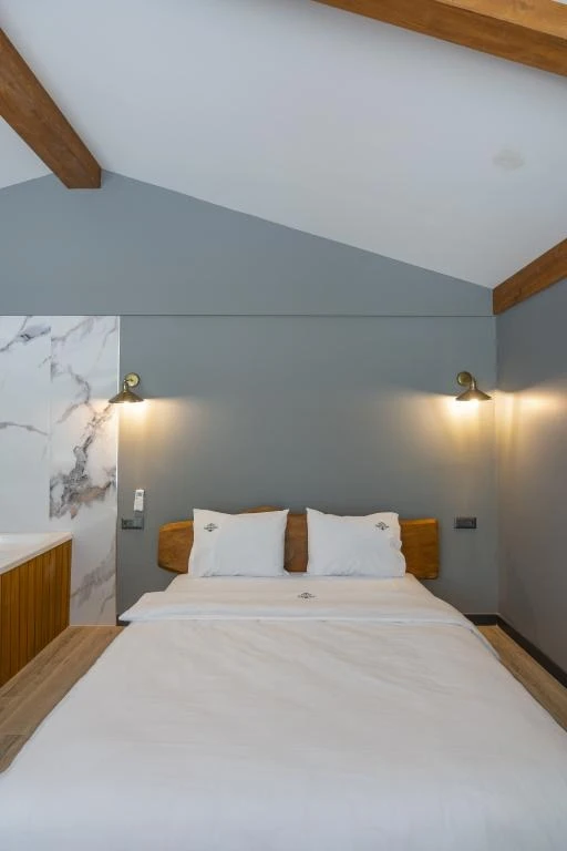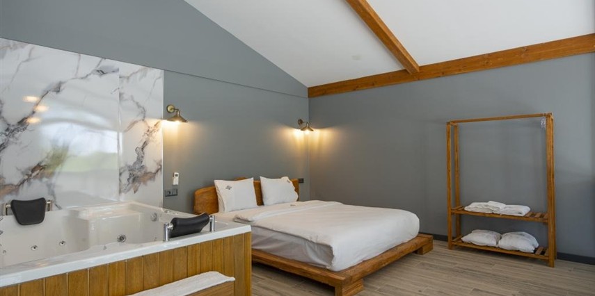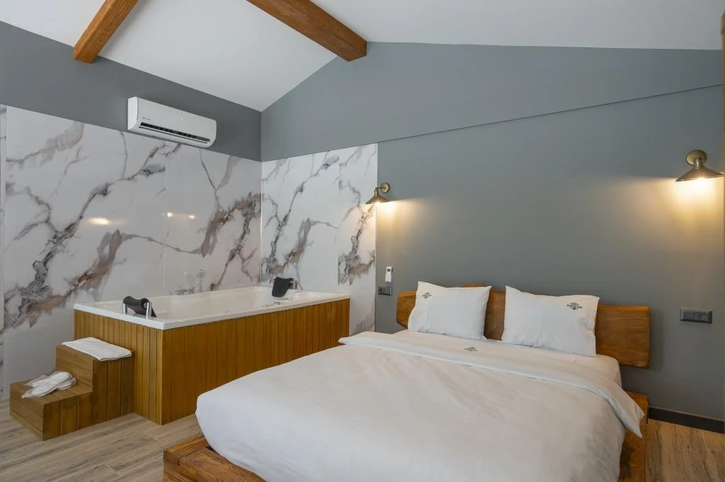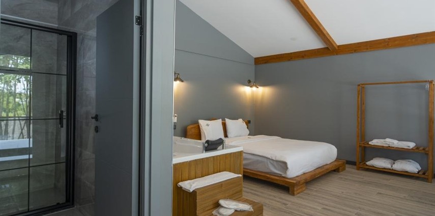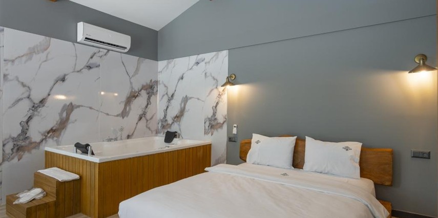 • Üst kat: 1 çift kişilik yatak, jakuzi, tuvalet-banyo (alt kattan perdeyle ayrılır)