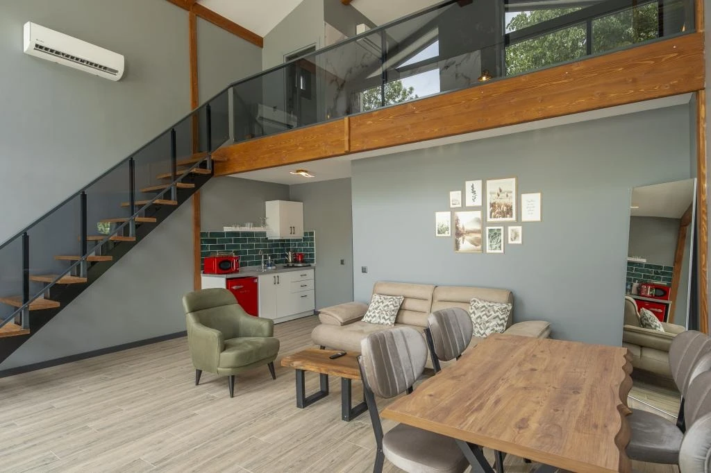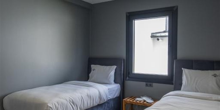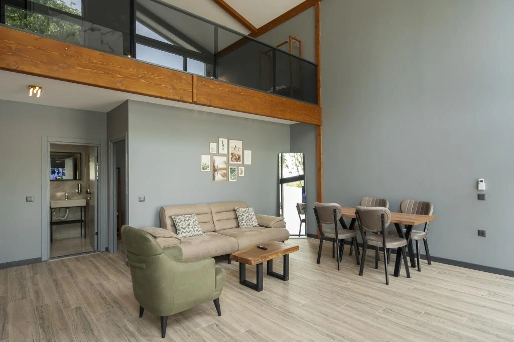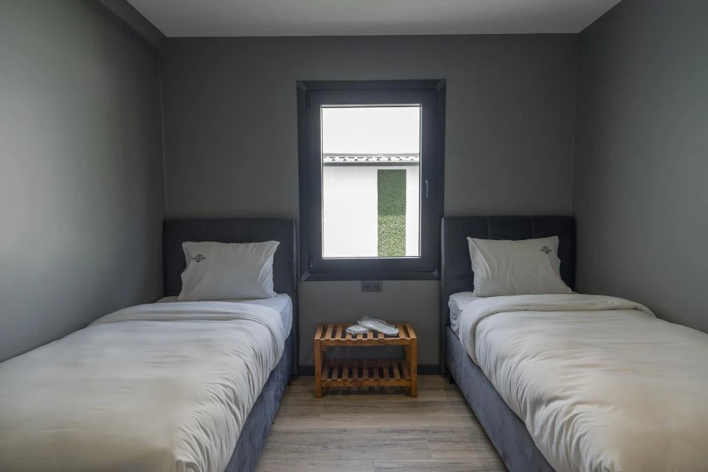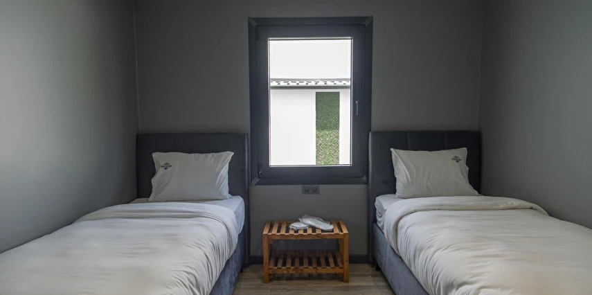 • Alt kat: 2 tek kişilik yatak, geniş oturma alanı, mutfak, tuvalet-banyo