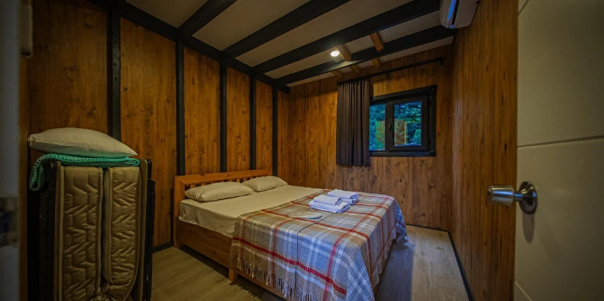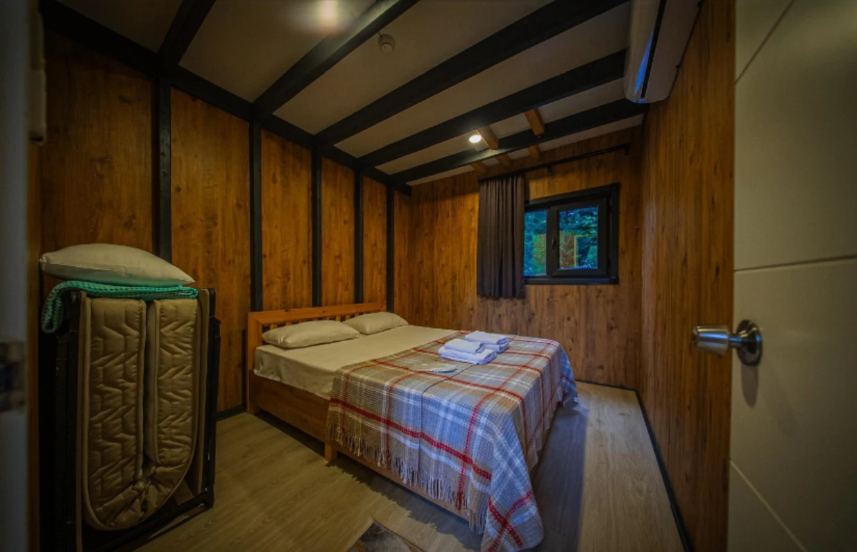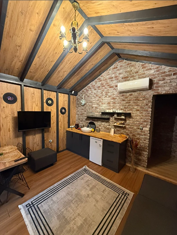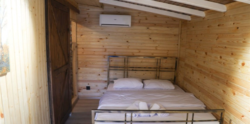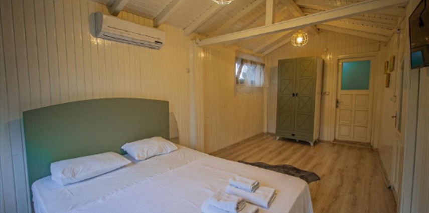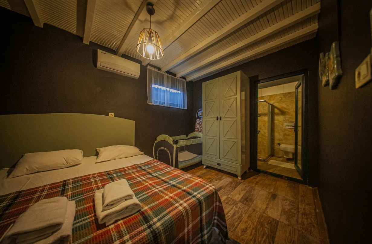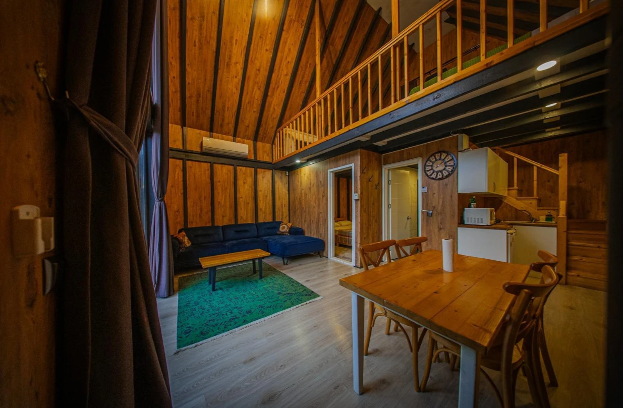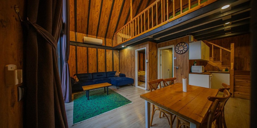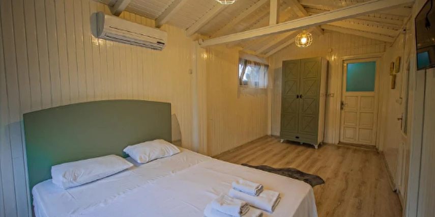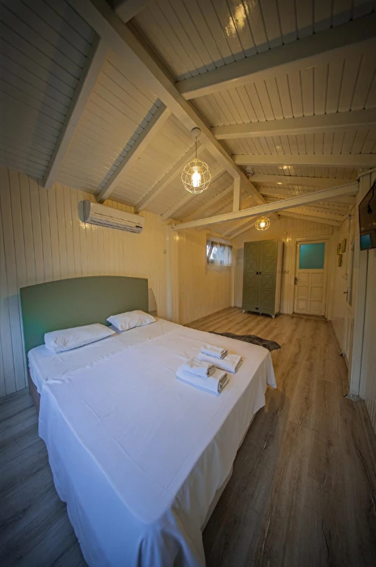 No:2 Bungalov: 75 m² genişliğiyle en büyük odamızdır ve 8 yetişkin ile 2 çocuk kapasitesiyle kalabalık gruplar için idealdir.