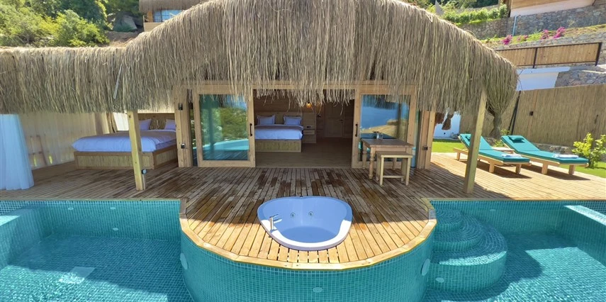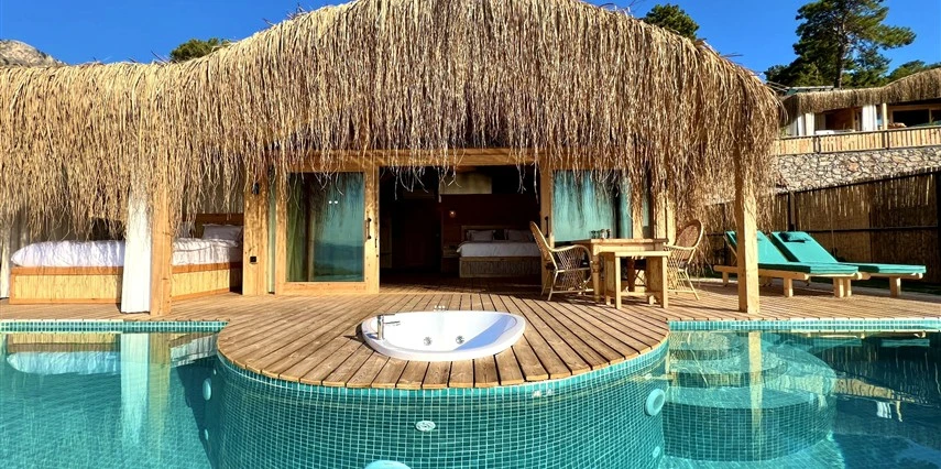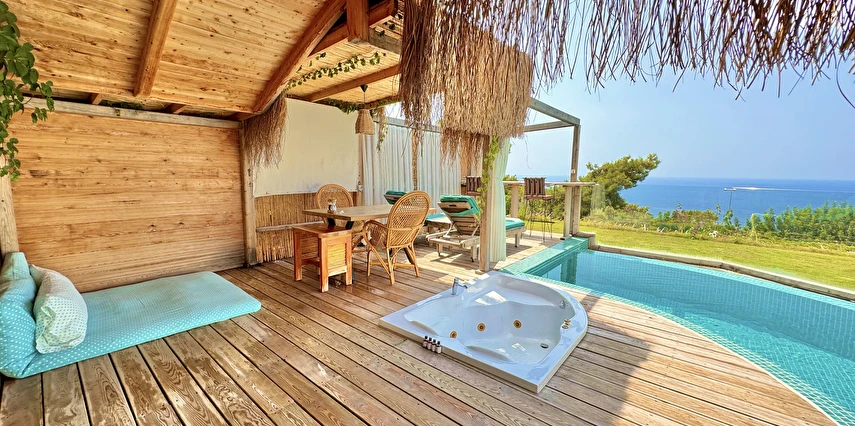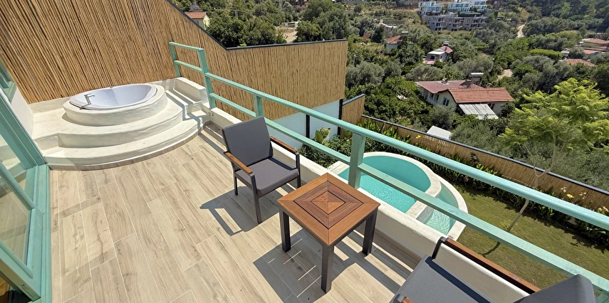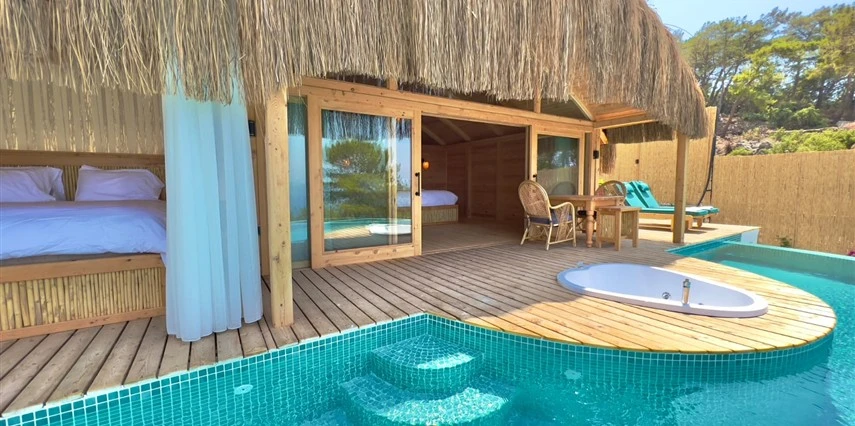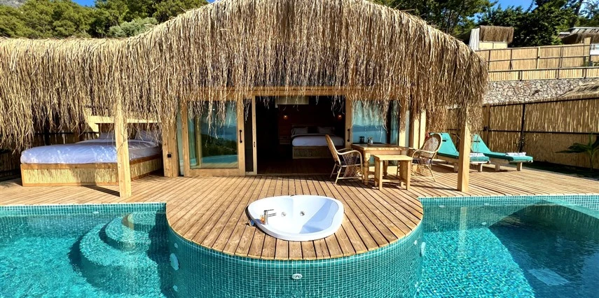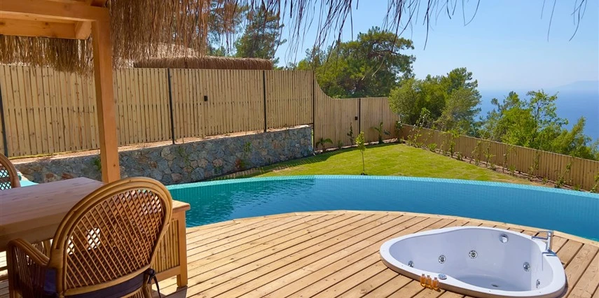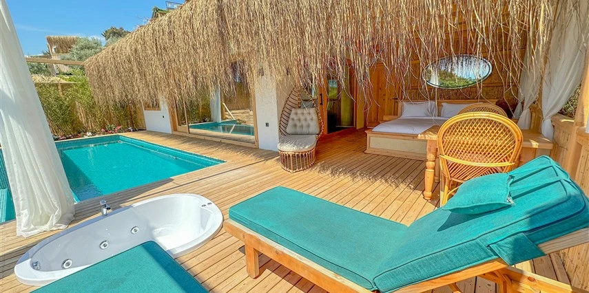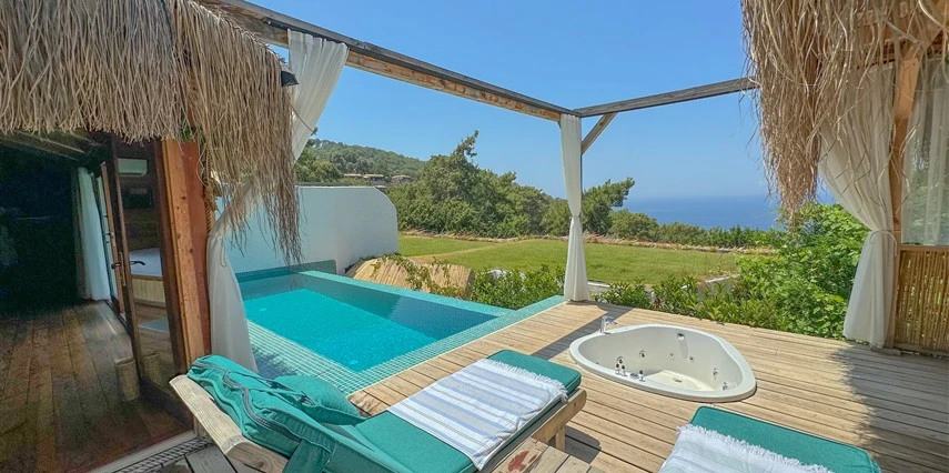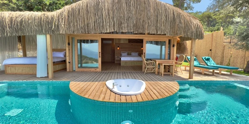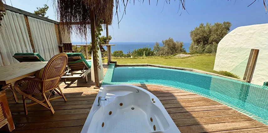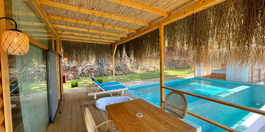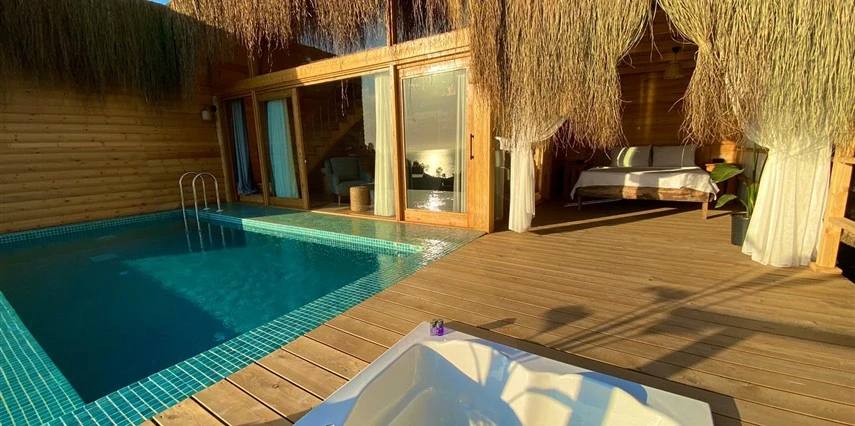 Otel kuralları gereği tesise dışarıdan yiyecek ve içecek kabul edilmiyor. Tesiste kalabalık bir plaj yerine, doğrudan odanızın terasında yer alan tamamen size ait özel havuz ve jakuzi ayrıcalığını yaşayabiliyorsunuz.