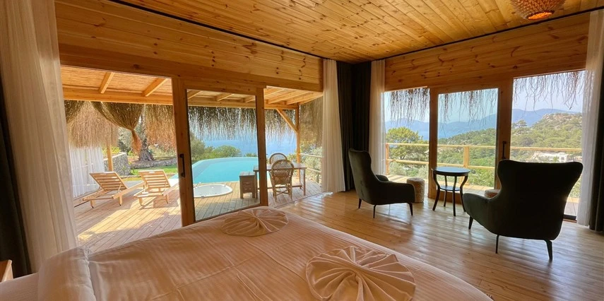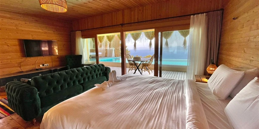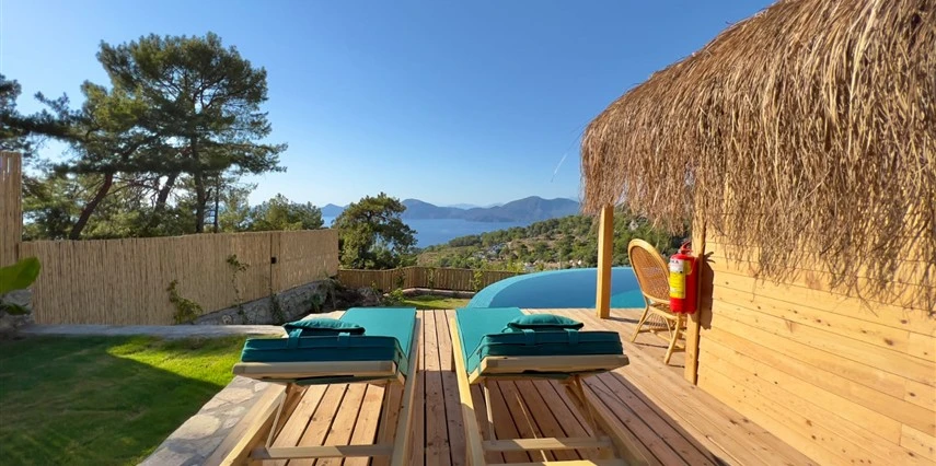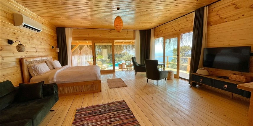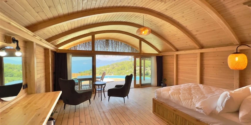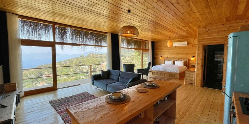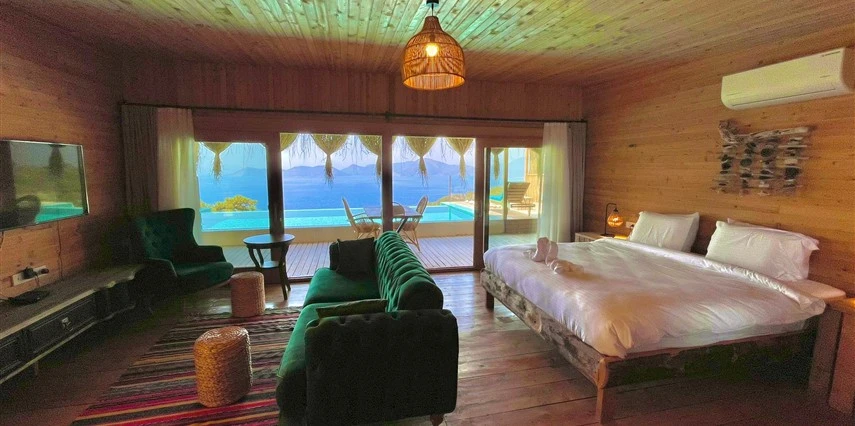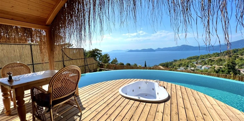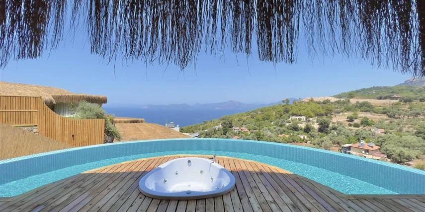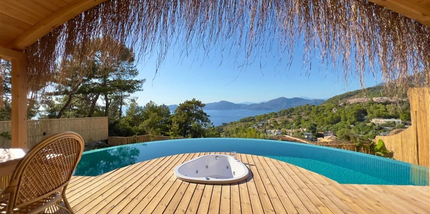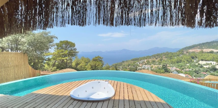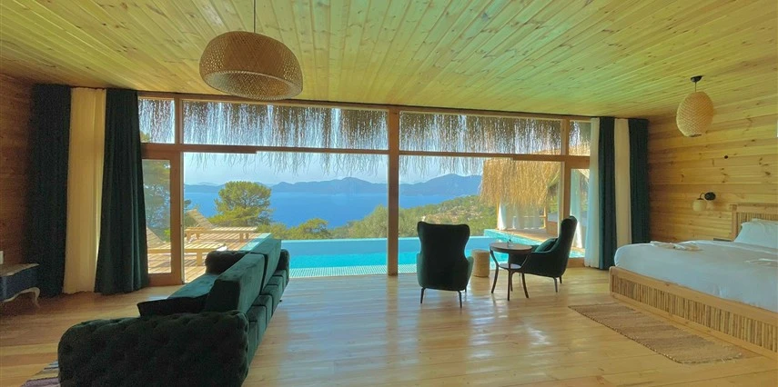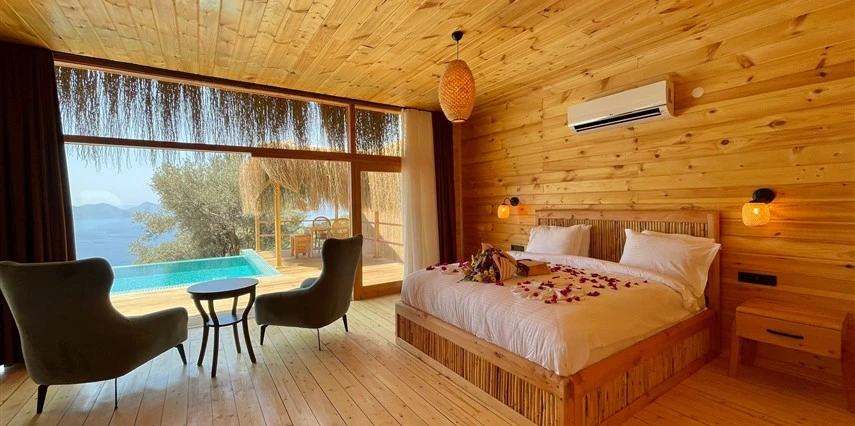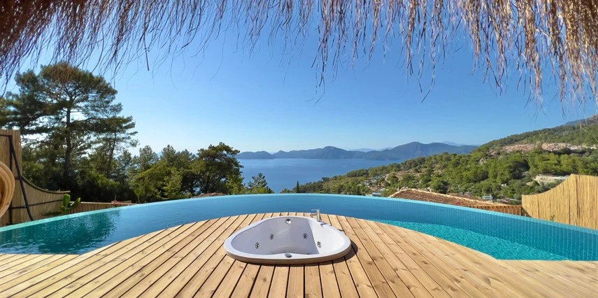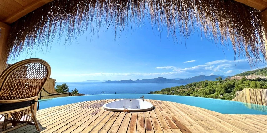 Fethiye'nin huzur veren doğasında misafirlerini ağırlayan Seaview Faralya Otel, sedir ağaçlarından tasarlanmış mimarisiyle sizi evinizde hissettiriyor.