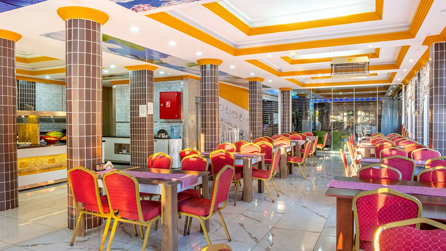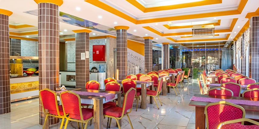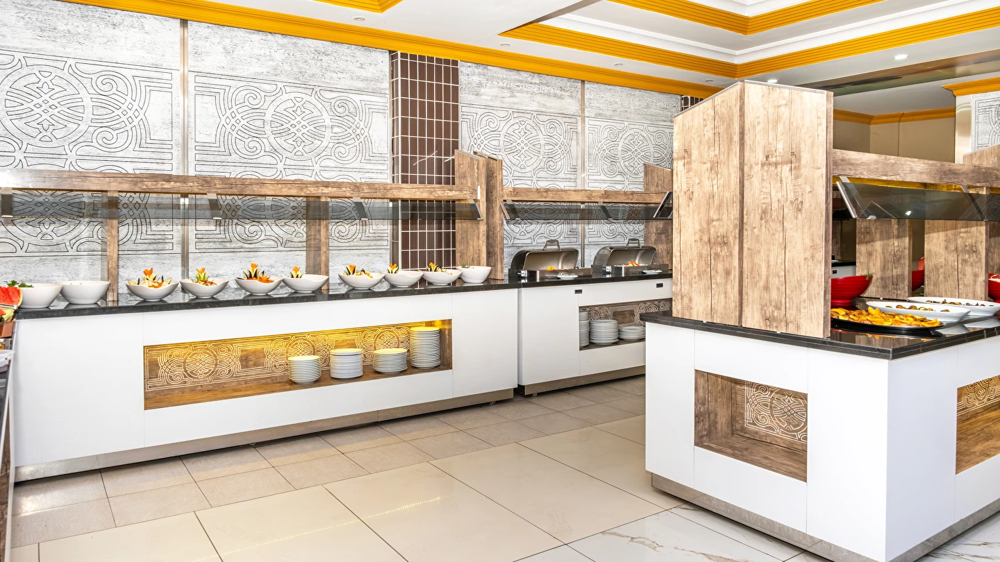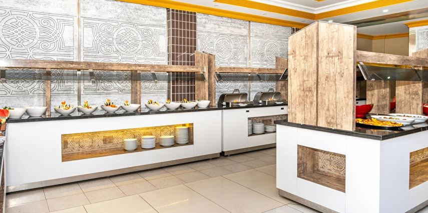 Alkolsüz Her Şey Dahil Konseptinde; Sabah kahvaltısı, öğle ve akşam yemekleri açık büfe sunulmaktadır. Yeterli misafir sayısı olmadığı durumlarda set menü veya A'La carte servisi yapılmaktadır. Tesisin belirlemiş olduğu markalar dahilinde alkolsüz yerli içecekler 22:00'a kadar geçerlidir. Bardakta sunulan alkolsüz içecekler ücretsizdir.