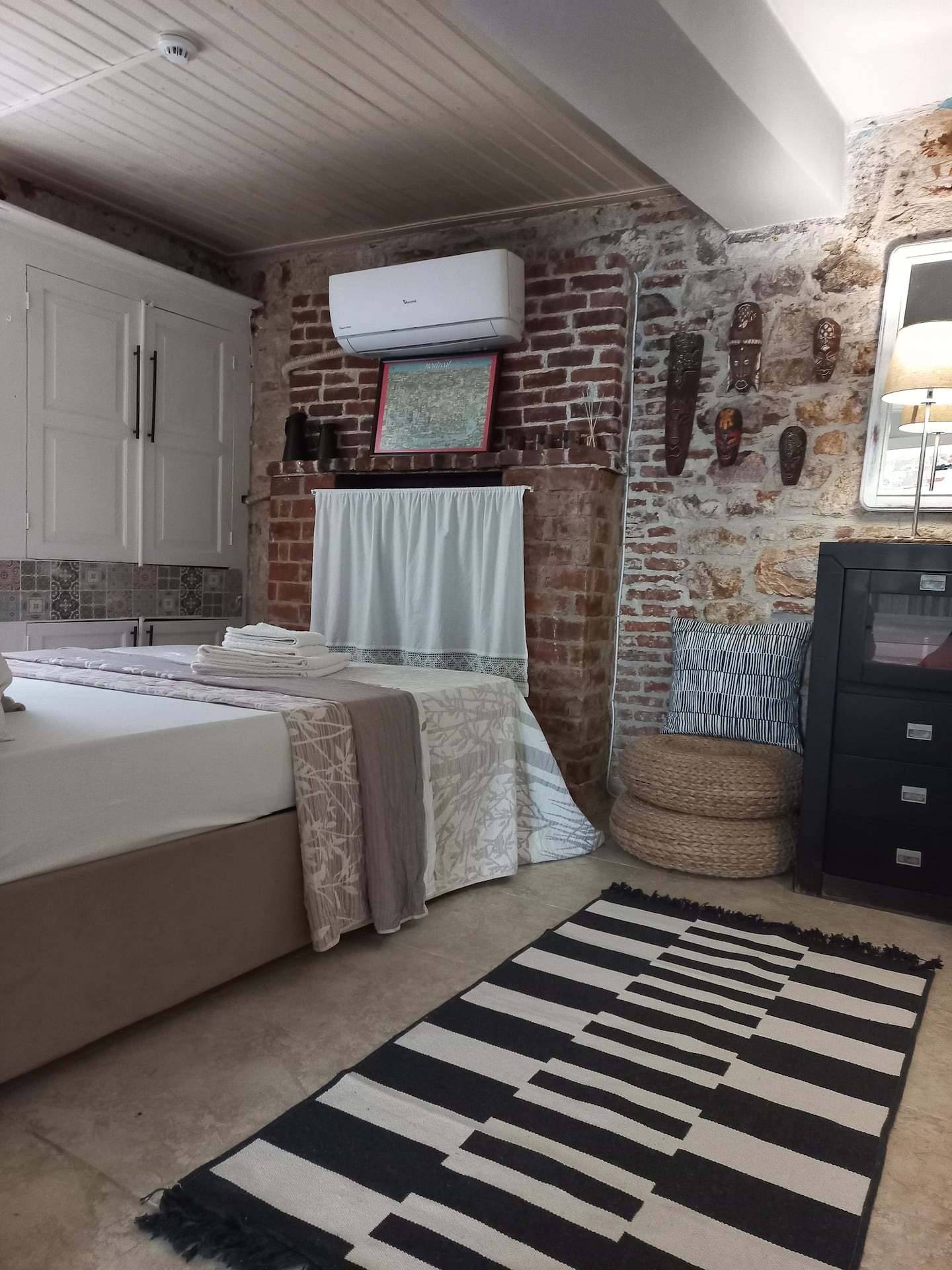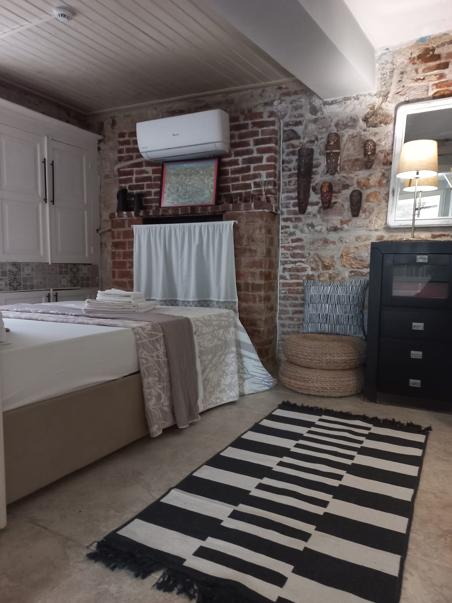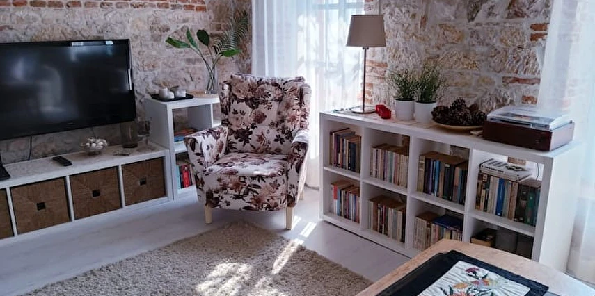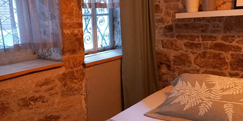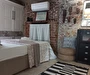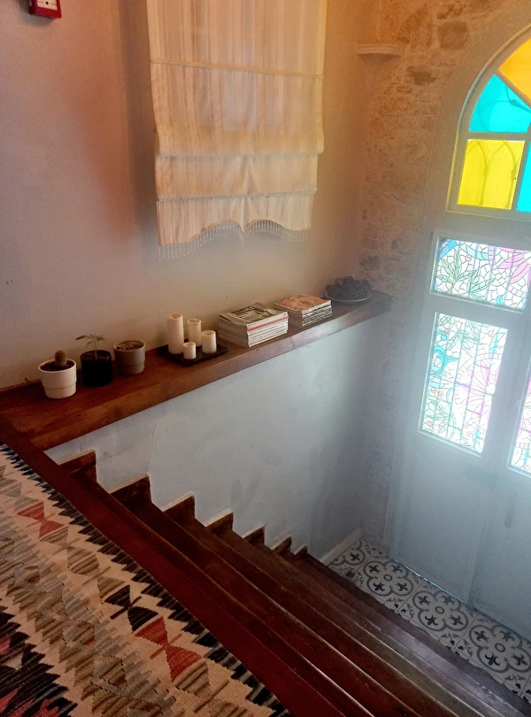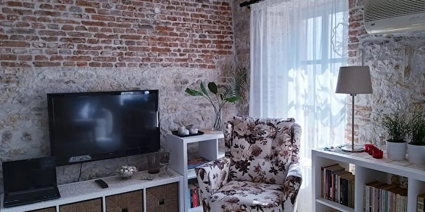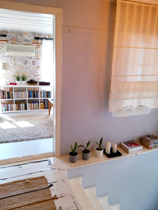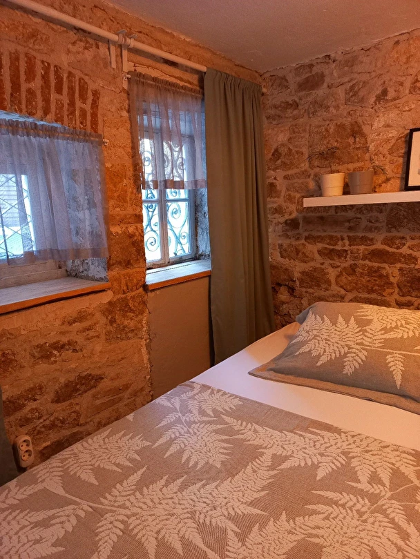 Komple kiralanabilen taş evimiz 3 katlıdır ve toplamda 5 kişiye kadar konaklama imkânı sunmaktadır. Üçüncü katta biri çift kişilik yataklı, diğeri tek kişilik yataklı olmak üzere iki yatak odası, bir banyo, mutfak ve hol bulunmaktadır. Mutfakta bulaşık makinesi, buzdolabı ve çamaşır makinesi gibi temel ihtiyaçları karşılayacak ekipmanlar yer almaktadır. İkinci katta bir yatak odası, bir oturma salonu ve bir banyo bulunurken, giriş katında banyolu ve tek kişilik yataklı bir oda yer almaktadır.