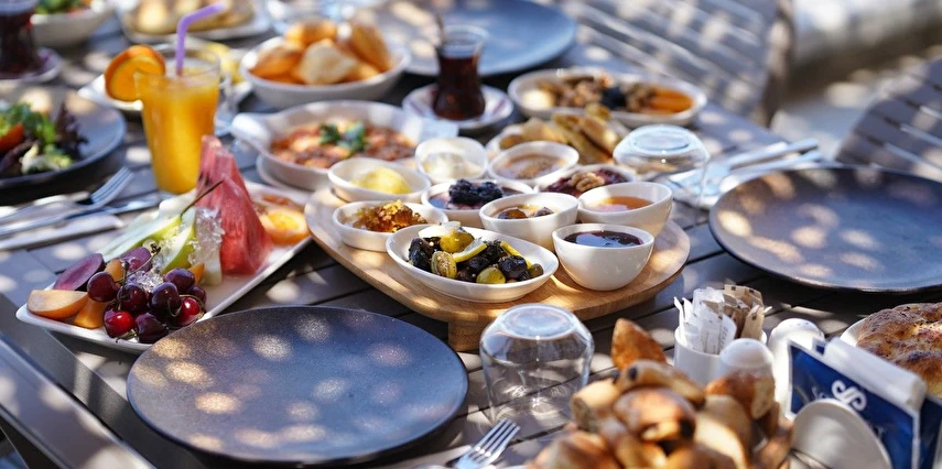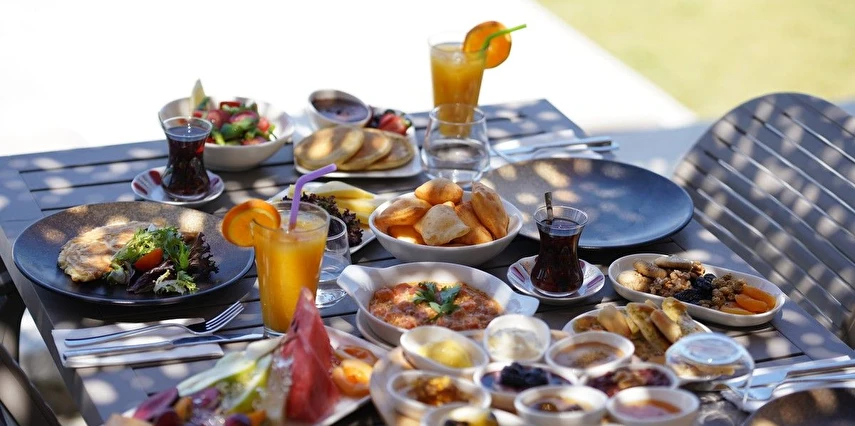 Çok zengin serpme kahvaltı, öğle yemeği, akşam yemeği şeklinde olup, kahvaltıda meyve ve ekmek ile müsli çeşitleri büfede self servis edilmektedir. Sıcak yemekler ise show mutfak ünitelerinden a la minute olarak hazırlanıp misafirlerin servis personeli tarafından masalarına hizmet edilmektedir. Bunlar omlet, pankek, pişi, yağda kızartılan şarküteri ürünleri olarak yapılır. Kahvaltıda çay, filtre kahve, süt, taze sıkılmış portakal suyu ve su ücretsiz olarak sunulmaktadır.