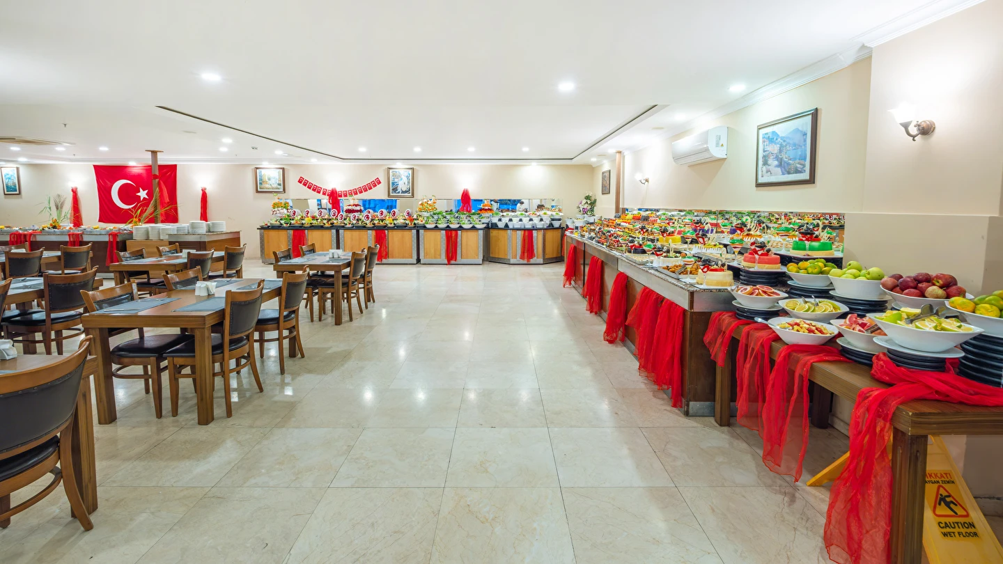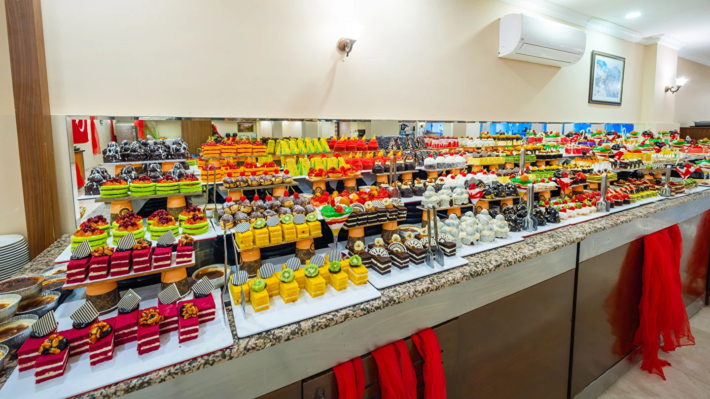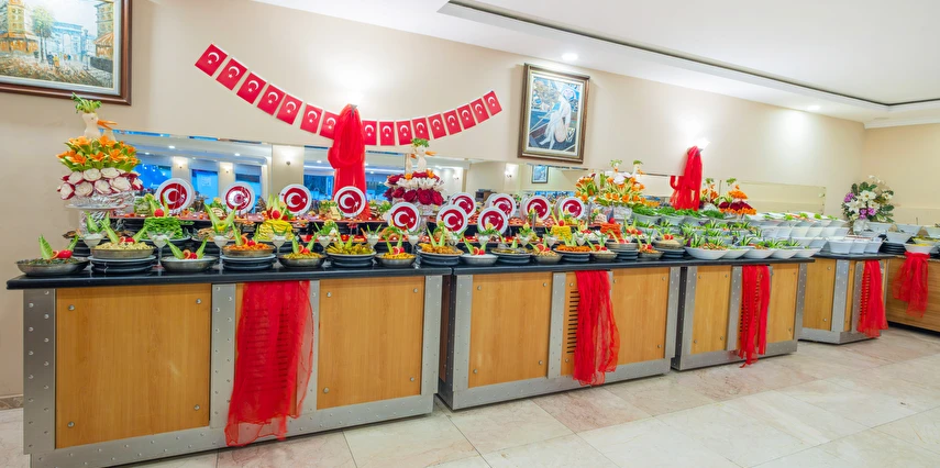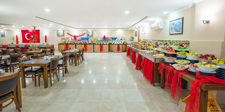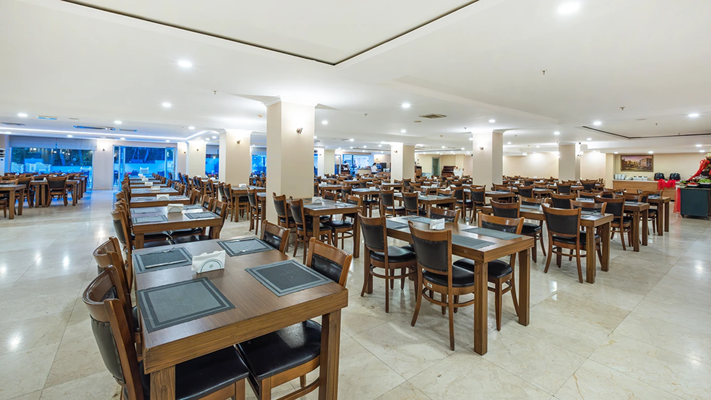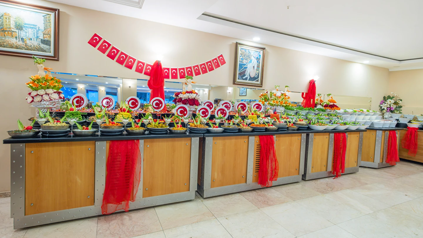 Sabah kahvaltısı, öğle yemeği ve akşam yemeği açık büfe olup, tesisin belirlemiş olduğu markalar dahilinde yerli alkollü ve alkolsüz içecekler 10:00 ile 23:00 saatleri arasında ücretsizdir. İthal içecekler, taze meyve suları, Türk kahvesi, tüm şişe ve teneke içecekler ücretlidir.