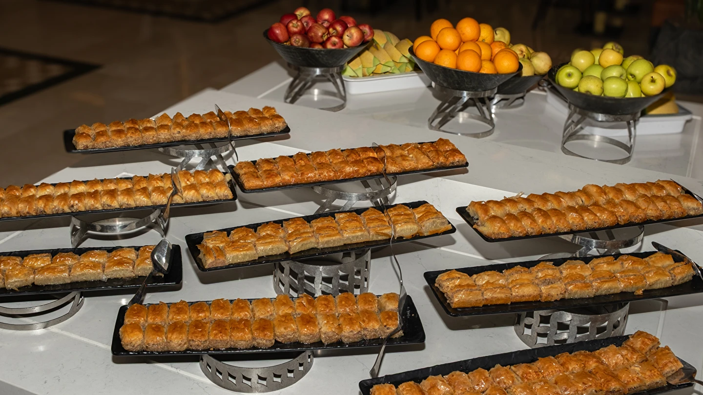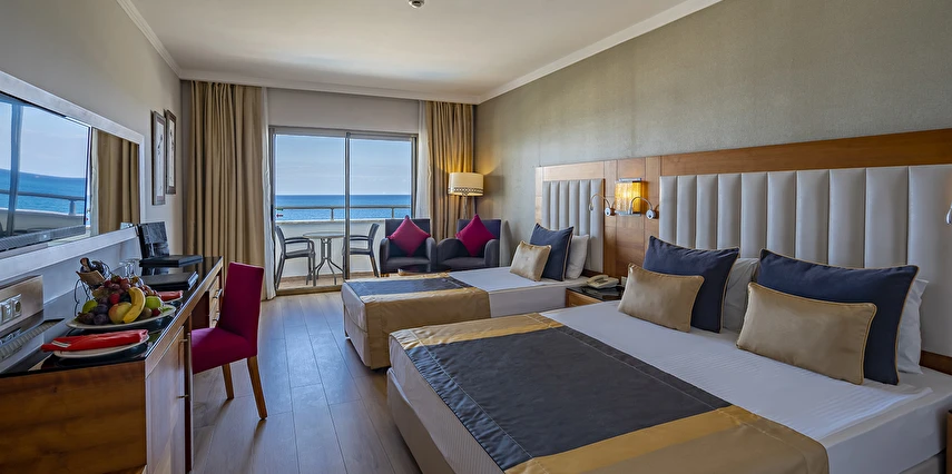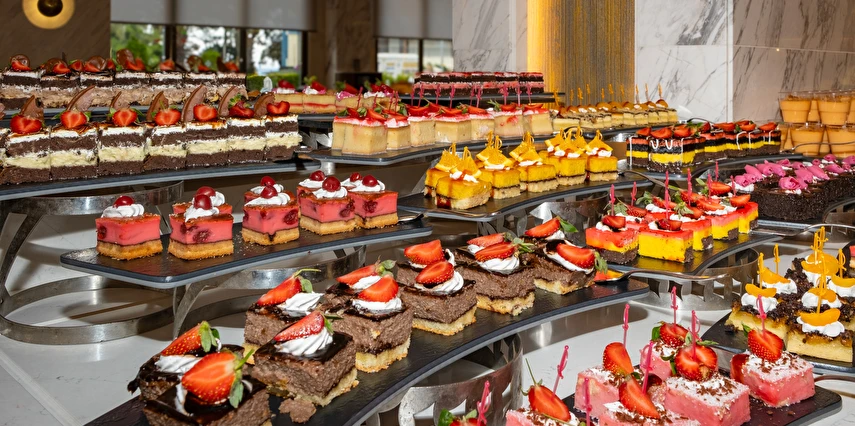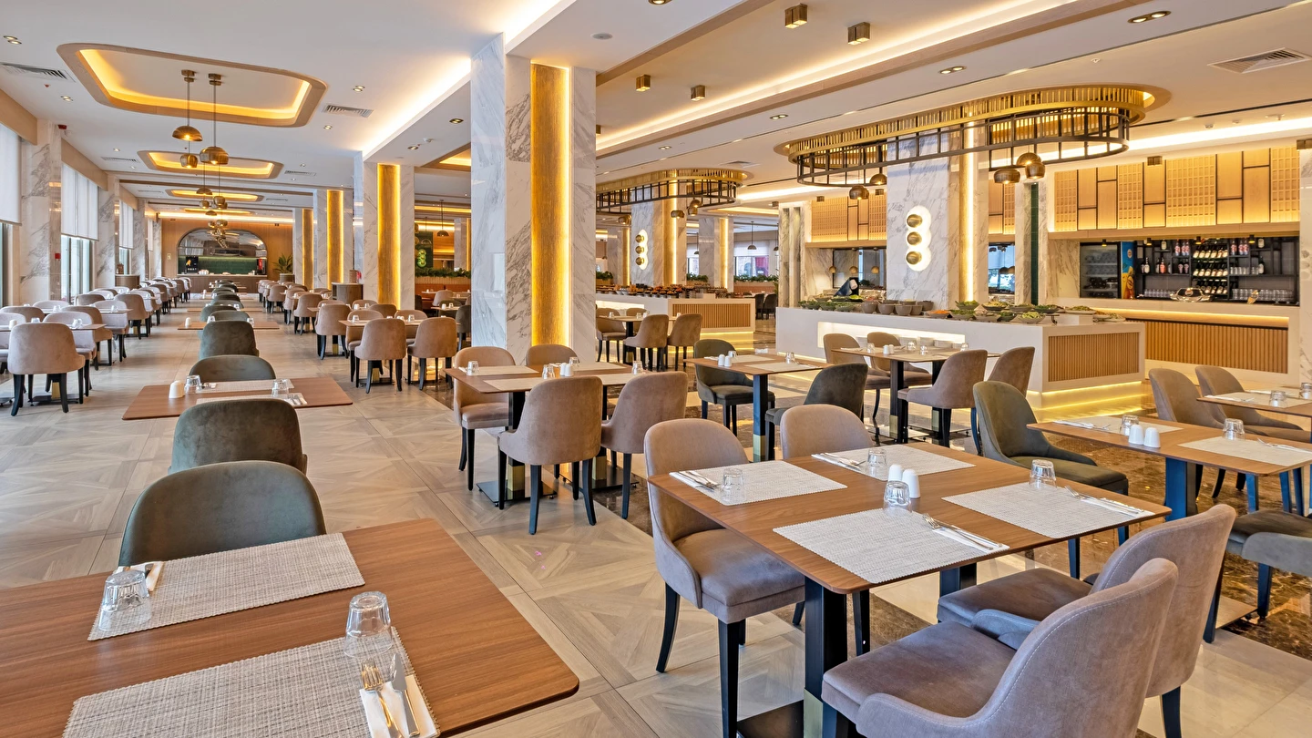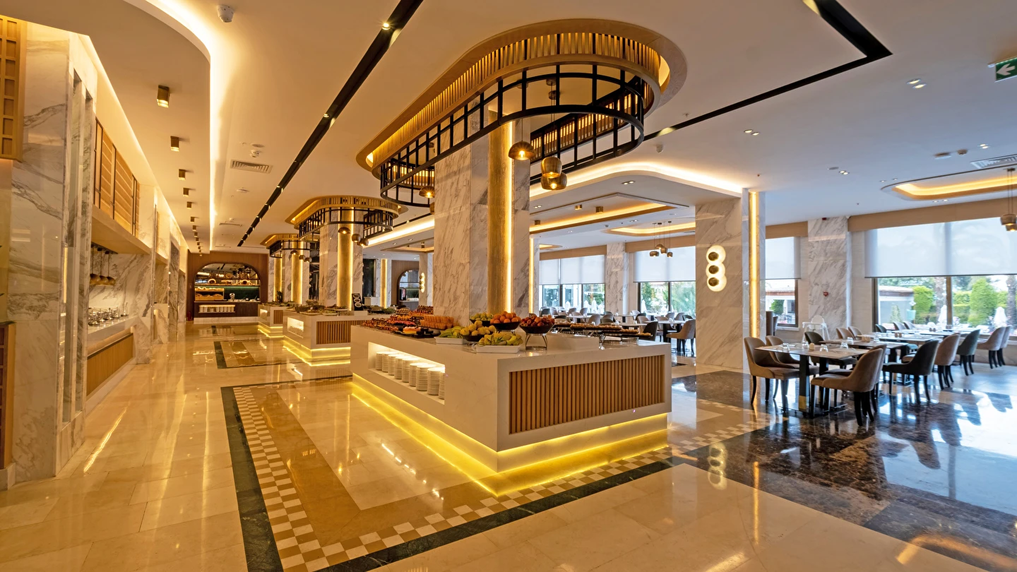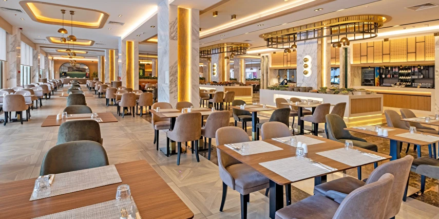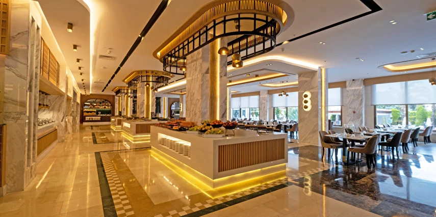 Sabah kahvaltısı, öğle ve akşam yemekleri açık büfe olup, tesisin belirlemiş olduğu markalar dahilinde ithal yabancı, yerli alkollü ve bazı import içecekler, alkolsüz içecekler 10:00 ile 24:00 saatleri arasında ücretsizdir.