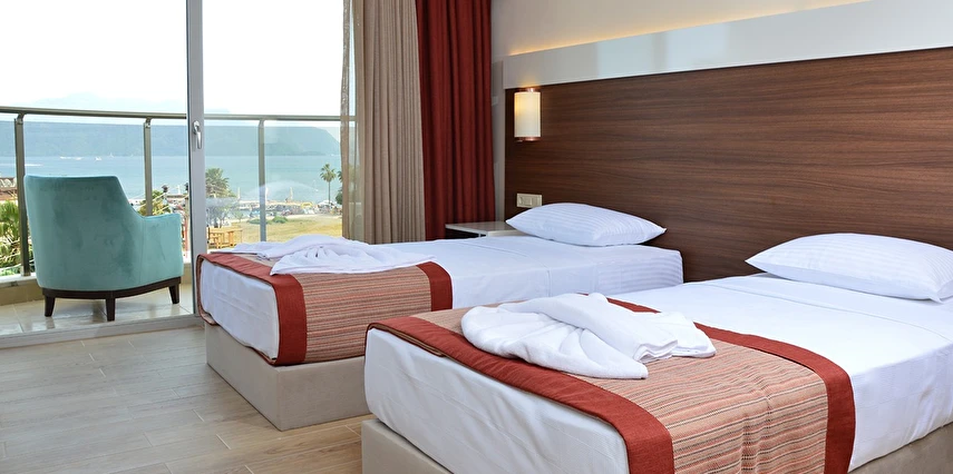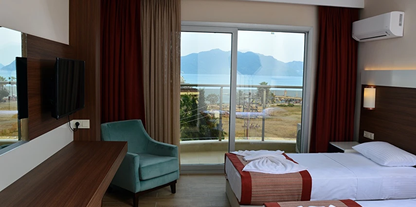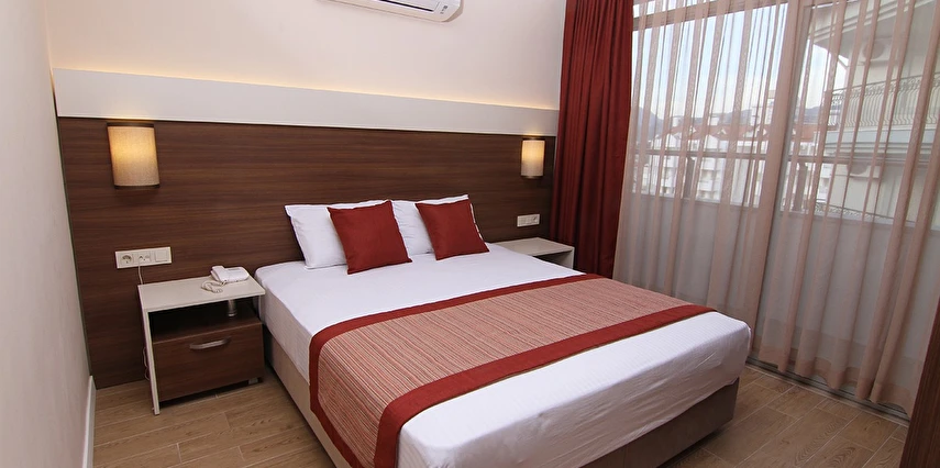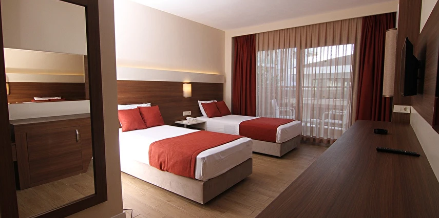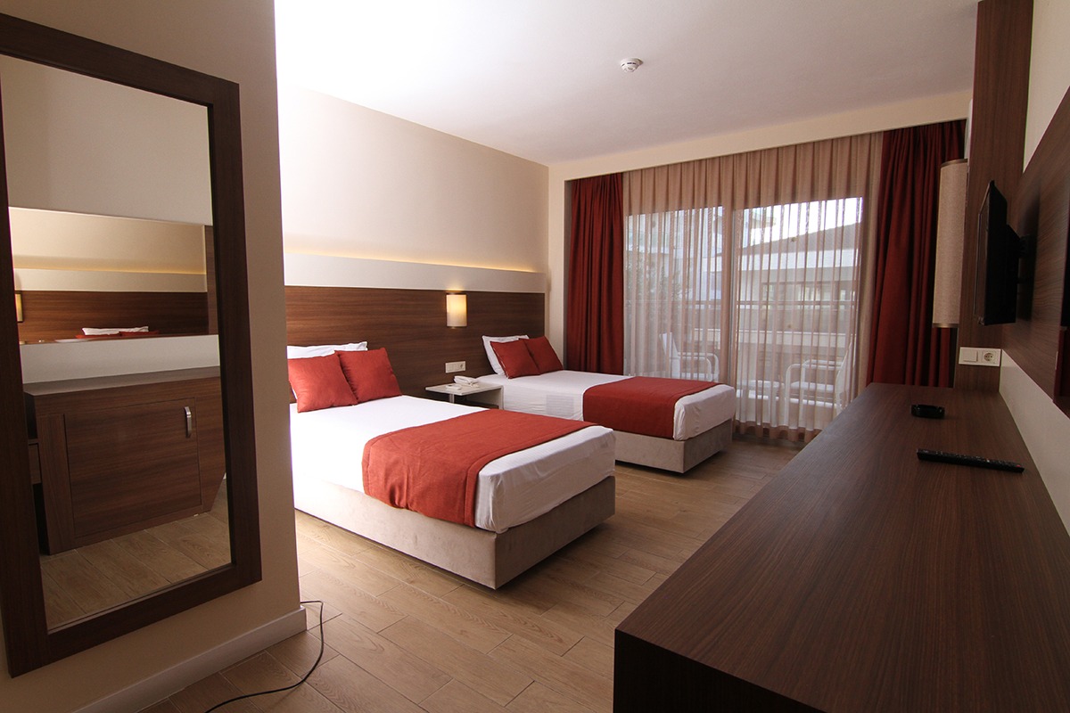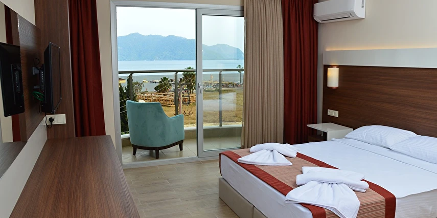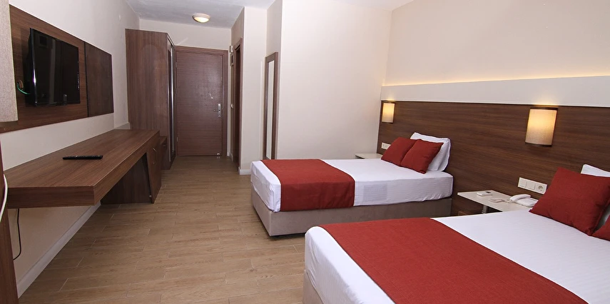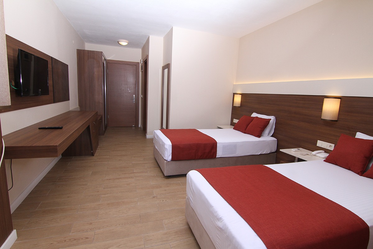 24 saat resepsiyon hizmeti verilen tesisimiz ücretsiz wi-fi internet erişimi de sunmaktadır. Tüm odalarımızda balkon, klima, TV, telefon, mini bar, kiralık kasa ve banyolarımızda saç kurutma makinesi bulunmaktadır. ayrı olan çocuk havuzumuzda ve oyun parkımızda çocuklarınız güven içinde oynarken siz geniş terasımızda havuzun ve güneşin tadını çıkarabilirsiniz. 1 Haziran 2018 tarihinde açılan otelimiz sahile 50 metre mesafede ailelere geniş ve konforlu odalarımızda huzurlu bir tatil imkanı sunmaktadır.