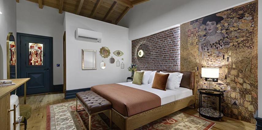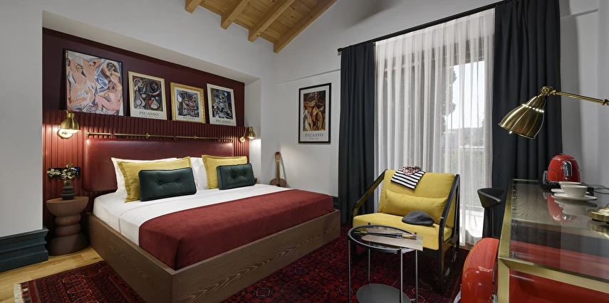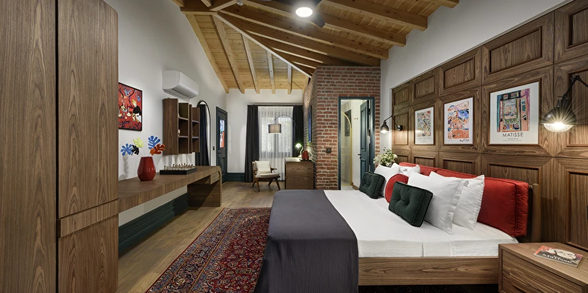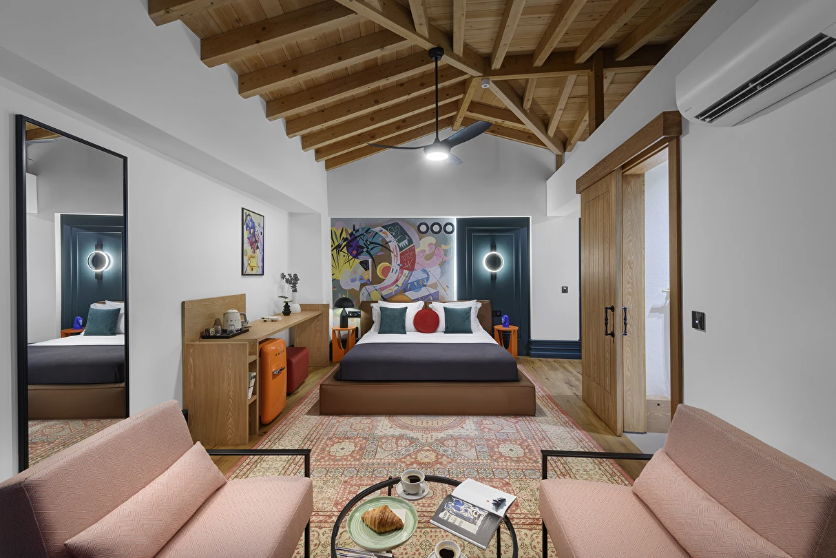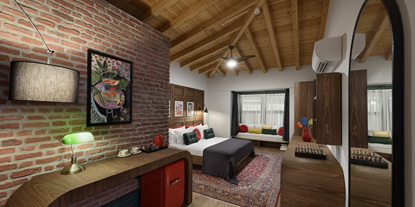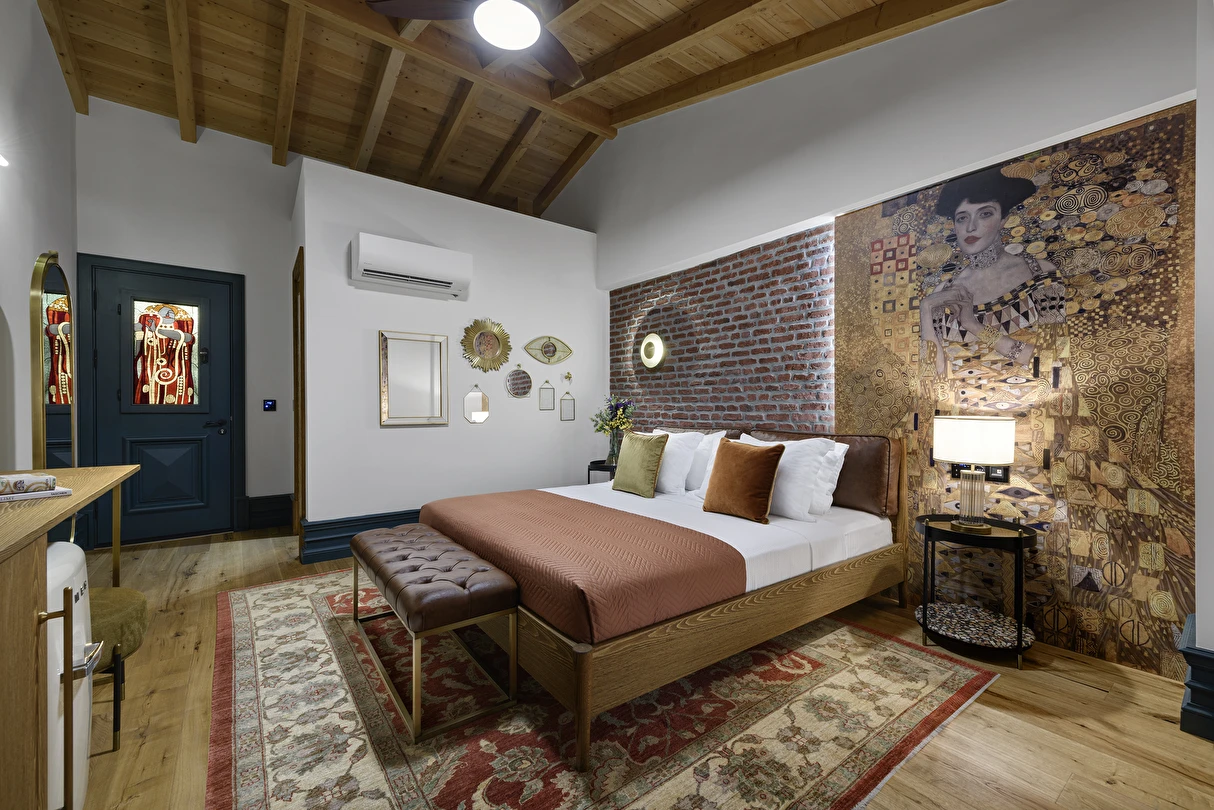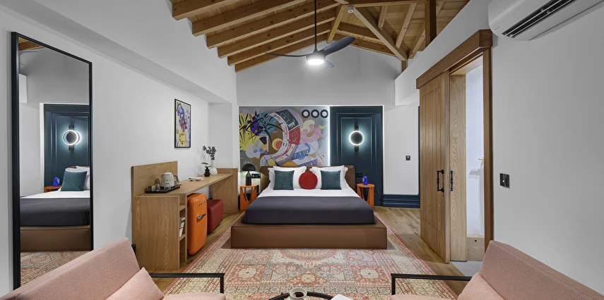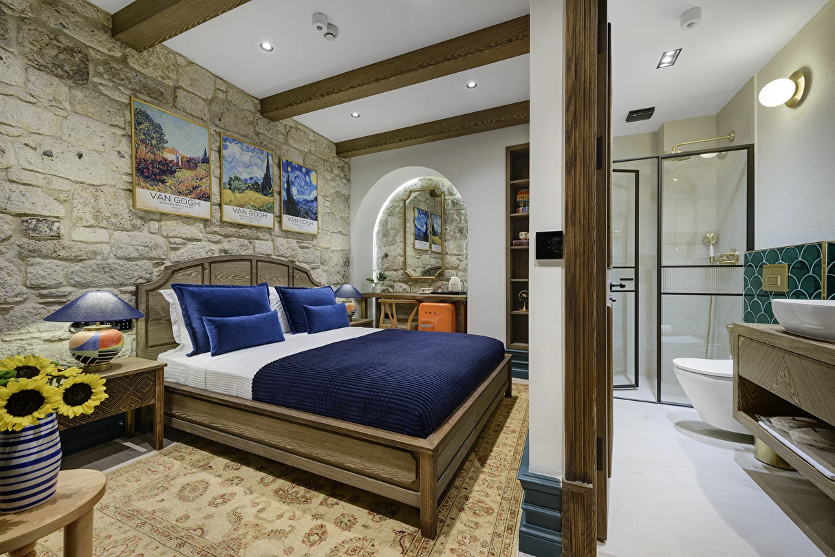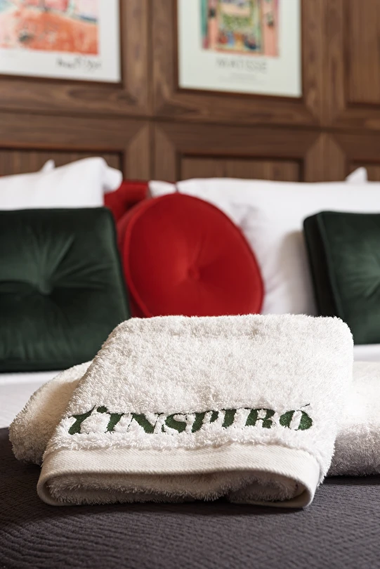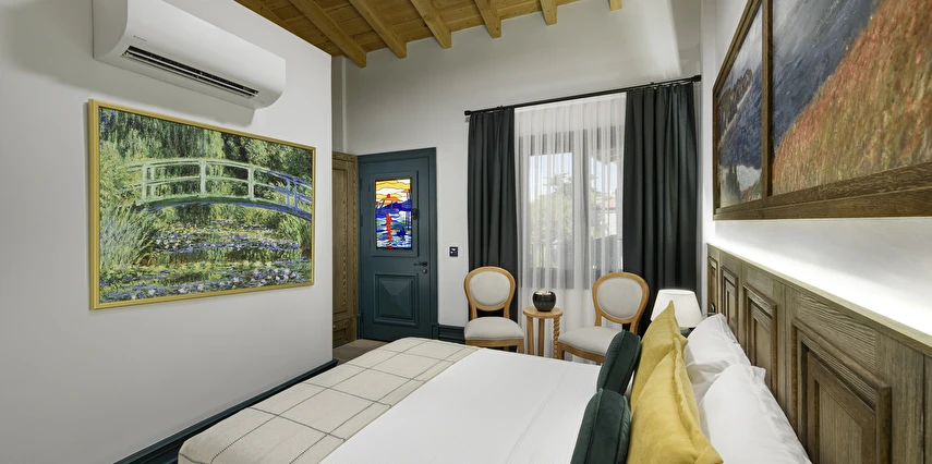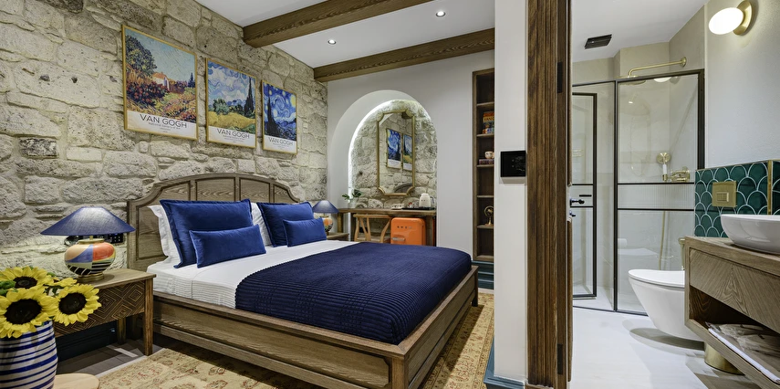 Alaçatı'nın kıvrımlı, beyaza bürünmüş sokaklarının kalbinde, begonvillerin eski taş duvarlara tırmandığı, zamanın esintiden daha yavaş aktığı bir dünyada Tinspiro sessizce duruyor. Burası sadece bir otel değil. Sadece bir kafe de değil. Tinspiro, yaşayan bir galeri, nefes alan bir tuval ve renk, mekân, doku ve tat aracılığıyla anlatılan özenle kurgulanmış bir hikaye sunan duyusal bir kaçış noktasıdır. Benzersiz tasarlanmış yedi odamızın her biri efsanevi bir sanatçıya bir övgüdür: Van Gogh, Mondrian, Monet, Picasso, Kandinsky, Matisse ve Klimt. Duvarların dokusundan çarşafların paletine kadar, her ayrıntı sanatçının ruhunun özenle seçilmiş bir yansımasıdır. En kaliteli materyallerle özel tasarlanmış mobilyaları ve geniş olanaklarıyla bu sanatsal odalar sizlere ev konforunu lüks ile mükemmel bir şekilde harmanlayan bir tecrübe sunar.