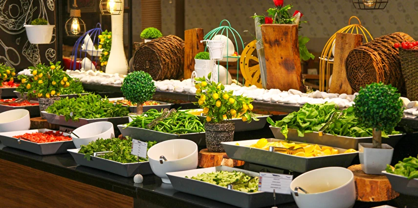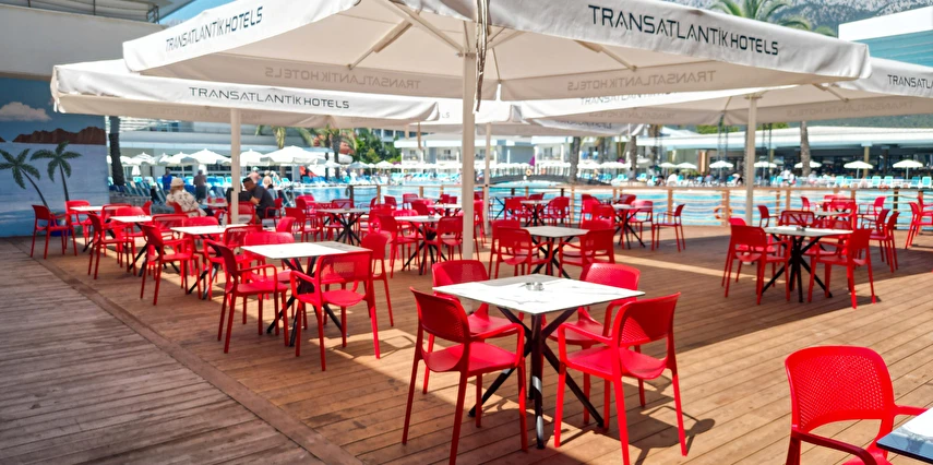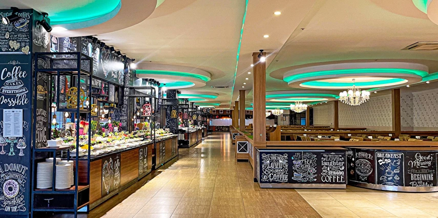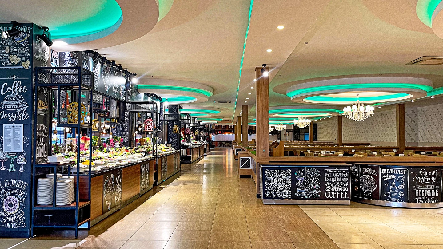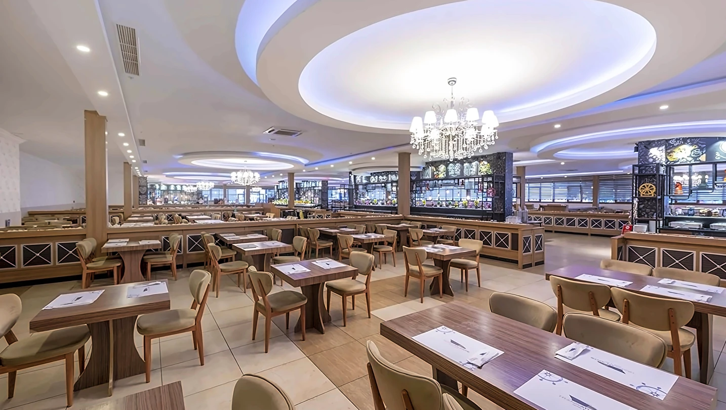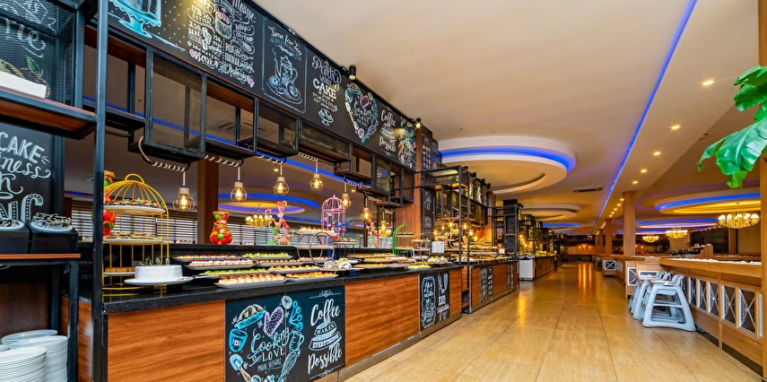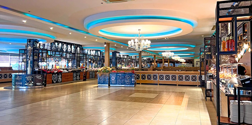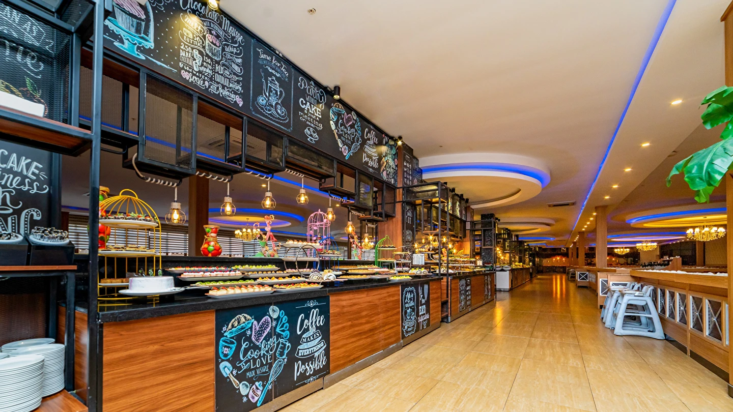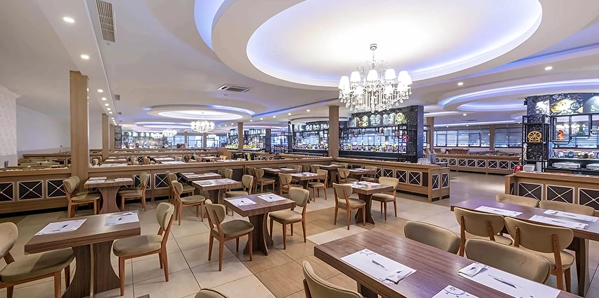 Sabah kahvaltısı, öğle ve akşam yemekleri açık büfe olup tesisin belirlediği markalar dahilinde ithal ve yerli alkollü, alkolsüz içecekler 24 saat ücretsizdir. Tüm şişe içecekler ,taze sıkılmış portakal suyu (kahvaltı ve geç kahvaltıda), doğum günü pastası ücretlidir. Sıcak içecekler ve Türk kahvesi ücretsizdir.
