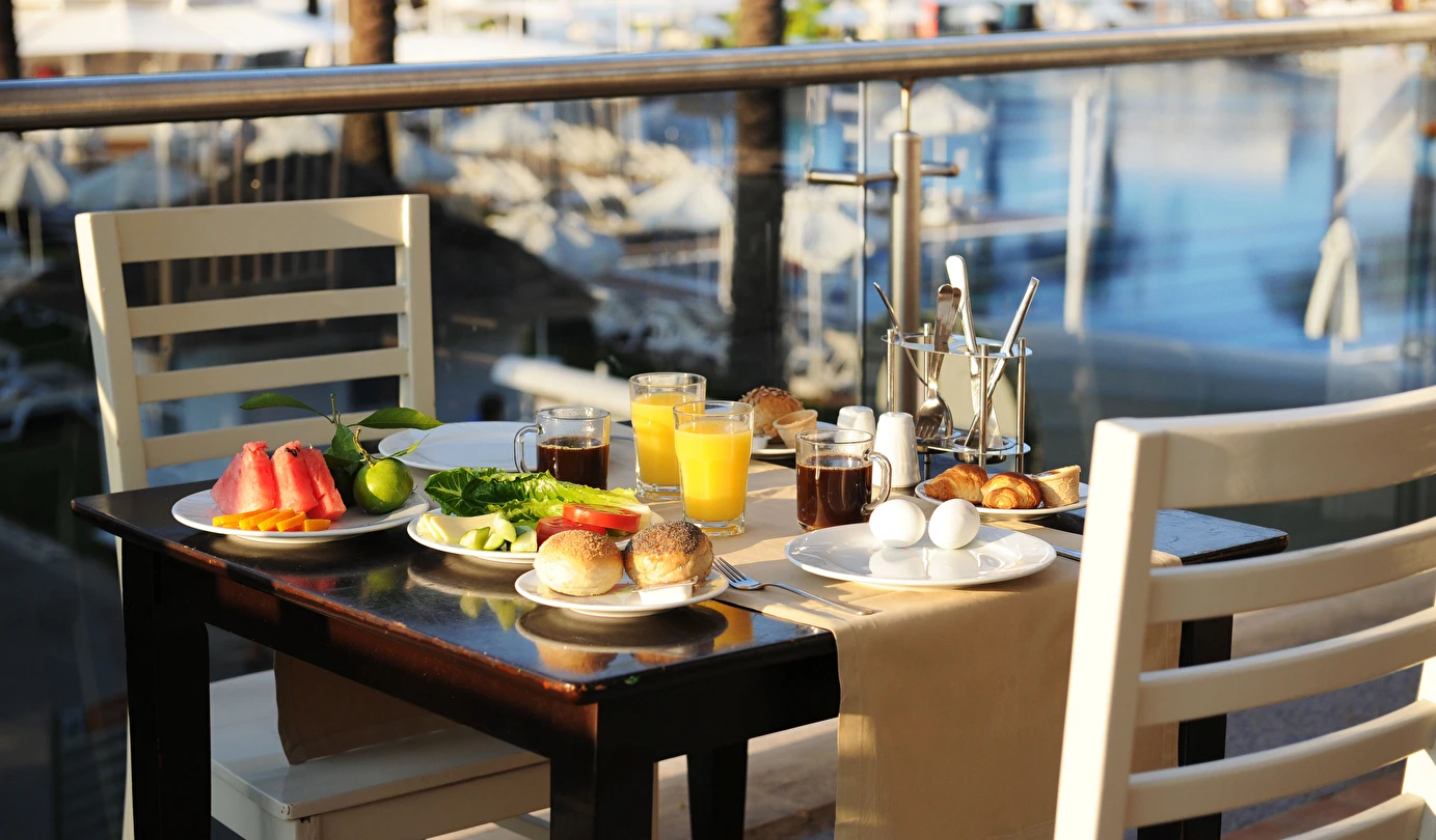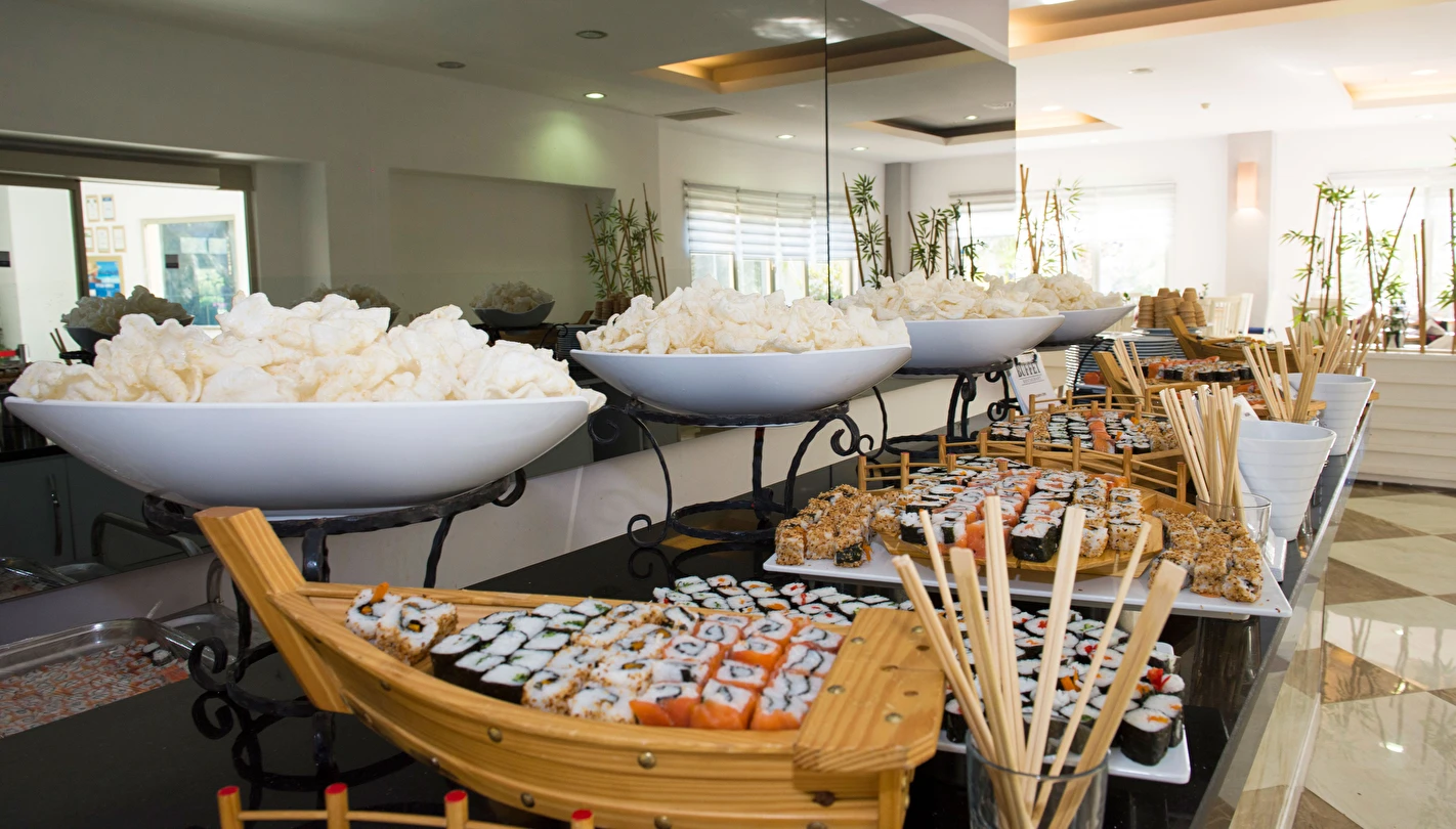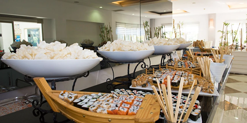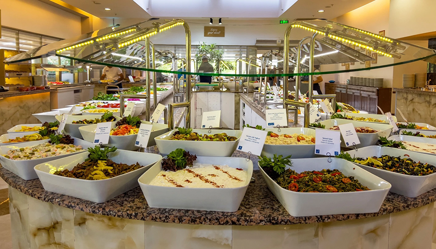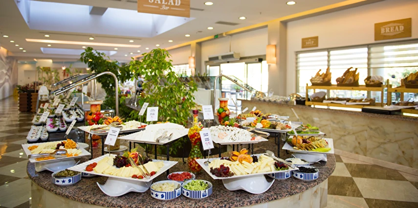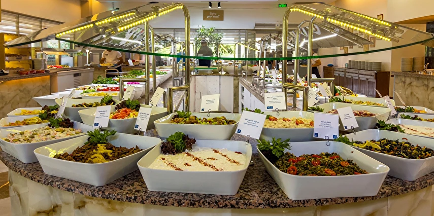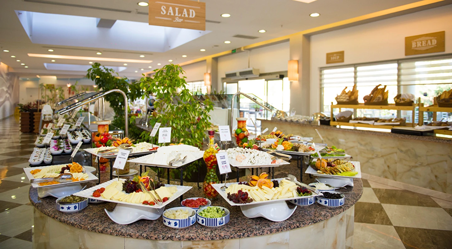 Sabah kahvaltısı, öğle ve akşam yemekleri açık büfe olup tesisin belirlediği markalar dahilinde yerli alkollü ve alkolsüz içecekler 10:00 ile 24:00 saatleri arasında ücretsizdir. Türk Kahvesi ücretsizdir.