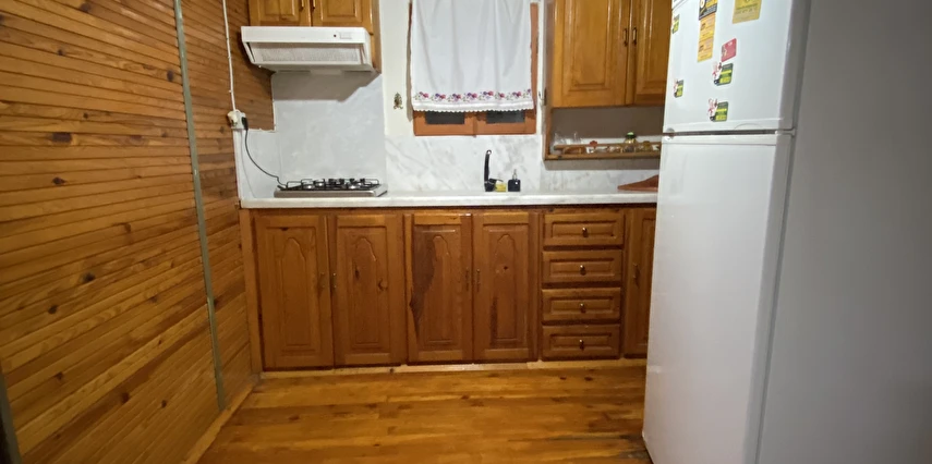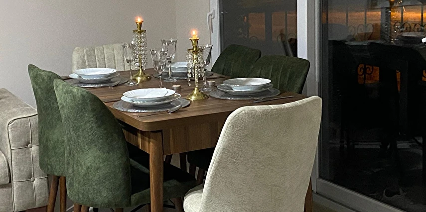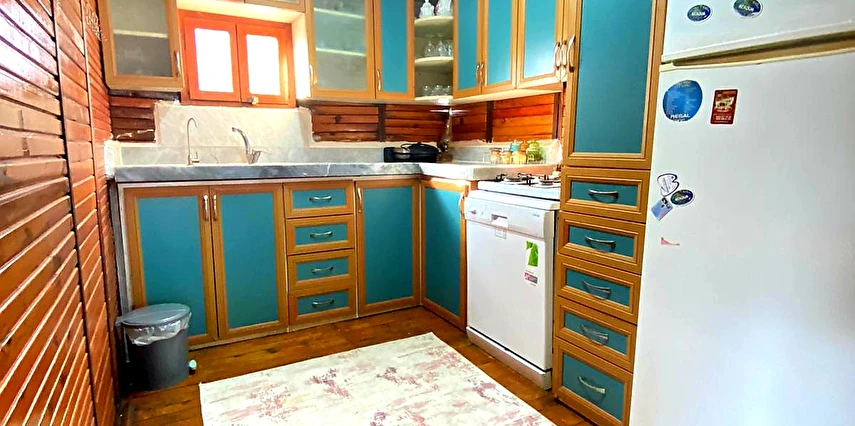 Tam Donanımlı Mutfak:Kendi yemeklerinizi hazırlayabileceğiniz ocak, buzdolabı, mutfak gereçleri ve yemek masası.