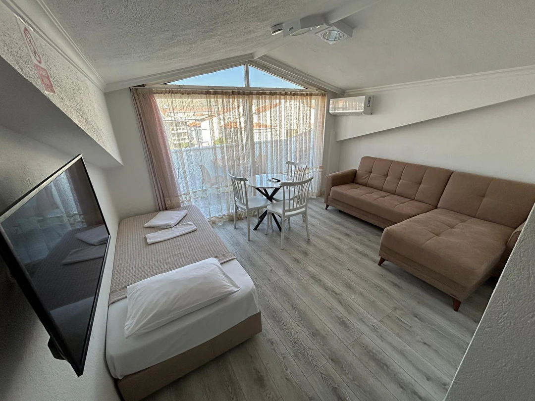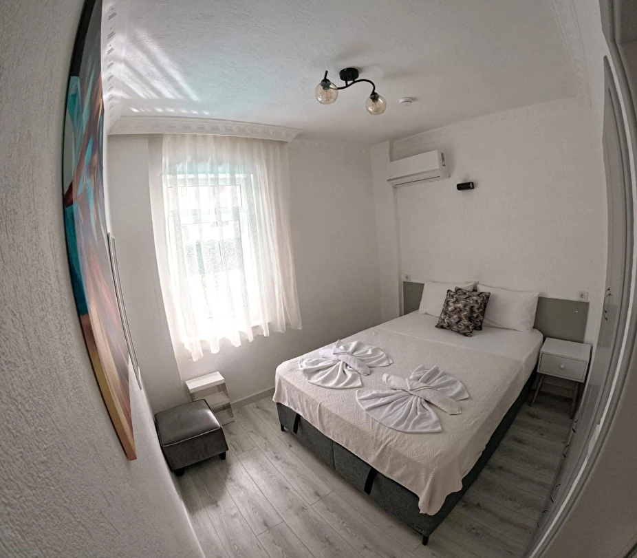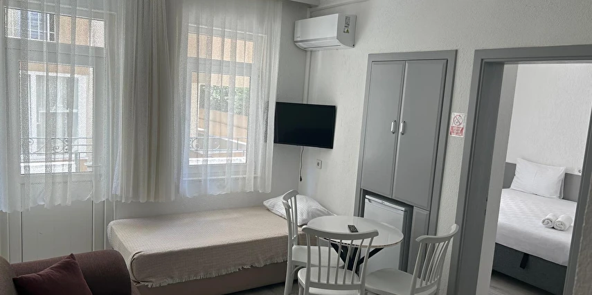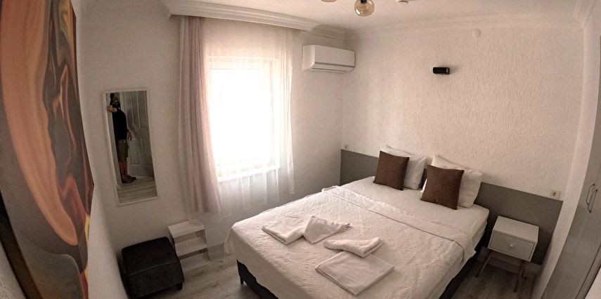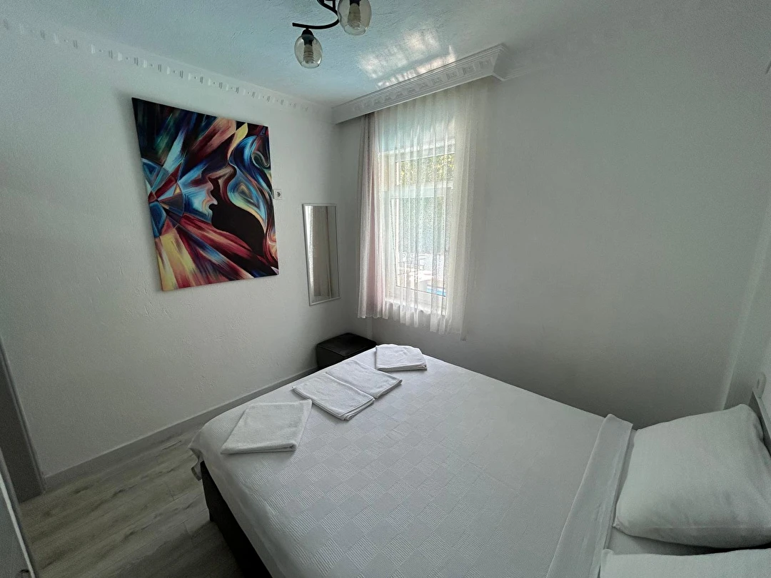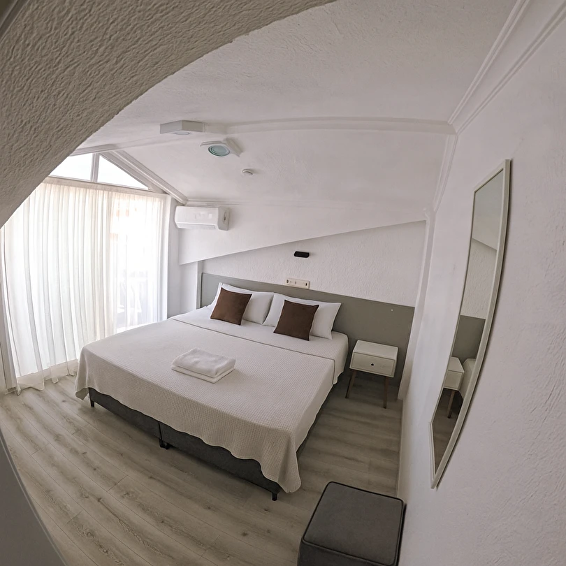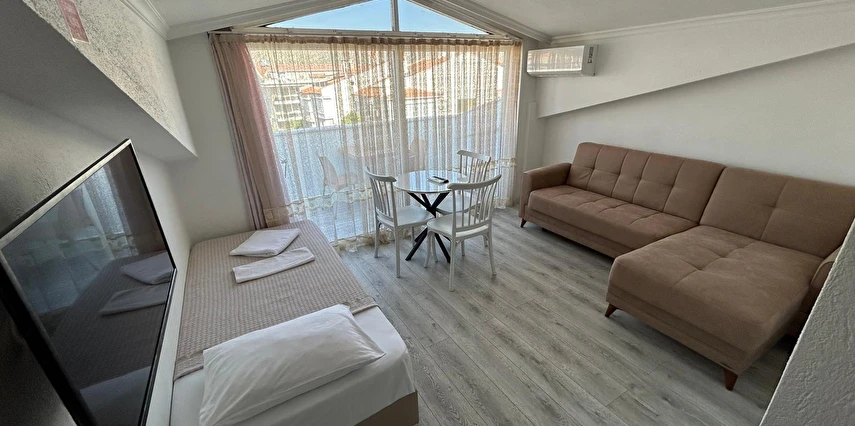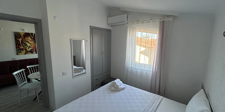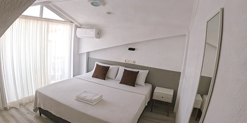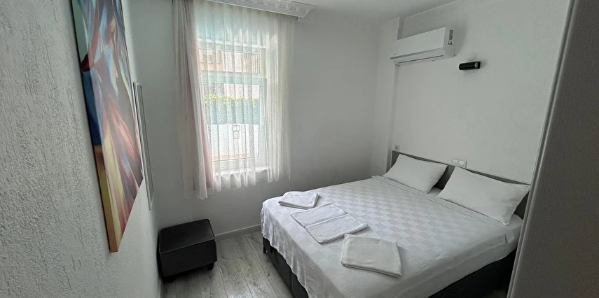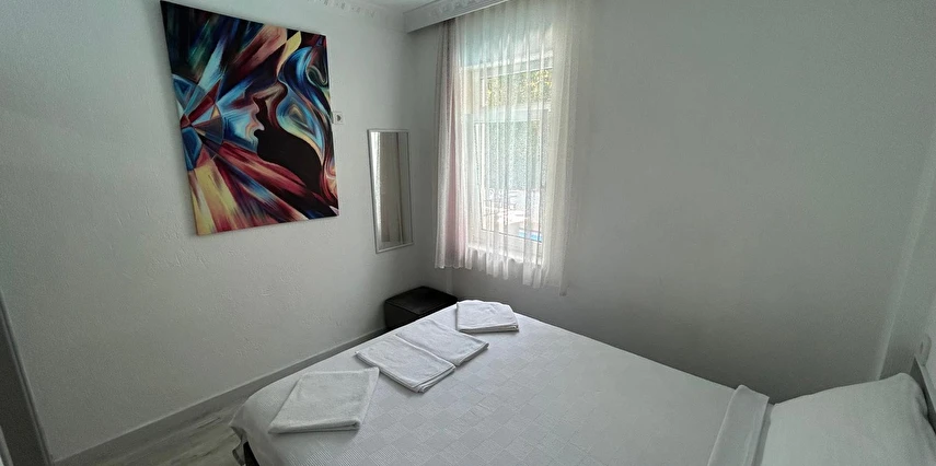 Tesisimiz 2024 ve 2025 yıllarında yenilenen 16 adet 1+1 daireden oluşmaktadır. Aile oteli konsepti ile dizayn edilmiş otelimizde her dairede, 1 adet yatak odası, 1 adet açık mutfağa sahip yaşam odası, 1 adet banyo-WC bölümü ve balkon yer almaktadır. Otelimizin tüm dairelerinde yatak odasında ayrı, yaşam odasında ayrı olmak üzere, ses desibeli çok düşük, yeni nesil 2024 yılında hizmete alınan 2 adet oldukça sessiz klima mevcuttur. Çift klimalı sistem sayesinde yatak odasında ve yaşam odasında ayrı ayrı konfor ortamı sağlanmıştır. Dairelerimizdeki tüm yataklar çift kişiliktir. Daire büyüklüklerimiz 35m2, 40 m2 ve 45 m2 olmak üzere farklı tarzlarda dizayn edilmiştir. Otelimiz yüksek zemin kat, 1.kat, 2.kat ve çatı katından oluşmakta olup; merdivenleri geniş ve havadardır. Asansör bulunmamaktadır.