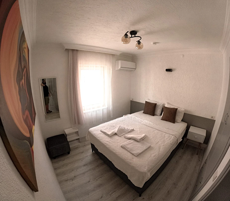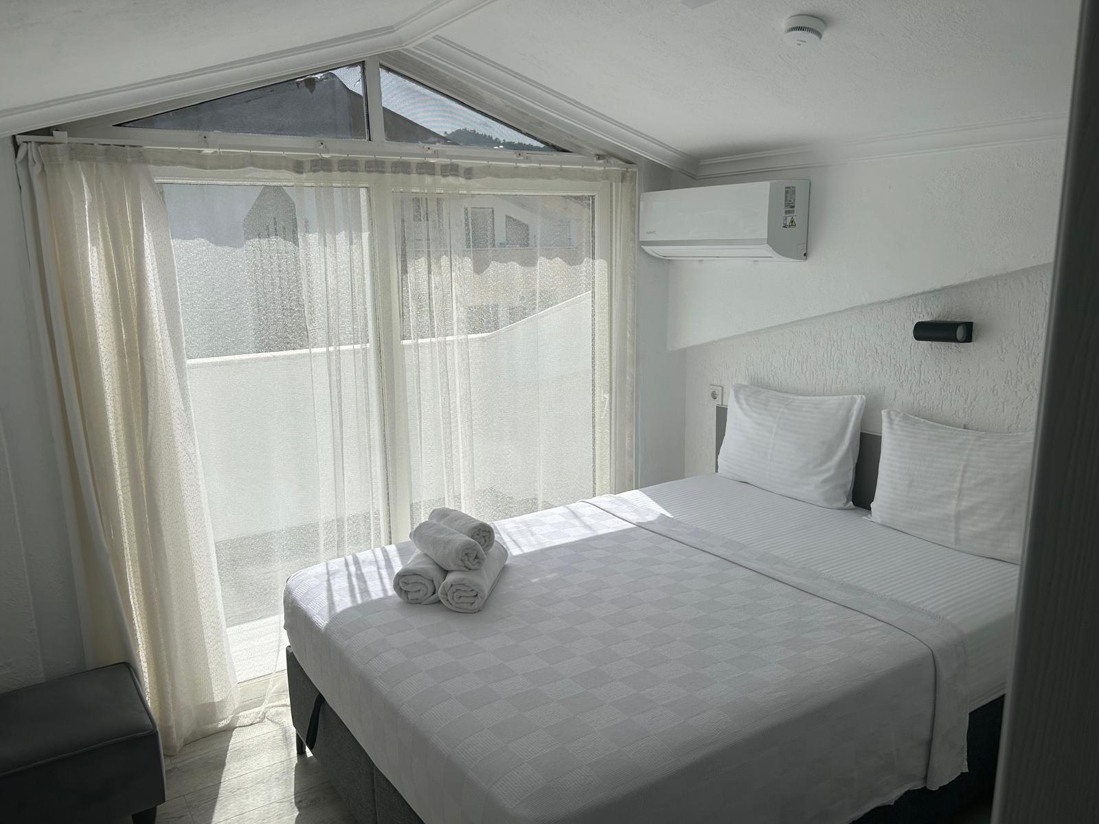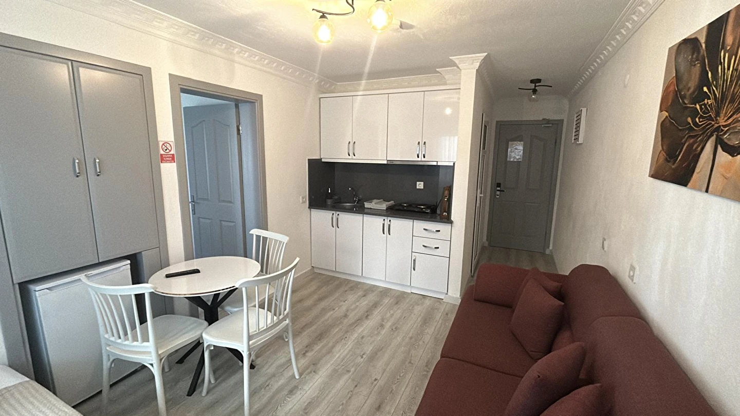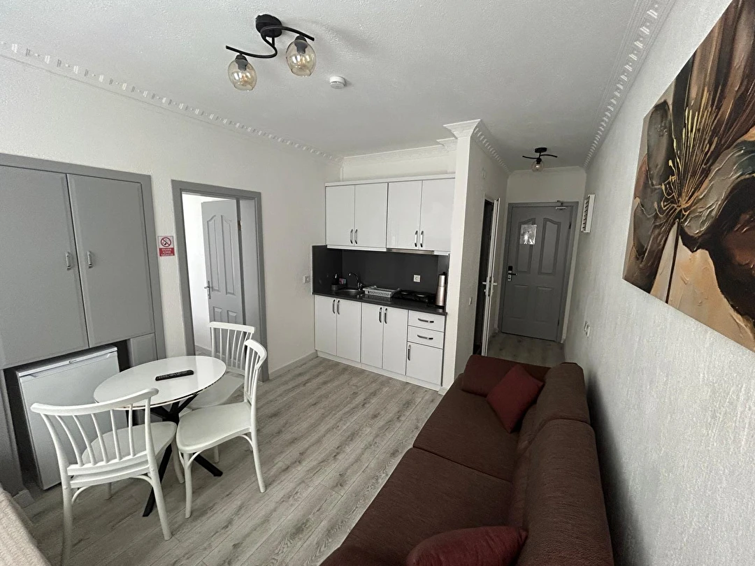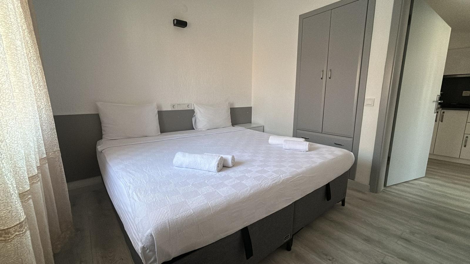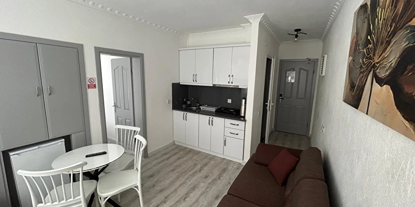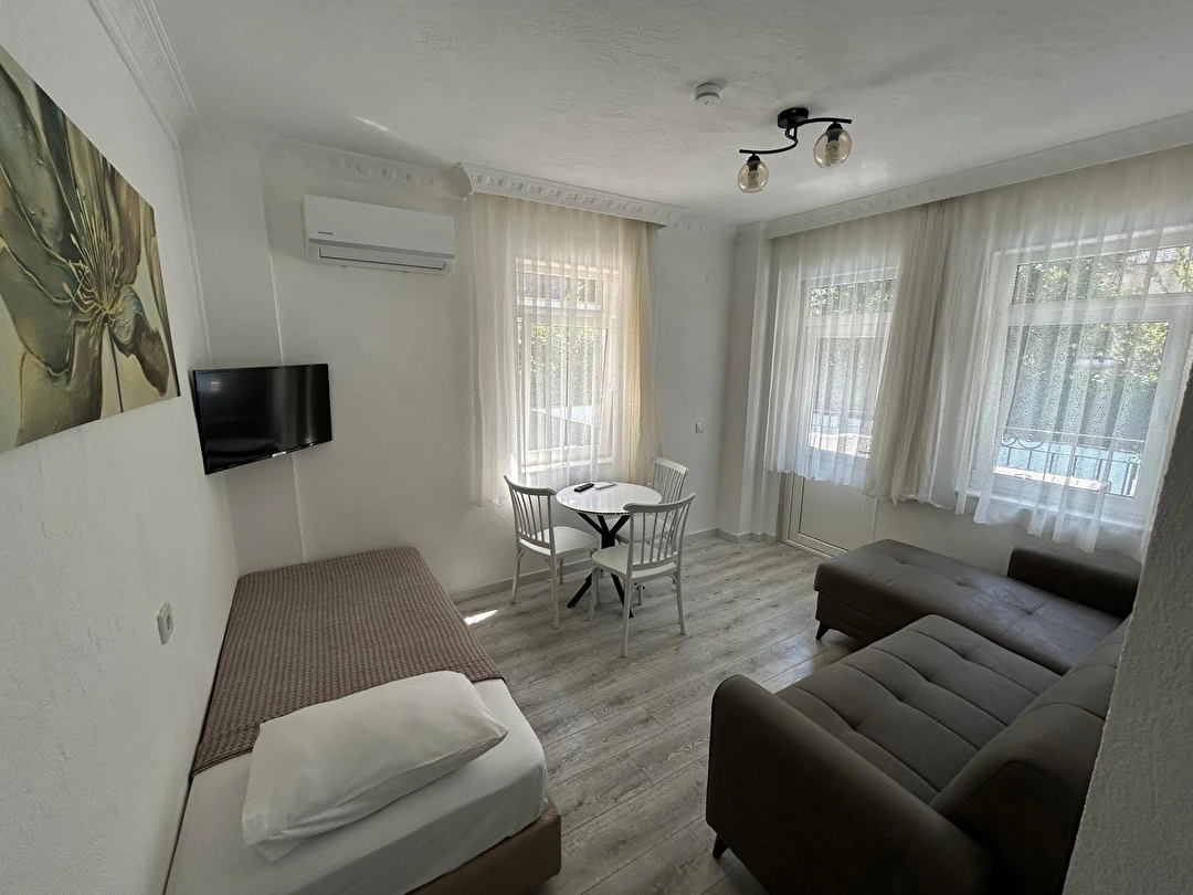 Tesisimiz 2024 ve 2025 yıllarında yenilenen 16 adet 1+1 daireden oluşmaktadır. Aile oteli konsepti ile dizayn edilmiş otelimizde her dairede, 1 adet yatak odası, 1 adet açık mutfağa sahip yaşam odası, 1 adet banyo-WC bölümü ve balkon yer almaktadır. Otelimizin tüm dairelerinde yatak odasında ayrı, yaşam odasında ayrı olmak üzere, ses desibeli çok düşük, yeni nesil 2024 yılında hizmete alınan 2 adet oldukça sessiz klima mevcuttur. Çift klimalı sistem sayesinde yatak odasında ve yaşam odasında ayrı ayrı konfor ortamı sağlanmıştır. Dairelerimizdeki tüm yataklar çift kişiliktir. Daire büyüklüklerimiz 35m2, 40 m2 ve 45 m2 olmak üzere farklı tarzlarda dizayn edilmiştir. Otelimiz yüksek zemin kat, 1.kat, 2.kat ve çatı katından oluşmakta olup; merdivenleri geniş ve havadardır. Asansör bulunmamaktadır.