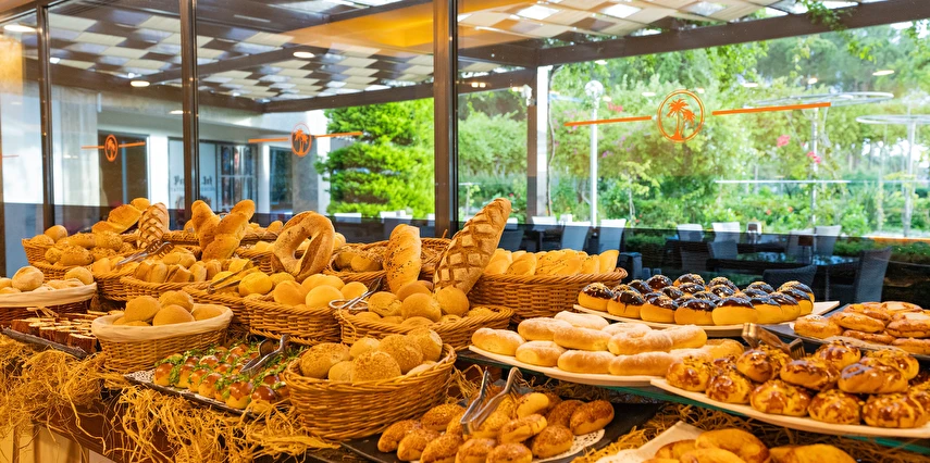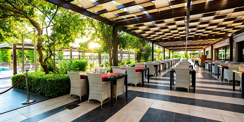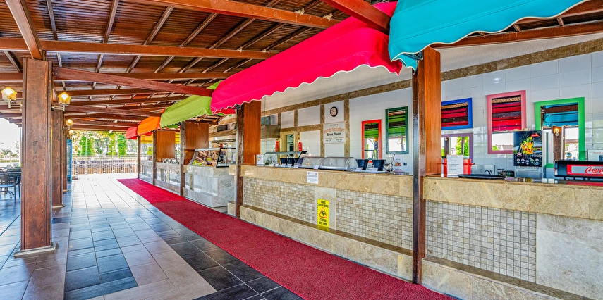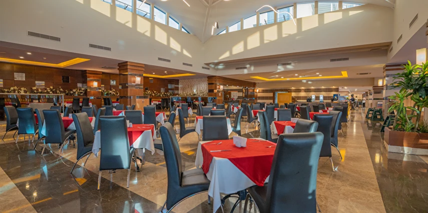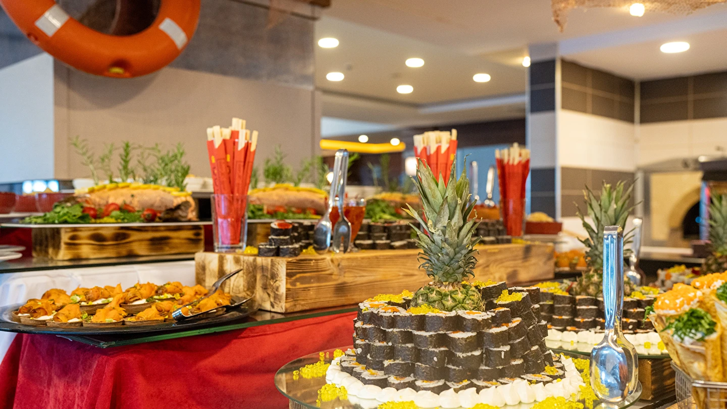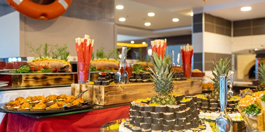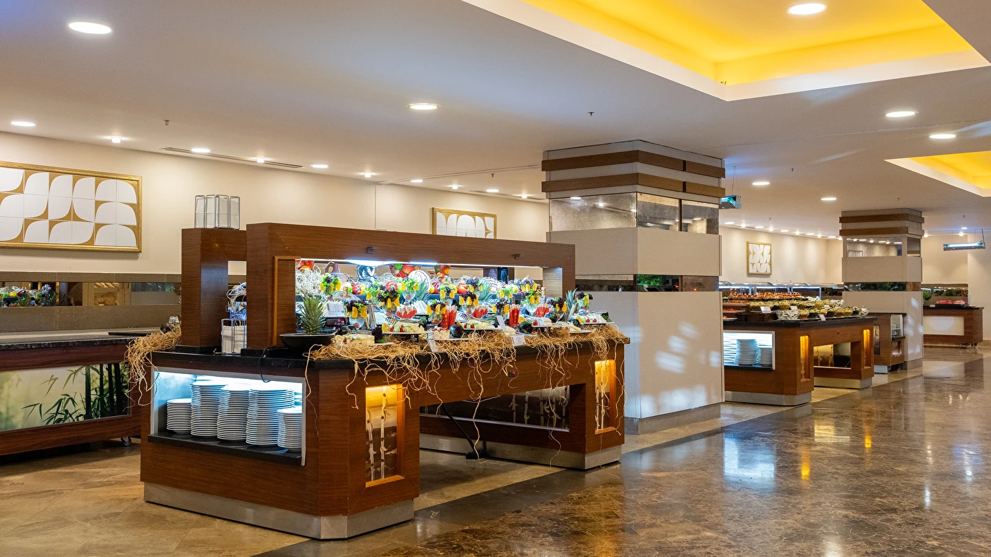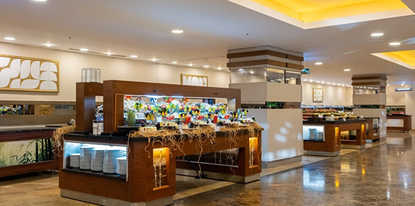 Sabah kahvaltısı, öğle ve akşam yemekleri açık büfe olup, tesisin belirlemiş olduğu markalar dahilinde tüm yerli alkollü (bira, şarap, rakı, votka, cin, bazı likörler) bazı yabancı alkollü içecekler (viski,votka,cin) ve alkolsüz içecekler, sıcak içecekler 24 saat ücretsizdir. Türk kahvesi lobi barda ücretsizdir. Kutu içecekler ve bazı yabancı alkollü içecekler ücretlidir.